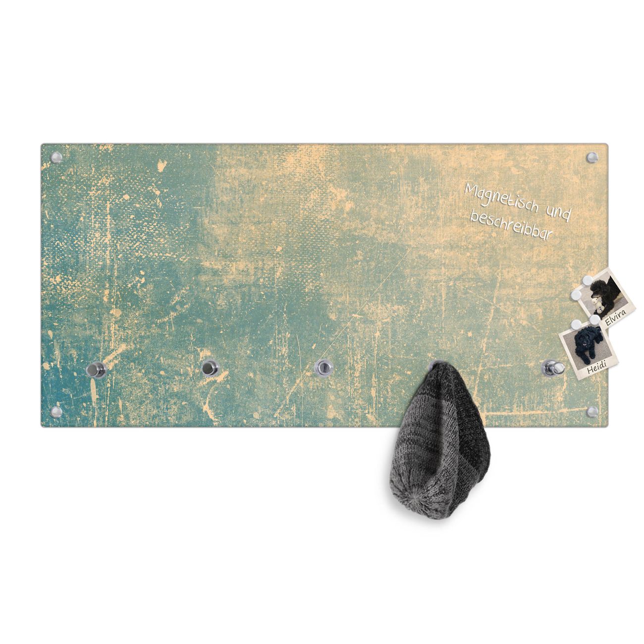 Bitte beachten Sie, dass an dieser Garderobe nur starke Neodym-Magnete halten! FUNKTION: Die banjado Wandgarderobe mit Motiv Patina Grün ist Ihr täglicher Begleiter. Zuverlässig hängen hier Ihre Jacken und Mäntel griffbereit. Gleichzeitig ist die Design Garderobe magnetisch, Sie können Notizen anheften und durch das Echtglas ist Ihr Paneel auch beschreibbar und wieder abwischbar. DESIGN: Sie erhalten eine Garderobenleiste aus elegantem Echtglas mit dem Farbbrillanten Motiv Patina Grün hinterklebt. Das Design ist zeitlos klassisch, ohne dabei auf Funktionalität zu verzichten. Suchen Sie aus einer Vielzahl von Motiven das für Ihre Einrichtung Passende aus. DETAILS: Die Flurgarderobe besteht aus 4mm gehärtetem Sicherheitsglas. Sie ist 80cm breit, 40cm hoch und 6cm tief. Die Garderobenhaken zur Selbstmontage präsentieren sich in Edelstahl-Optik, ebenso die Abstandshalter für die Wandmontage. Ihre neue Garderobe ist sofort einsatzbereit. NUTZEN: Ihre neue Garderobe hält nicht nur zuverlässig Ihre Kleidung, sie ist auch optisch ein Blickfang. Durch die magnetische Wirkung können Sie mit 4 beigefügten extrastarken Neodym-Magneten Notizen anheften und mit wasserlöslichen Kreidestiften oder Whiteboard-Markern auch Nachrichten hinterlassen. BANJADO: Wir sind ein kleines kreatives Team aus Sachsen und entwickeln Produkte die Design und Funktionalität verbinden sollen. Viel Freude mit Ihrer neuen Garderobe wünscht das banjado-Team!