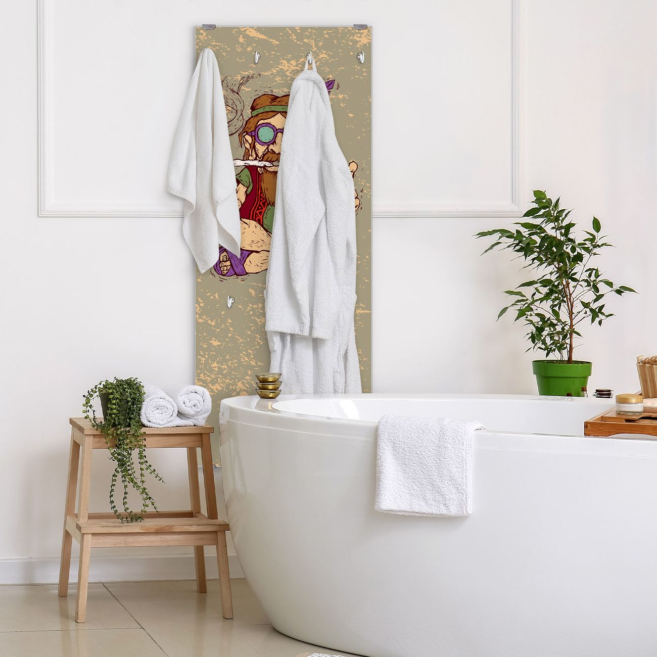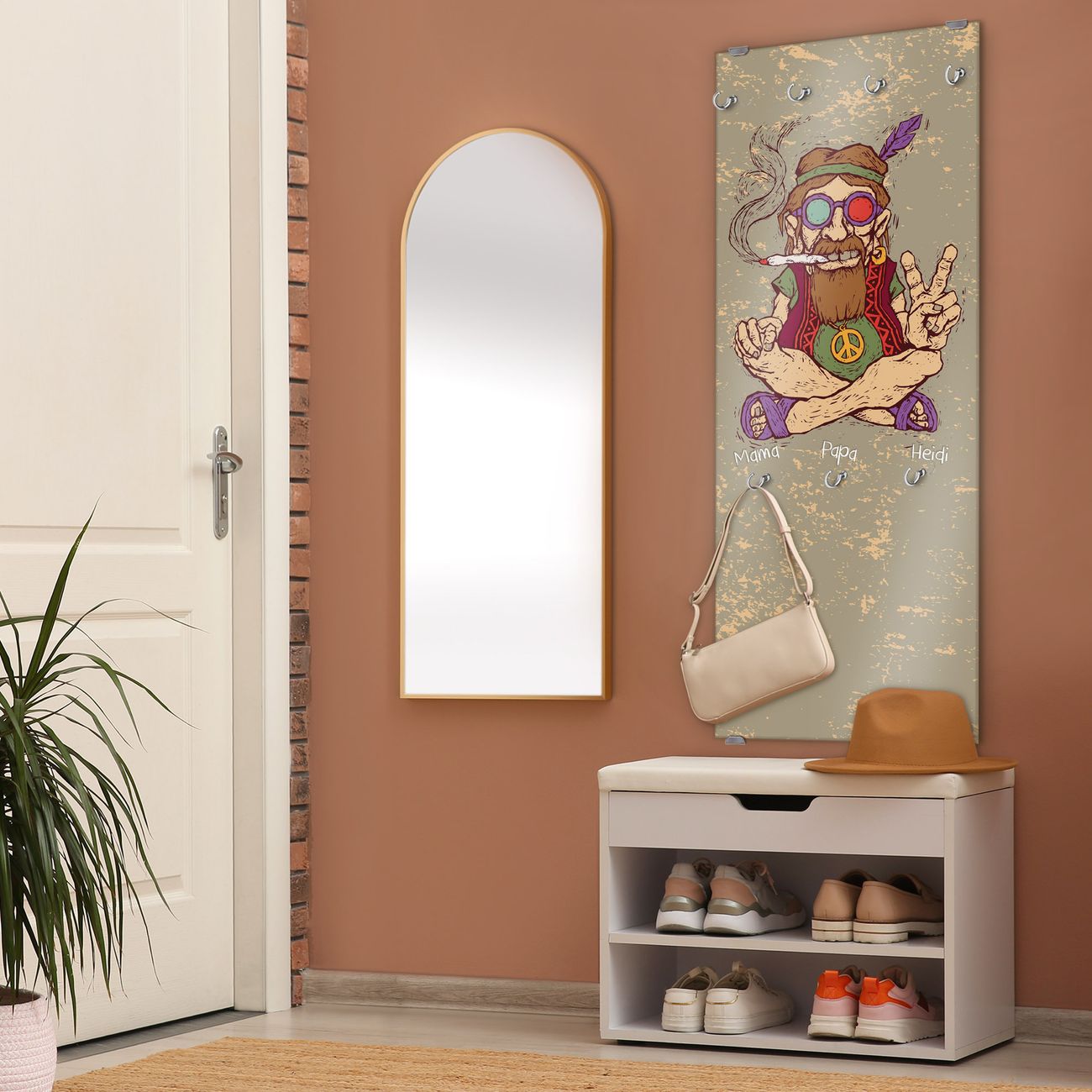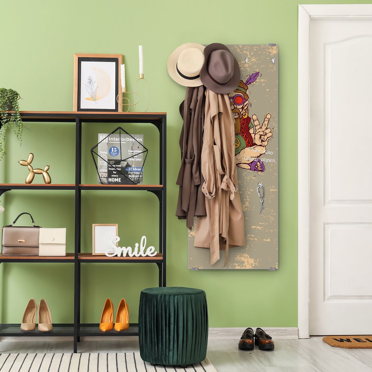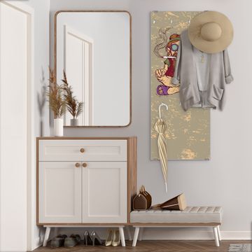 FUNKTION: Die banjado Wandgarderobe mit Motiv Peace ist Ihr täglicher Begleiter. Zuverlässig hängen hier Ihre Jacken und Mäntel griffbereit. Das Echtglas ist Ihr Paneel auch beschreibbar und wieder abwischbar. DESIGN: Sie erhalten eine Garderobenleiste aus elegantem Echtglas mit dem Farbbrillanten Motiv Peace hinterklebt. Das Design ist zeitlos klassisch, ohne dabei auf Funktionalität zu verzichten. Suchen Sie aus einer Vielzahl von Motiven das für Ihre Einrichtung Passende aus. DETAILS: Die Flurgarderobe besteht aus 4mm gehärtetem Sicherheitsglas. Sie ist 50cm breit, 125cm hoch und 6cm tief. Die Garderobenhaken zur Selbstmontage präsentieren sich in Edelstahl-Optik, ebenso die Abstandshalter für die Wandmontage. Ihre neue Garderobe ist sofort einsatzbereit. NUTZEN: Ihre neue Garderobe hält nicht nur zuverlässig Ihre Kleidung, sie ist auch optisch ein Blickfang. Durch das Glas können Sie an der Garderobe mit wasserlöslichen Kreidestiften oder Whiteboard-Markern auch Nachrichten hinterlassen. BANJADO: Wir sind ein kleines kreatives Team aus Sachsen und entwickeln Produkte die Design und Funktionalität verbinden sollen. Viel Freude mit Ihrer neuen Garderobe wünscht das banjado-Team!