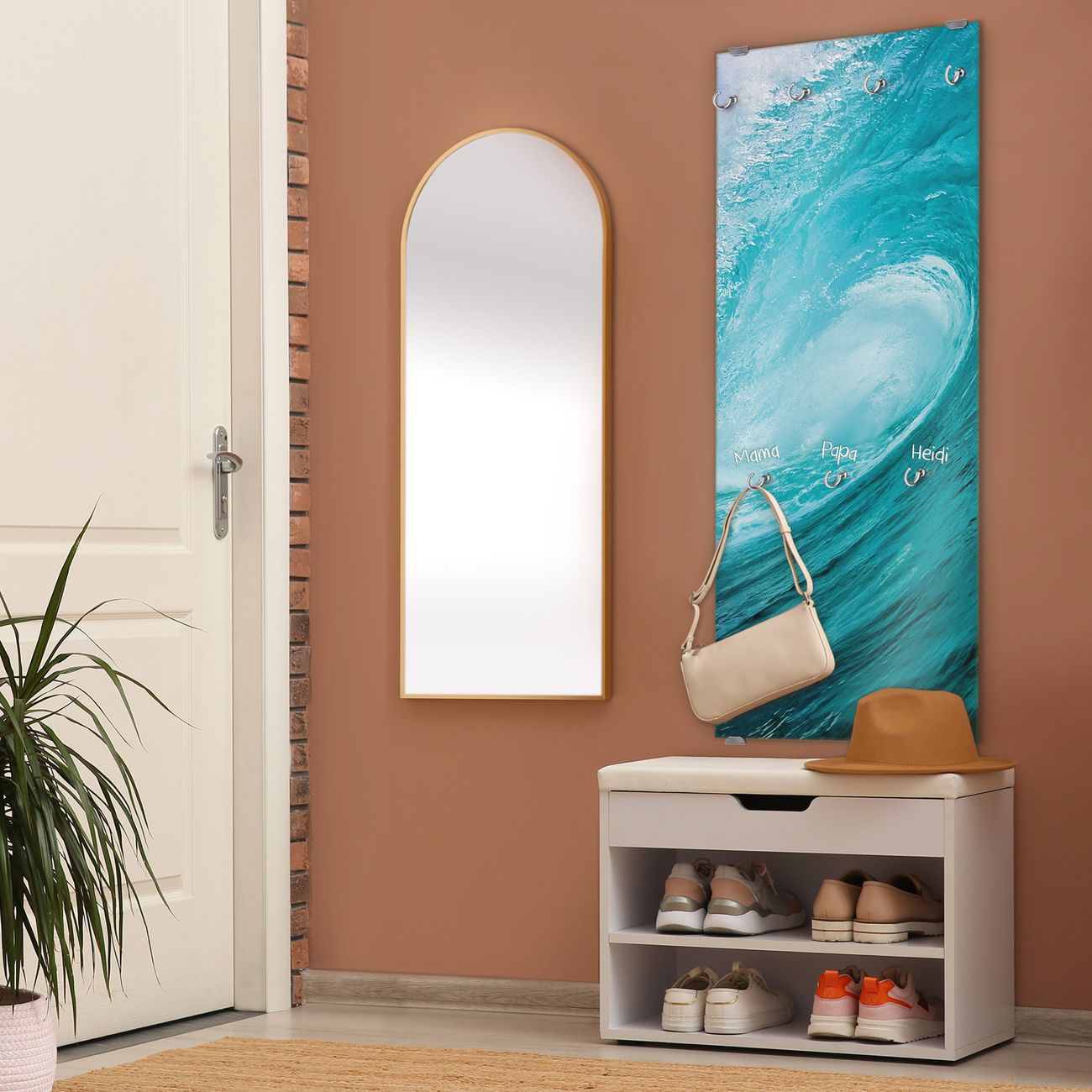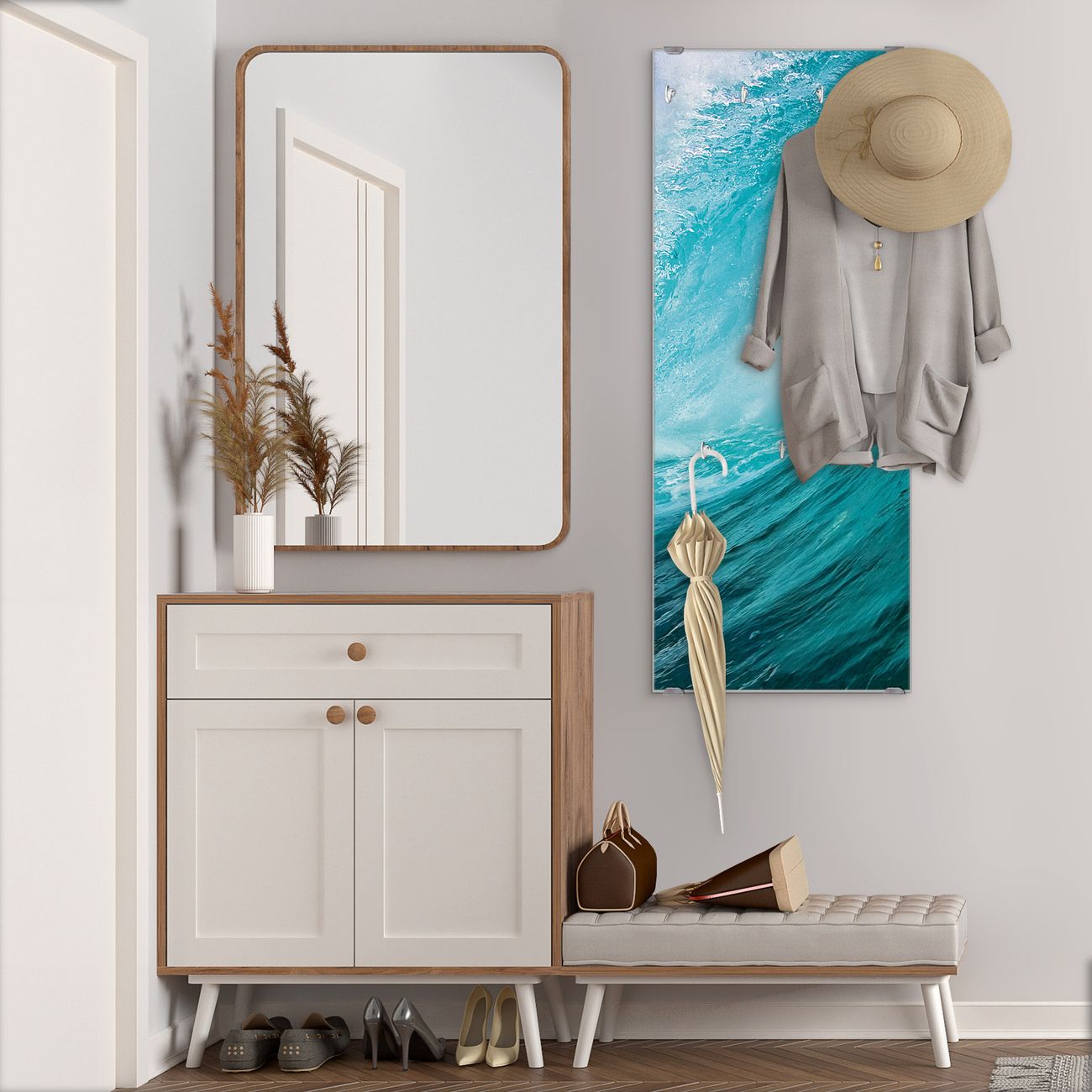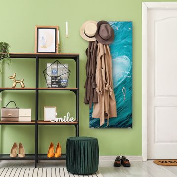FUNKTION: Die banjado Wandgarderobe mit Motiv Perfekte Welle ist Ihr täglicher Begleiter. Zuverlässig hängen hier Ihre Jacken und Mäntel griffbereit. Das Echtglas ist Ihr Paneel auch beschreibbar und wieder abwischbar. DESIGN: Sie erhalten eine Garderobenleiste aus elegantem Echtglas mit dem Farbbrillanten Motiv Perfekte Welle hinterklebt. Das Design ist zeitlos klassisch, ohne dabei auf Funktionalität zu verzichten. Suchen Sie aus einer Vielzahl von Motiven das für Ihre Einrichtung Passende aus. DETAILS: Die Flurgarderobe besteht aus 4mm gehärtetem Sicherheitsglas. Sie ist 50cm breit, 125cm hoch und 6cm tief. Die Garderobenhaken zur Selbstmontage präsentieren sich in Edelstahl-Optik, ebenso die Abstandshalter für die Wandmontage. Ihre neue Garderobe ist sofort einsatzbereit. NUTZEN: Ihre neue Garderobe hält nicht nur zuverlässig Ihre Kleidung, sie ist auch optisch ein Blickfang. Durch das Glas können Sie an der Garderobe mit wasserlöslichen Kreidestiften oder Whiteboard-Markern auch Nachrichten hinterlassen. BANJADO: Wir sind ein kleines kreatives Team aus Sachsen und entwickeln Produkte die Design und Funktionalität verbinden sollen. Viel Freude mit Ihrer neuen Garderobe wünscht das banjado-Team!