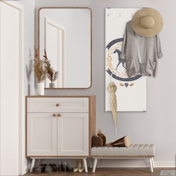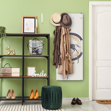 FUNKTION: Die banjado Wandgarderobe mit Motiv Pferd und Vogel ist Ihr täglicher Begleiter. Zuverlässig hängen hier Ihre Jacken und Mäntel griffbereit. Das Echtglas ist Ihr Paneel auch beschreibbar und wieder abwischbar. DESIGN: Sie erhalten eine Garderobenleiste aus elegantem Echtglas mit dem Farbbrillanten Motiv Pferd und Vogel hinterklebt. Das Design ist zeitlos klassisch, ohne dabei auf Funktionalität zu verzichten. Suchen Sie aus einer Vielzahl von Motiven das für Ihre Einrichtung Passende aus. DETAILS: Die Flurgarderobe besteht aus 4mm gehärtetem Sicherheitsglas. Sie ist 50cm breit, 125cm hoch und 6cm tief. Die Garderobenhaken zur Selbstmontage präsentieren sich in Edelstahl-Optik, ebenso die Abstandshalter für die Wandmontage. Ihre neue Garderobe ist sofort einsatzbereit. NUTZEN: Ihre neue Garderobe hält nicht nur zuverlässig Ihre Kleidung, sie ist auch optisch ein Blickfang. Durch das Glas können Sie an der Garderobe mit wasserlöslichen Kreidestiften oder Whiteboard-Markern auch Nachrichten hinterlassen. BANJADO: Wir sind ein kleines kreatives Team aus Sachsen und entwickeln Produkte die Design und Funktionalität verbinden sollen. Viel Freude mit Ihrer neuen Garderobe wünscht das banjado-Team!