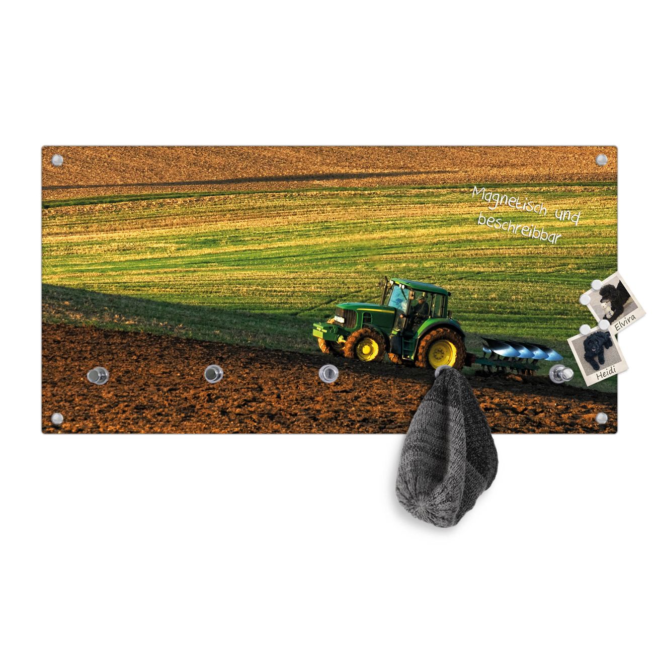 Bitte beachten Sie, dass an dieser Garderobe nur starke Neodym-Magnete halten! FUNKTION: Die banjado Wandgarderobe mit Motiv Pflügen ist Ihr täglicher Begleiter. Zuverlässig hängen hier Ihre Jacken und Mäntel griffbereit. Gleichzeitig ist die Design Garderobe magnetisch, Sie können Notizen anheften und durch das Echtglas ist Ihr Paneel auch beschreibbar und wieder abwischbar. DESIGN: Sie erhalten eine Garderobenleiste aus elegantem Echtglas mit dem Farbbrillanten Motiv Pflügen hinterklebt. Das Design ist zeitlos klassisch, ohne dabei auf Funktionalität zu verzichten. Suchen Sie aus einer Vielzahl von Motiven das für Ihre Einrichtung Passende aus. DETAILS: Die Flurgarderobe besteht aus 4mm gehärtetem Sicherheitsglas. Sie ist 80cm breit, 40cm hoch und 6cm tief. Die Garderobenhaken zur Selbstmontage präsentieren sich in Edelstahl-Optik, ebenso die Abstandshalter für die Wandmontage. Ihre neue Garderobe ist sofort einsatzbereit. NUTZEN: Ihre neue Garderobe hält nicht nur zuverlässig Ihre Kleidung, sie ist auch optisch ein Blickfang. Durch die magnetische Wirkung können Sie mit 4 beigefügten extrastarken Neodym-Magneten Notizen anheften und mit wasserlöslichen Kreidestiften oder Whiteboard-Markern auch Nachrichten hinterlassen. BANJADO: Wir sind ein kleines kreatives Team aus Sachsen und entwickeln Produkte die Design und Funktionalität verbinden sollen. Viel Freude mit Ihrer neuen Garderobe wünscht das banjado-Team!