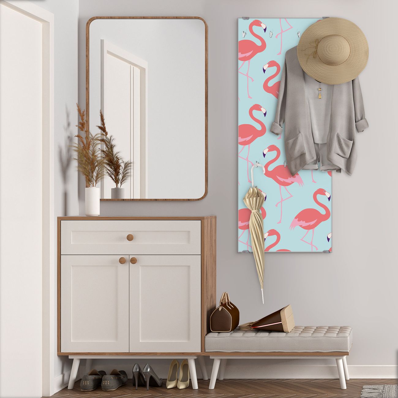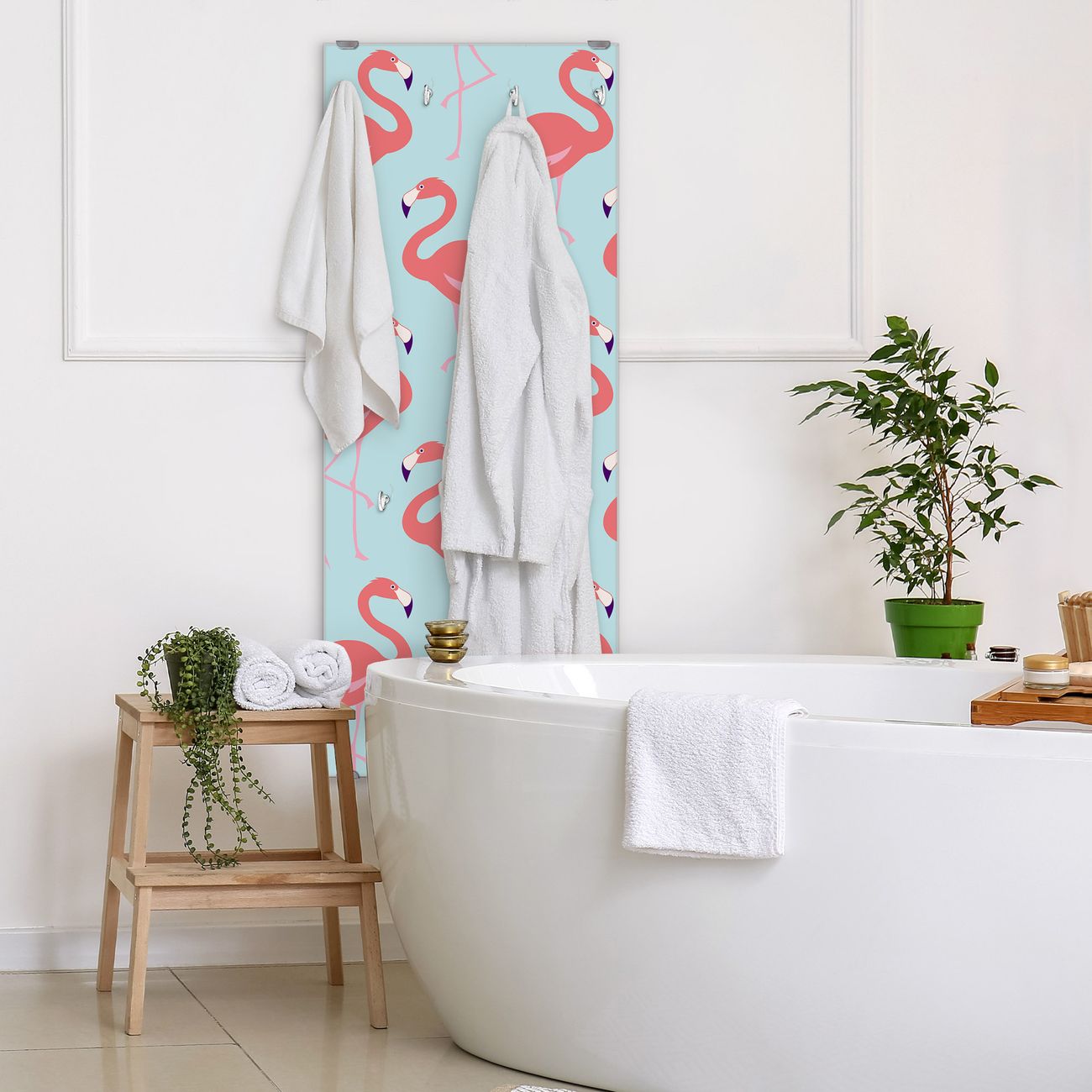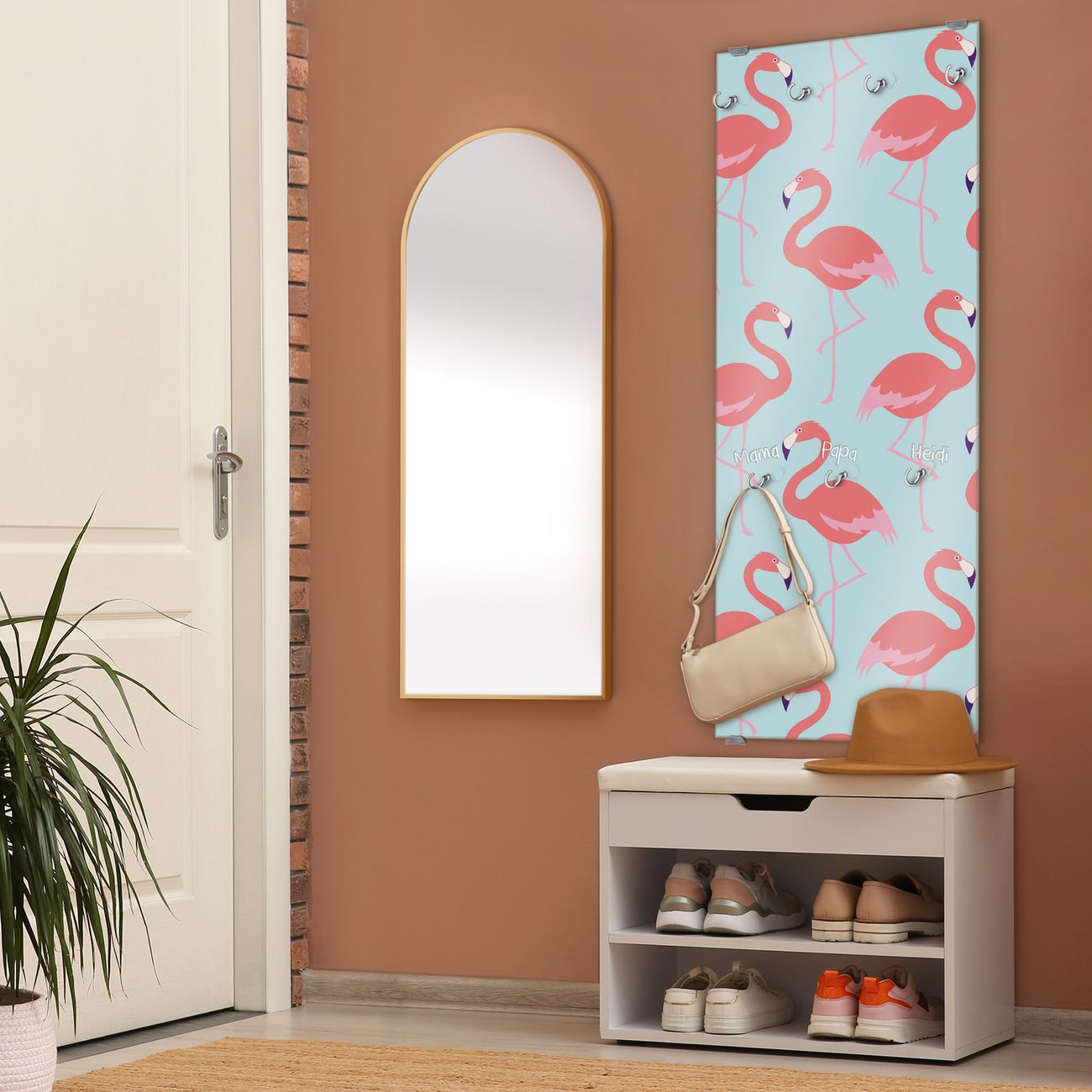 FUNKTION: Die banjado Wandgarderobe mit Motiv Pink Tango ist Ihr täglicher Begleiter. Zuverlässig hängen hier Ihre Jacken und Mäntel griffbereit. Das Echtglas ist Ihr Paneel auch beschreibbar und wieder abwischbar. DESIGN: Sie erhalten eine Garderobenleiste aus elegantem Echtglas mit dem Farbbrillanten Motiv Pink Tango hinterklebt. Das Design ist zeitlos klassisch, ohne dabei auf Funktionalität zu verzichten. Suchen Sie aus einer Vielzahl von Motiven das für Ihre Einrichtung Passende aus. DETAILS: Die Flurgarderobe besteht aus 4mm gehärtetem Sicherheitsglas. Sie ist 50cm breit, 125cm hoch und 6cm tief. Die Garderobenhaken zur Selbstmontage präsentieren sich in Edelstahl-Optik, ebenso die Abstandshalter für die Wandmontage. Ihre neue Garderobe ist sofort einsatzbereit. NUTZEN: Ihre neue Garderobe hält nicht nur zuverlässig Ihre Kleidung, sie ist auch optisch ein Blickfang. Durch das Glas können Sie an der Garderobe mit wasserlöslichen Kreidestiften oder Whiteboard-Markern auch Nachrichten hinterlassen. BANJADO: Wir sind ein kleines kreatives Team aus Sachsen und entwickeln Produkte die Design und Funktionalität verbinden sollen. Viel Freude mit Ihrer neuen Garderobe wünscht das banjado-Team!