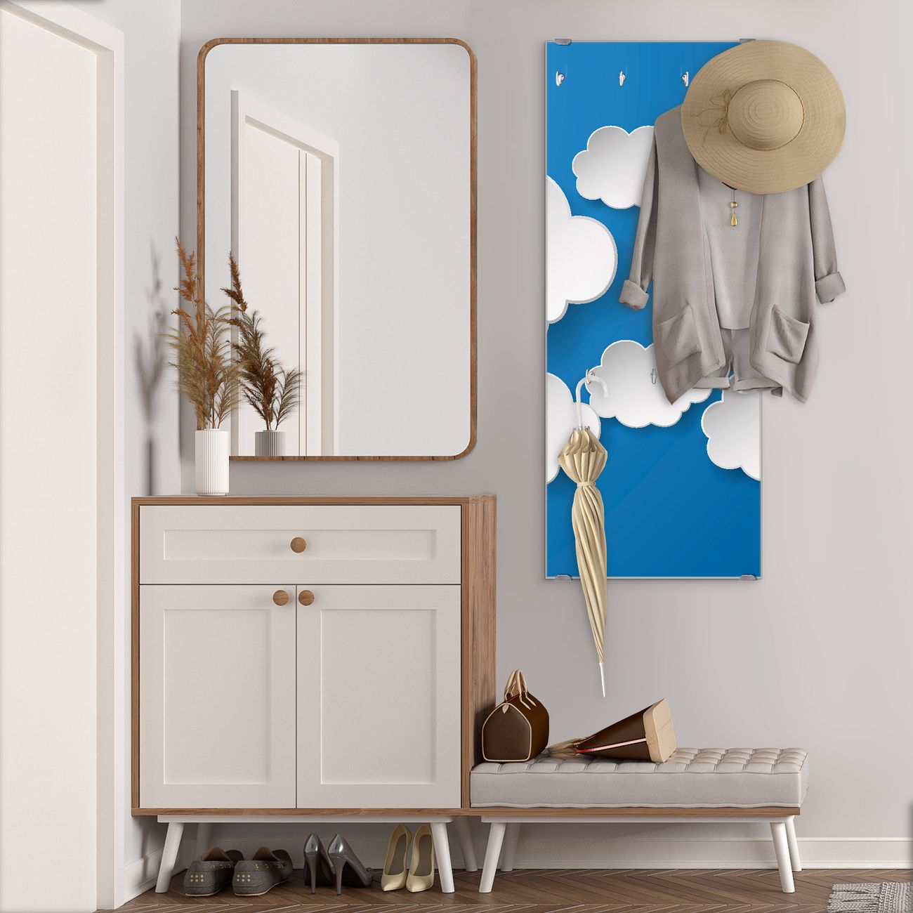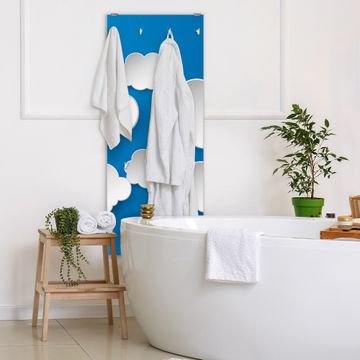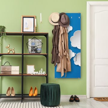 FUNKTION: Die banjado Wandgarderobe mit Motiv Plastische Wolken ist Ihr täglicher Begleiter. Zuverlässig hängen hier Ihre Jacken und Mäntel griffbereit. Das Echtglas ist Ihr Paneel auch beschreibbar und wieder abwischbar. DESIGN: Sie erhalten eine Garderobenleiste aus elegantem Echtglas mit dem Farbbrillanten Motiv Plastische Wolken hinterklebt. Das Design ist zeitlos klassisch, ohne dabei auf Funktionalität zu verzichten. Suchen Sie aus einer Vielzahl von Motiven das für Ihre Einrichtung Passende aus. DETAILS: Die Flurgarderobe besteht aus 4mm gehärtetem Sicherheitsglas. Sie ist 50cm breit, 125cm hoch und 6cm tief. Die Garderobenhaken zur Selbstmontage präsentieren sich in Edelstahl-Optik, ebenso die Abstandshalter für die Wandmontage. Ihre neue Garderobe ist sofort einsatzbereit. NUTZEN: Ihre neue Garderobe hält nicht nur zuverlässig Ihre Kleidung, sie ist auch optisch ein Blickfang. Durch das Glas können Sie an der Garderobe mit wasserlöslichen Kreidestiften oder Whiteboard-Markern auch Nachrichten hinterlassen. BANJADO: Wir sind ein kleines kreatives Team aus Sachsen und entwickeln Produkte die Design und Funktionalität verbinden sollen. Viel Freude mit Ihrer neuen Garderobe wünscht das banjado-Team!