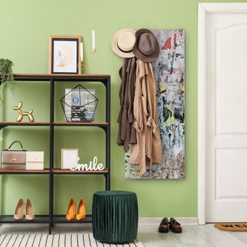FUNKTION: Die banjado Wandgarderobe mit Motiv Posterwand ist Ihr täglicher Begleiter. Zuverlässig hängen hier Ihre Jacken und Mäntel griffbereit. Das Echtglas ist Ihr Paneel auch beschreibbar und wieder abwischbar. DESIGN: Sie erhalten eine Garderobenleiste aus elegantem Echtglas mit dem Farbbrillanten Motiv Posterwand hinterklebt. Das Design ist zeitlos klassisch, ohne dabei auf Funktionalität zu verzichten. Suchen Sie aus einer Vielzahl von Motiven das für Ihre Einrichtung Passende aus. DETAILS: Die Flurgarderobe besteht aus 4mm gehärtetem Sicherheitsglas. Sie ist 50cm breit, 125cm hoch und 6cm tief. Die Garderobenhaken zur Selbstmontage präsentieren sich in Edelstahl-Optik, ebenso die Abstandshalter für die Wandmontage. Ihre neue Garderobe ist sofort einsatzbereit. NUTZEN: Ihre neue Garderobe hält nicht nur zuverlässig Ihre Kleidung, sie ist auch optisch ein Blickfang. Durch das Glas können Sie an der Garderobe mit wasserlöslichen Kreidestiften oder Whiteboard-Markern auch Nachrichten hinterlassen. BANJADO: Wir sind ein kleines kreatives Team aus Sachsen und entwickeln Produkte die Design und Funktionalität verbinden sollen. Viel Freude mit Ihrer neuen Garderobe wünscht das banjado-Team!