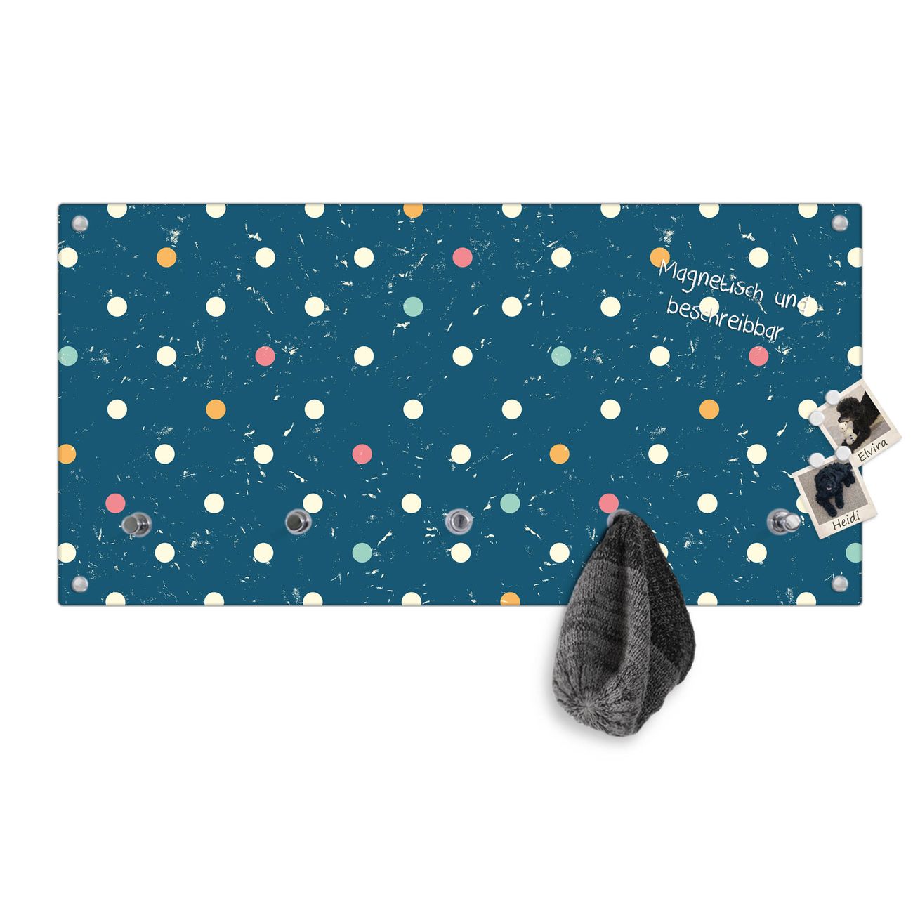 Bitte beachten Sie, dass an dieser Garderobe nur starke Neodym-Magnete halten! FUNKTION: Die banjado Wandgarderobe mit Motiv Punkte auf Blau ist Ihr täglicher Begleiter. Zuverlässig hängen hier Ihre Jacken und Mäntel griffbereit. Gleichzeitig ist die Design Garderobe magnetisch, Sie können Notizen anheften und durch das Echtglas ist Ihr Paneel auch beschreibbar und wieder abwischbar. DESIGN: Sie erhalten eine Garderobenleiste aus elegantem Echtglas mit dem Farbbrillanten Motiv Punkte auf Blau hinterklebt. Das Design ist zeitlos klassisch, ohne dabei auf Funktionalität zu verzichten. Suchen Sie aus einer Vielzahl von Motiven das für Ihre Einrichtung Passende aus. DETAILS: Die Flurgarderobe besteht aus 4mm gehärtetem Sicherheitsglas. Sie ist 80cm breit, 40cm hoch und 6cm tief. Die Garderobenhaken zur Selbstmontage präsentieren sich in Edelstahl-Optik, ebenso die Abstandshalter für die Wandmontage. Ihre neue Garderobe ist sofort einsatzbereit. NUTZEN: Ihre neue Garderobe hält nicht nur zuverlässig Ihre Kleidung, sie ist auch optisch ein Blickfang. Durch die magnetische Wirkung können Sie mit 4 beigefügten extrastarken Neodym-Magneten Notizen anheften und mit wasserlöslichen Kreidestiften oder Whiteboard-Markern auch Nachrichten hinterlassen. BANJADO: Wir sind ein kleines kreatives Team aus Sachsen und entwickeln Produkte die Design und Funktionalität verbinden sollen. Viel Freude mit Ihrer neuen Garderobe wünscht das banjado-Team!