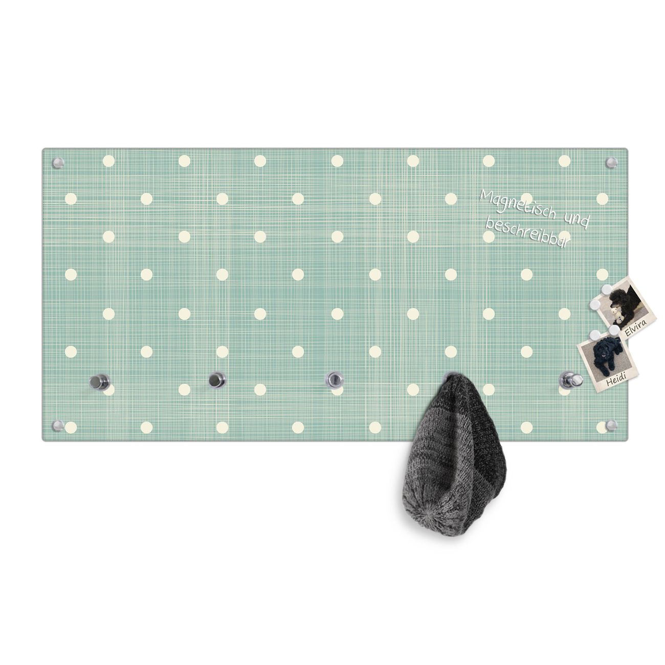 Bitte beachten Sie, dass an dieser Garderobe nur starke Neodym-Magnete halten! FUNKTION: Die banjado Wandgarderobe mit Motiv Punkte Lindgrün ist Ihr täglicher Begleiter. Zuverlässig hängen hier Ihre Jacken und Mäntel griffbereit. Gleichzeitig ist die Design Garderobe magnetisch, Sie können Notizen anheften und durch das Echtglas ist Ihr Paneel auch beschreibbar und wieder abwischbar. DESIGN: Sie erhalten eine Garderobenleiste aus elegantem Echtglas mit dem Farbbrillanten Motiv Punkte Lindgrün hinterklebt. Das Design ist zeitlos klassisch, ohne dabei auf Funktionalität zu verzichten. Suchen Sie aus einer Vielzahl von Motiven das für Ihre Einrichtung Passende aus. DETAILS: Die Flurgarderobe besteht aus 4mm gehärtetem Sicherheitsglas. Sie ist 80cm breit, 40cm hoch und 6cm tief. Die Garderobenhaken zur Selbstmontage präsentieren sich in Edelstahl-Optik, ebenso die Abstandshalter für die Wandmontage. Ihre neue Garderobe ist sofort einsatzbereit. NUTZEN: Ihre neue Garderobe hält nicht nur zuverlässig Ihre Kleidung, sie ist auch optisch ein Blickfang. Durch die magnetische Wirkung können Sie mit 4 beigefügten extrastarken Neodym-Magneten Notizen anheften und mit wasserlöslichen Kreidestiften oder Whiteboard-Markern auch Nachrichten hinterlassen. BANJADO: Wir sind ein kleines kreatives Team aus Sachsen und entwickeln Produkte die Design und Funktionalität verbinden sollen. Viel Freude mit Ihrer neuen Garderobe wünscht das banjado-Team!