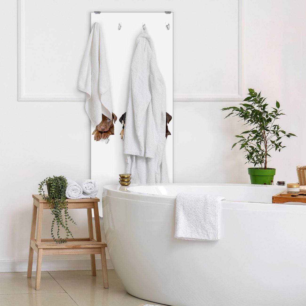 FUNKTION: Die banjado Wandgarderobe mit Motiv Puppies ist Ihr täglicher Begleiter. Zuverlässig hängen hier Ihre Jacken und Mäntel griffbereit. Das Echtglas ist Ihr Paneel auch beschreibbar und wieder abwischbar. DESIGN: Sie erhalten eine Garderobenleiste aus elegantem Echtglas mit dem Farbbrillanten Motiv Puppies hinterklebt. Das Design ist zeitlos klassisch, ohne dabei auf Funktionalität zu verzichten. Suchen Sie aus einer Vielzahl von Motiven das für Ihre Einrichtung Passende aus. DETAILS: Die Flurgarderobe besteht aus 4mm gehärtetem Sicherheitsglas. Sie ist 50cm breit, 125cm hoch und 6cm tief. Die Garderobenhaken zur Selbstmontage präsentieren sich in Edelstahl-Optik, ebenso die Abstandshalter für die Wandmontage. Ihre neue Garderobe ist sofort einsatzbereit. NUTZEN: Ihre neue Garderobe hält nicht nur zuverlässig Ihre Kleidung, sie ist auch optisch ein Blickfang. Durch das Glas können Sie an der Garderobe mit wasserlöslichen Kreidestiften oder Whiteboard-Markern auch Nachrichten hinterlassen. BANJADO: Wir sind ein kleines kreatives Team aus Sachsen und entwickeln Produkte die Design und Funktionalität verbinden sollen. Viel Freude mit Ihrer neuen Garderobe wünscht das banjado-Team!