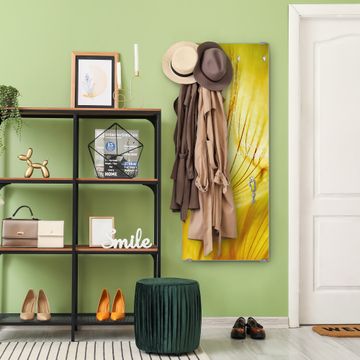 FUNKTION: Die banjado Wandgarderobe mit Motiv Pusteblumen Gold ist Ihr täglicher Begleiter. Zuverlässig hängen hier Ihre Jacken und Mäntel griffbereit. Das Echtglas ist Ihr Paneel auch beschreibbar und wieder abwischbar. DESIGN: Sie erhalten eine Garderobenleiste aus elegantem Echtglas mit dem Farbbrillanten Motiv Pusteblumen Gold hinterklebt. Das Design ist zeitlos klassisch, ohne dabei auf Funktionalität zu verzichten. Suchen Sie aus einer Vielzahl von Motiven das für Ihre Einrichtung Passende aus. DETAILS: Die Flurgarderobe besteht aus 4mm gehärtetem Sicherheitsglas. Sie ist 50cm breit, 125cm hoch und 6cm tief. Die Garderobenhaken zur Selbstmontage präsentieren sich in Edelstahl-Optik, ebenso die Abstandshalter für die Wandmontage. Ihre neue Garderobe ist sofort einsatzbereit. NUTZEN: Ihre neue Garderobe hält nicht nur zuverlässig Ihre Kleidung, sie ist auch optisch ein Blickfang. Durch das Glas können Sie an der Garderobe mit wasserlöslichen Kreidestiften oder Whiteboard-Markern auch Nachrichten hinterlassen. BANJADO: Wir sind ein kleines kreatives Team aus Sachsen und entwickeln Produkte die Design und Funktionalität verbinden sollen. Viel Freude mit Ihrer neuen Garderobe wünscht das banjado-Team!