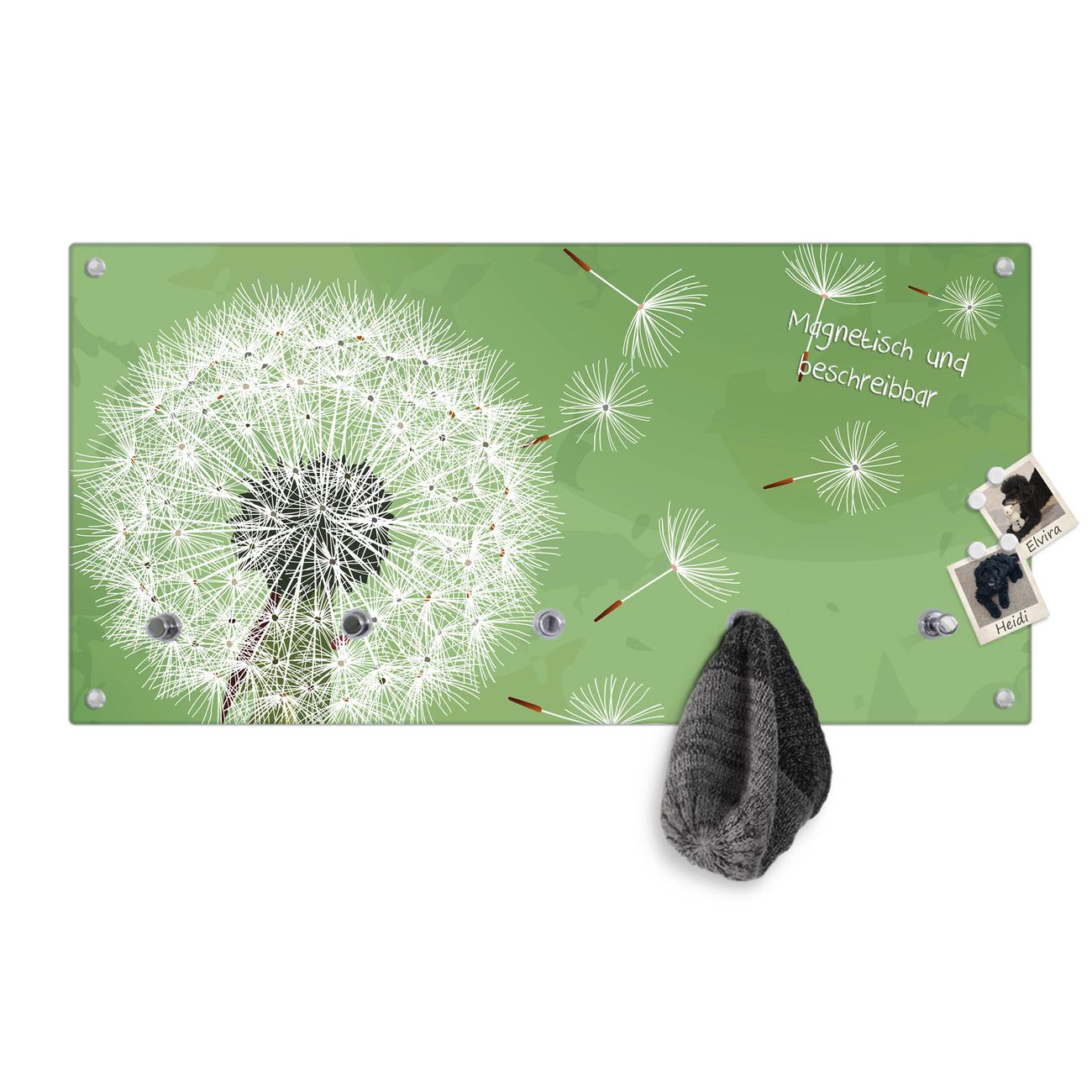 Bitte beachten Sie, dass an dieser Garderobe nur starke Neodym-Magnete halten! FUNKTION: Die banjado Wandgarderobe mit Motiv Pusteblume 3 ist Ihr täglicher Begleiter. Zuverlässig hängen hier Ihre Jacken und Mäntel griffbereit. Gleichzeitig ist die Design Garderobe magnetisch, Sie können Notizen anheften und durch das Echtglas ist Ihr Paneel auch beschreibbar und wieder abwischbar. DESIGN: Sie erhalten eine Garderobenleiste aus elegantem Echtglas mit dem Farbbrillanten Motiv Pusteblume 3 hinterklebt. Das Design ist zeitlos klassisch, ohne dabei auf Funktionalität zu verzichten. Suchen Sie aus einer Vielzahl von Motiven das für Ihre Einrichtung Passende aus. DETAILS: Die Flurgarderobe besteht aus 4mm gehärtetem Sicherheitsglas. Sie ist 80cm breit, 40cm hoch und 6cm tief. Die Garderobenhaken zur Selbstmontage präsentieren sich in Edelstahl-Optik, ebenso die Abstandshalter für die Wandmontage. Ihre neue Garderobe ist sofort einsatzbereit. NUTZEN: Ihre neue Garderobe hält nicht nur zuverlässig Ihre Kleidung, sie ist auch optisch ein Blickfang. Durch die magnetische Wirkung können Sie mit 4 beigefügten extrastarken Neodym-Magneten Notizen anheften und mit wasserlöslichen Kreidestiften oder Whiteboard-Markern auch Nachrichten hinterlassen. BANJADO: Wir sind ein kleines kreatives Team aus Sachsen und entwickeln Produkte die Design und Funktionalität verbinden sollen. Viel Freude mit Ihrer neuen Garderobe wünscht das banjado-Team!