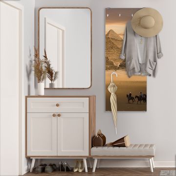 FUNKTION: Die banjado Wandgarderobe mit Motiv Pyramiden ist Ihr täglicher Begleiter. Zuverlässig hängen hier Ihre Jacken und Mäntel griffbereit. Das Echtglas ist Ihr Paneel auch beschreibbar und wieder abwischbar. DESIGN: Sie erhalten eine Garderobenleiste aus elegantem Echtglas mit dem Farbbrillanten Motiv Pyramiden hinterklebt. Das Design ist zeitlos klassisch, ohne dabei auf Funktionalität zu verzichten. Suchen Sie aus einer Vielzahl von Motiven das für Ihre Einrichtung Passende aus. DETAILS: Die Flurgarderobe besteht aus 4mm gehärtetem Sicherheitsglas. Sie ist 50cm breit, 125cm hoch und 6cm tief. Die Garderobenhaken zur Selbstmontage präsentieren sich in Edelstahl-Optik, ebenso die Abstandshalter für die Wandmontage. Ihre neue Garderobe ist sofort einsatzbereit. NUTZEN: Ihre neue Garderobe hält nicht nur zuverlässig Ihre Kleidung, sie ist auch optisch ein Blickfang. Durch das Glas können Sie an der Garderobe mit wasserlöslichen Kreidestiften oder Whiteboard-Markern auch Nachrichten hinterlassen. BANJADO: Wir sind ein kleines kreatives Team aus Sachsen und entwickeln Produkte die Design und Funktionalität verbinden sollen. Viel Freude mit Ihrer neuen Garderobe wünscht das banjado-Team!