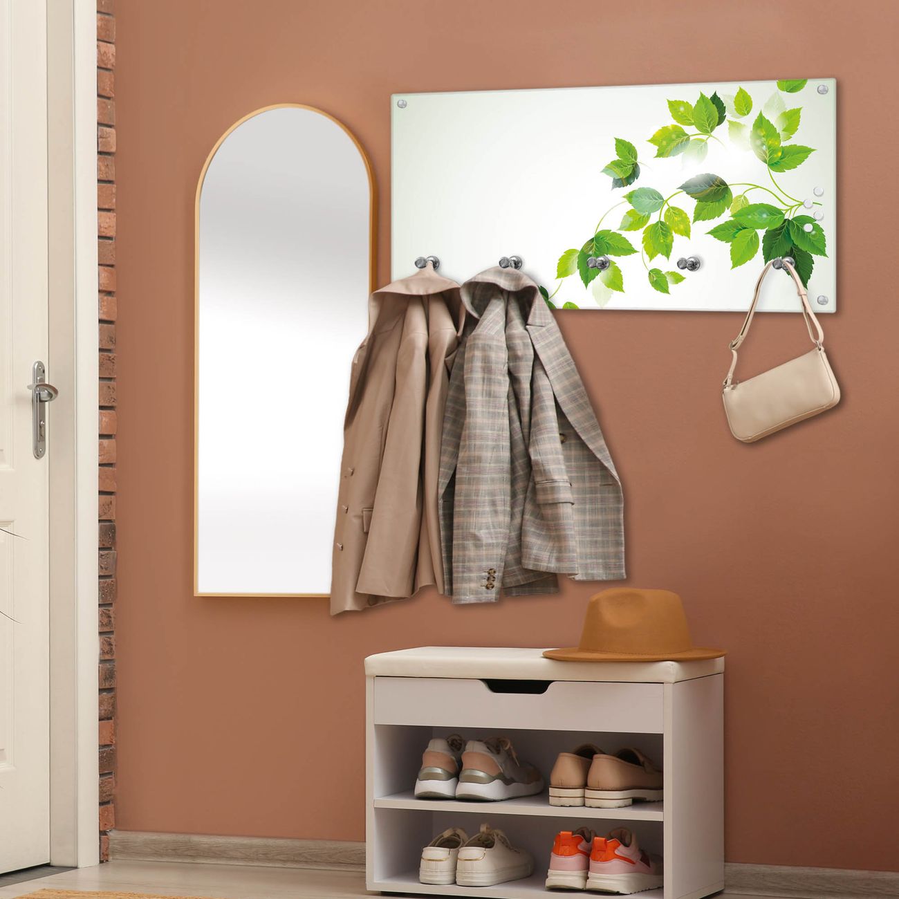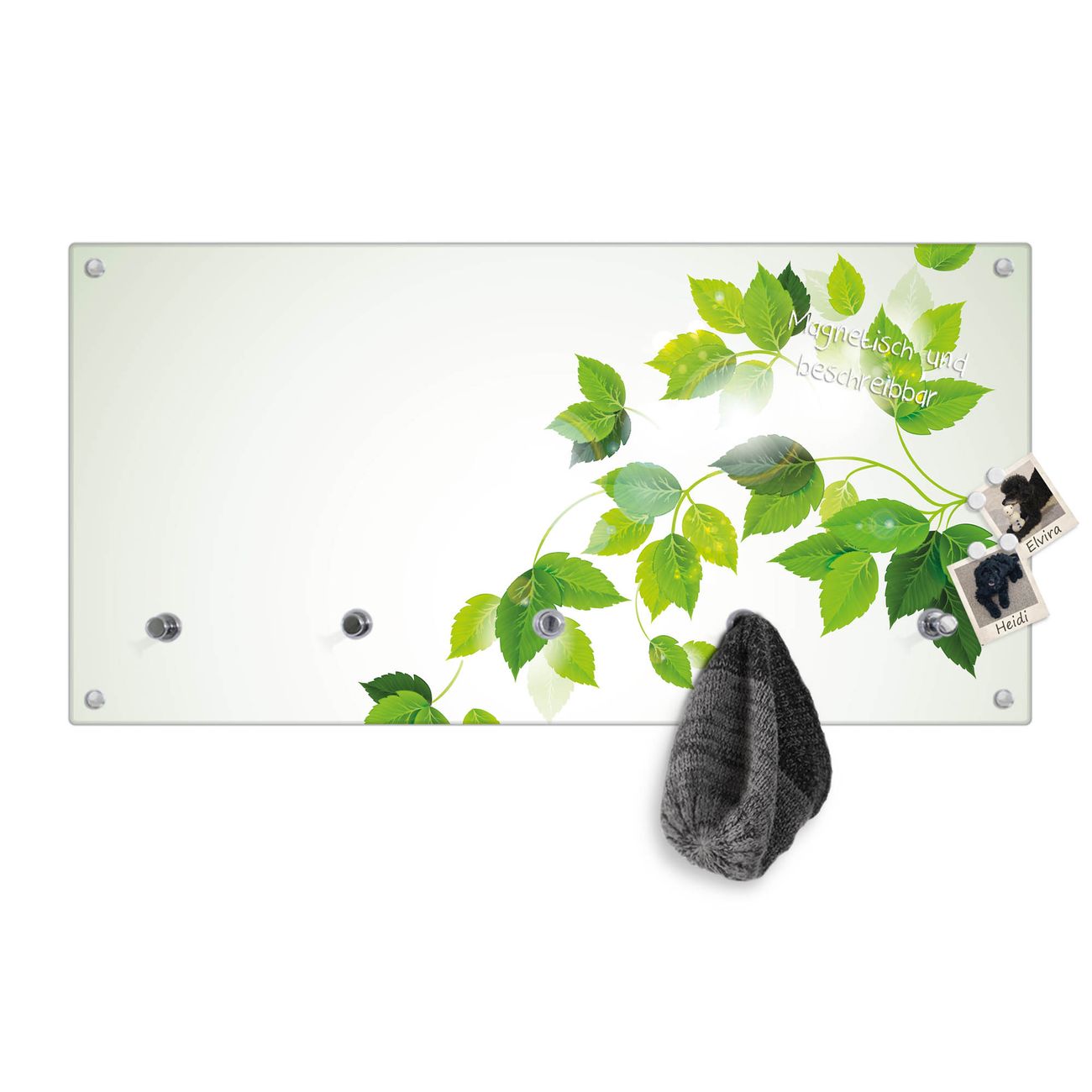 Bitte beachten Sie, dass an dieser Garderobe nur starke Neodym-Magnete halten! FUNKTION: Die banjado Wandgarderobe mit Motiv Ranke Gelb Weiß ist Ihr täglicher Begleiter. Zuverlässig hängen hier Ihre Jacken und Mäntel griffbereit. Gleichzeitig ist die Design Garderobe magnetisch, Sie können Notizen anheften und durch das Echtglas ist Ihr Paneel auch beschreibbar und wieder abwischbar. DESIGN: Sie erhalten eine Garderobenleiste aus elegantem Echtglas mit dem Farbbrillanten Motiv Ranke Gelb Weiß hinterklebt. Das Design ist zeitlos klassisch, ohne dabei auf Funktionalität zu verzichten. Suchen Sie aus einer Vielzahl von Motiven das für Ihre Einrichtung Passende aus. DETAILS: Die Flurgarderobe besteht aus 4mm gehärtetem Sicherheitsglas. Sie ist 80cm breit, 40cm hoch und 6cm tief. Die Garderobenhaken zur Selbstmontage präsentieren sich in Edelstahl-Optik, ebenso die Abstandshalter für die Wandmontage. Ihre neue Garderobe ist sofort einsatzbereit. NUTZEN: Ihre neue Garderobe hält nicht nur zuverlässig Ihre Kleidung, sie ist auch optisch ein Blickfang. Durch die magnetische Wirkung können Sie mit 4 beigefügten extrastarken Neodym-Magneten Notizen anheften und mit wasserlöslichen Kreidestiften oder Whiteboard-Markern auch Nachrichten hinterlassen. BANJADO: Wir sind ein kleines kreatives Team aus Sachsen und entwickeln Produkte die Design und Funktionalität verbinden sollen. Viel Freude mit Ihrer neuen Garderobe wünscht das banjado-Team!