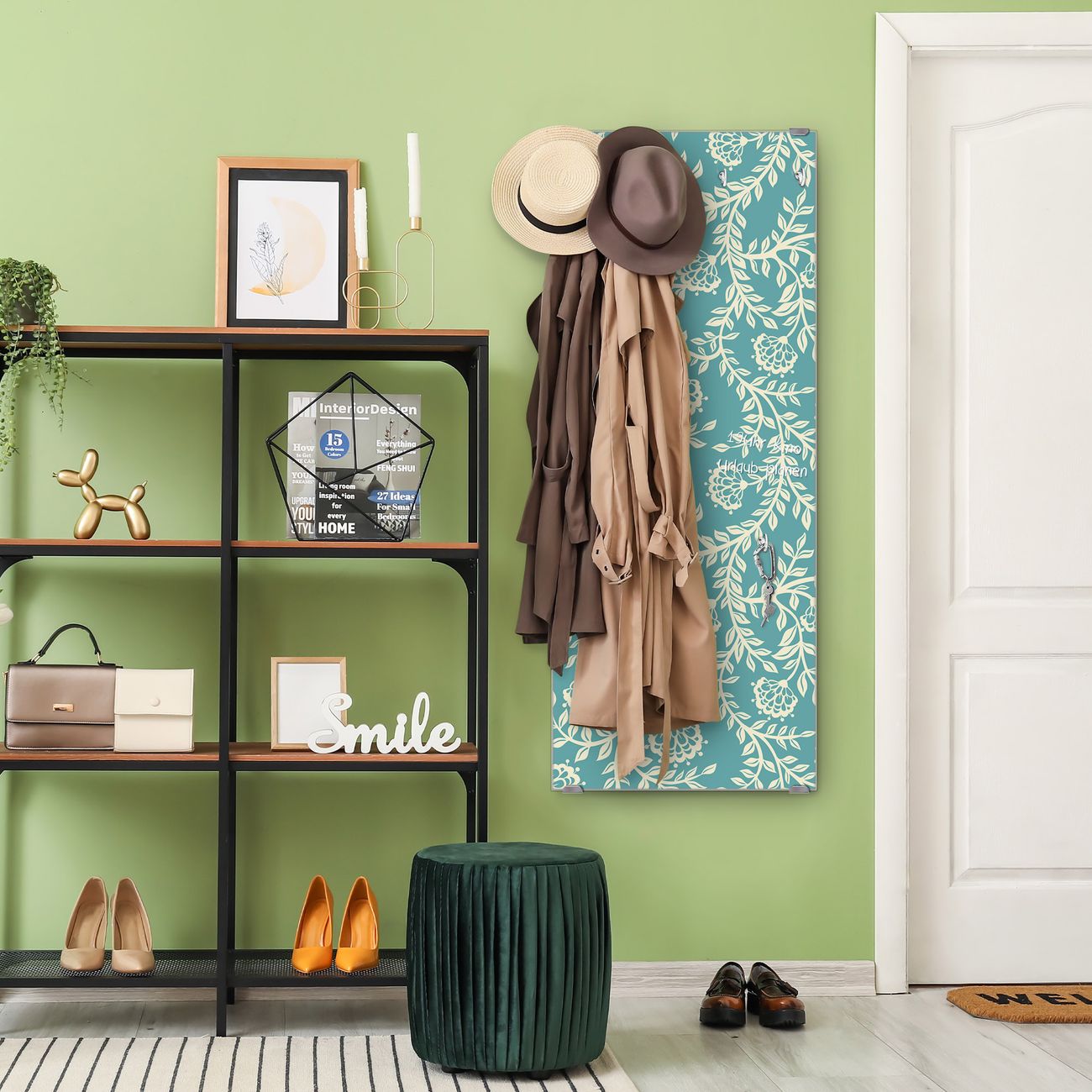 FUNKTION: Die banjado Wandgarderobe mit Motiv Rankenornament ist Ihr täglicher Begleiter. Zuverlässig hängen hier Ihre Jacken und Mäntel griffbereit. Das Echtglas ist Ihr Paneel auch beschreibbar und wieder abwischbar. DESIGN: Sie erhalten eine Garderobenleiste aus elegantem Echtglas mit dem Farbbrillanten Motiv Rankenornament hinterklebt. Das Design ist zeitlos klassisch, ohne dabei auf Funktionalität zu verzichten. Suchen Sie aus einer Vielzahl von Motiven das für Ihre Einrichtung Passende aus. DETAILS: Die Flurgarderobe besteht aus 4mm gehärtetem Sicherheitsglas. Sie ist 50cm breit, 125cm hoch und 6cm tief. Die Garderobenhaken zur Selbstmontage präsentieren sich in Edelstahl-Optik, ebenso die Abstandshalter für die Wandmontage. Ihre neue Garderobe ist sofort einsatzbereit. NUTZEN: Ihre neue Garderobe hält nicht nur zuverlässig Ihre Kleidung, sie ist auch optisch ein Blickfang. Durch das Glas können Sie an der Garderobe mit wasserlöslichen Kreidestiften oder Whiteboard-Markern auch Nachrichten hinterlassen. BANJADO: Wir sind ein kleines kreatives Team aus Sachsen und entwickeln Produkte die Design und Funktionalität verbinden sollen. Viel Freude mit Ihrer neuen Garderobe wünscht das banjado-Team!