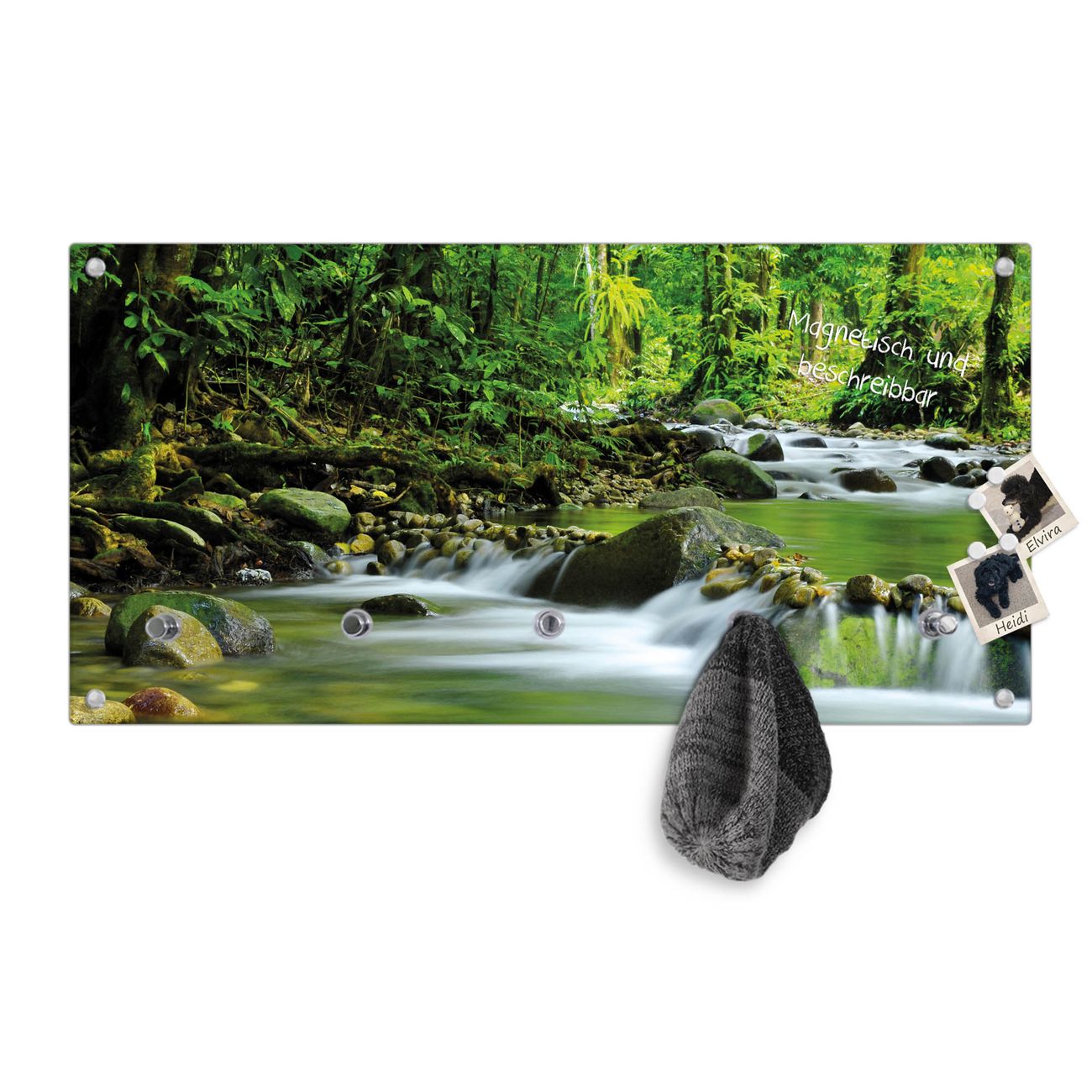 Bitte beachten Sie, dass an dieser Garderobe nur starke Neodym-Magnete halten! FUNKTION: Die banjado Wandgarderobe mit Motiv Rauschender Bach ist Ihr täglicher Begleiter. Zuverlässig hängen hier Ihre Jacken und Mäntel griffbereit. Gleichzeitig ist die Design Garderobe magnetisch, Sie können Notizen anheften und durch das Echtglas ist Ihr Paneel auch beschreibbar und wieder abwischbar. DESIGN: Sie erhalten eine Garderobenleiste aus elegantem Echtglas mit dem Farbbrillanten Motiv Rauschender Bach hinterklebt. Das Design ist zeitlos klassisch, ohne dabei auf Funktionalität zu verzichten. Suchen Sie aus einer Vielzahl von Motiven das für Ihre Einrichtung Passende aus. DETAILS: Die Flurgarderobe besteht aus 4mm gehärtetem Sicherheitsglas. Sie ist 80cm breit, 40cm hoch und 6cm tief. Die Garderobenhaken zur Selbstmontage präsentieren sich in Edelstahl-Optik, ebenso die Abstandshalter für die Wandmontage. Ihre neue Garderobe ist sofort einsatzbereit. NUTZEN: Ihre neue Garderobe hält nicht nur zuverlässig Ihre Kleidung, sie ist auch optisch ein Blickfang. Durch die magnetische Wirkung können Sie mit 4 beigefügten extrastarken Neodym-Magneten Notizen anheften und mit wasserlöslichen Kreidestiften oder Whiteboard-Markern auch Nachrichten hinterlassen. BANJADO: Wir sind ein kleines kreatives Team aus Sachsen und entwickeln Produkte die Design und Funktionalität verbinden sollen. Viel Freude mit Ihrer neuen Garderobe wünscht das banjado-Team!