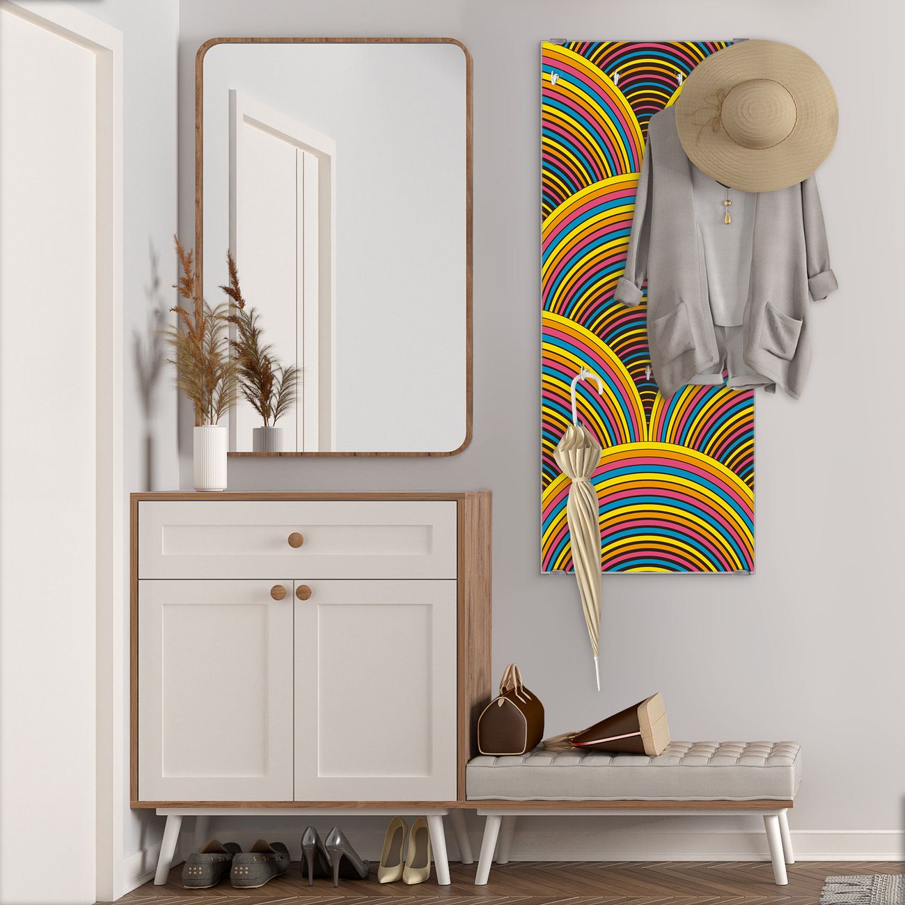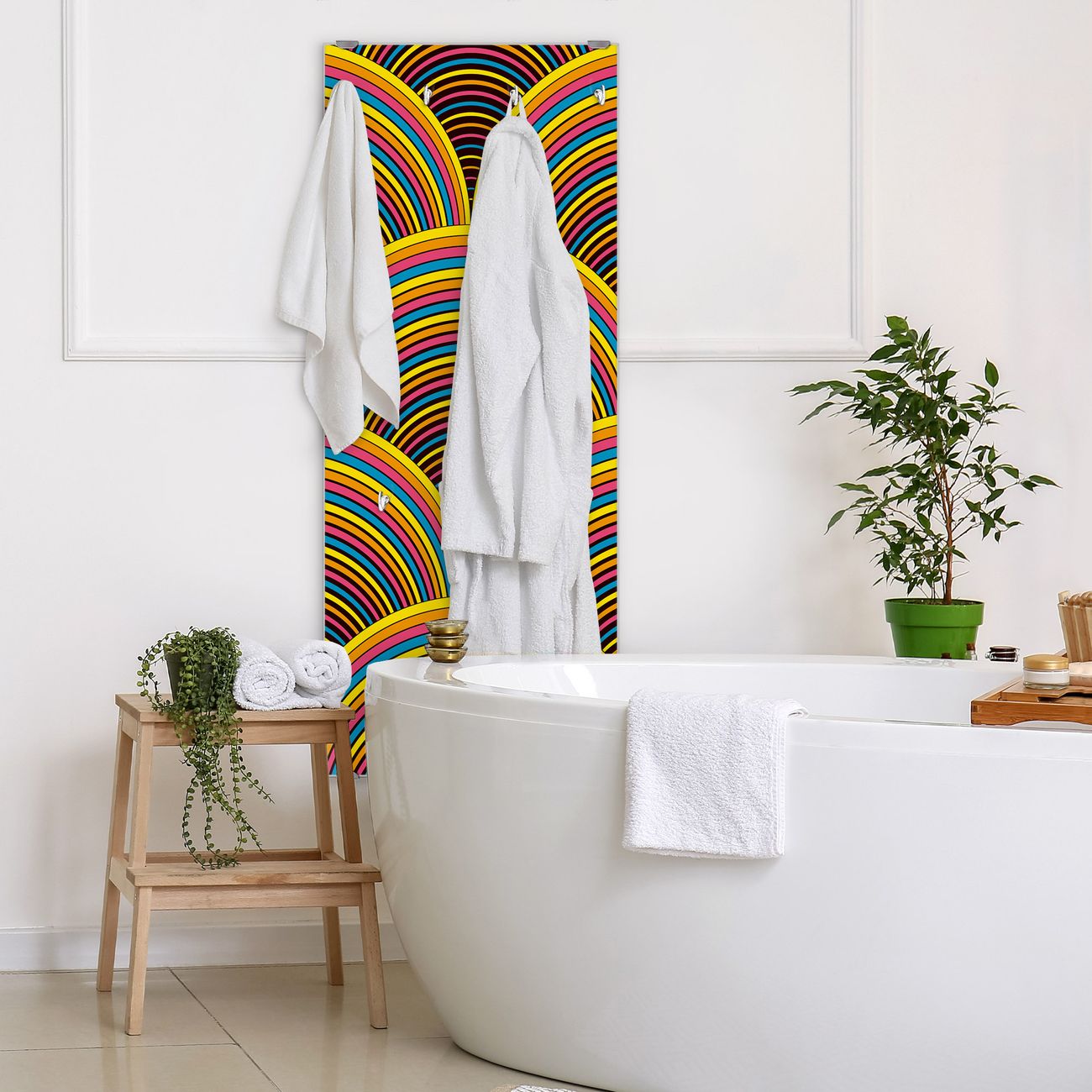 FUNKTION: Die banjado Wandgarderobe mit Motiv Regenbögen ist Ihr täglicher Begleiter. Zuverlässig hängen hier Ihre Jacken und Mäntel griffbereit. Das Echtglas ist Ihr Paneel auch beschreibbar und wieder abwischbar. DESIGN: Sie erhalten eine Garderobenleiste aus elegantem Echtglas mit dem Farbbrillanten Motiv Regenbögen hinterklebt. Das Design ist zeitlos klassisch, ohne dabei auf Funktionalität zu verzichten. Suchen Sie aus einer Vielzahl von Motiven das für Ihre Einrichtung Passende aus. DETAILS: Die Flurgarderobe besteht aus 4mm gehärtetem Sicherheitsglas. Sie ist 50cm breit, 125cm hoch und 6cm tief. Die Garderobenhaken zur Selbstmontage präsentieren sich in Edelstahl-Optik, ebenso die Abstandshalter für die Wandmontage. Ihre neue Garderobe ist sofort einsatzbereit. NUTZEN: Ihre neue Garderobe hält nicht nur zuverlässig Ihre Kleidung, sie ist auch optisch ein Blickfang. Durch das Glas können Sie an der Garderobe mit wasserlöslichen Kreidestiften oder Whiteboard-Markern auch Nachrichten hinterlassen. BANJADO: Wir sind ein kleines kreatives Team aus Sachsen und entwickeln Produkte die Design und Funktionalität verbinden sollen. Viel Freude mit Ihrer neuen Garderobe wünscht das banjado-Team!