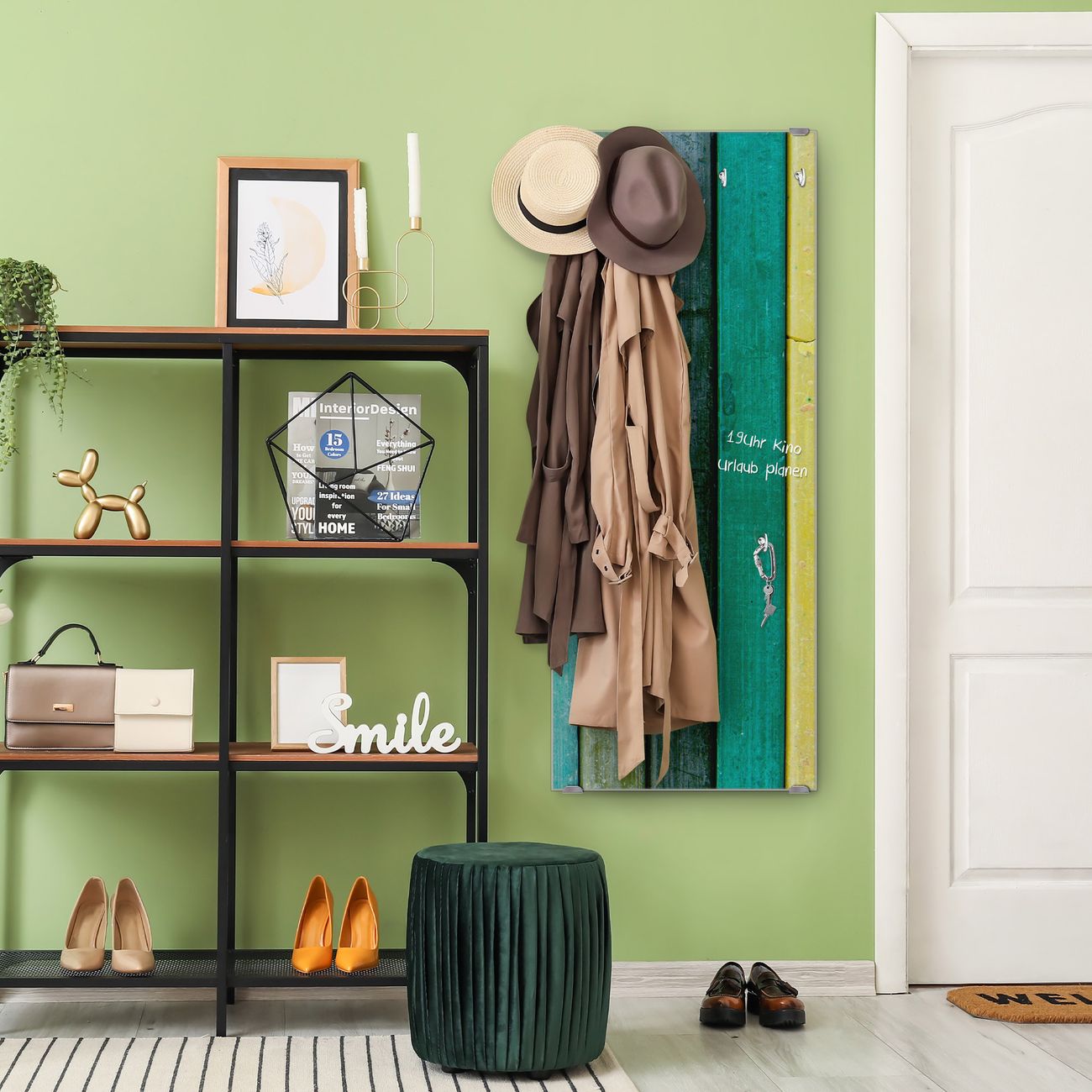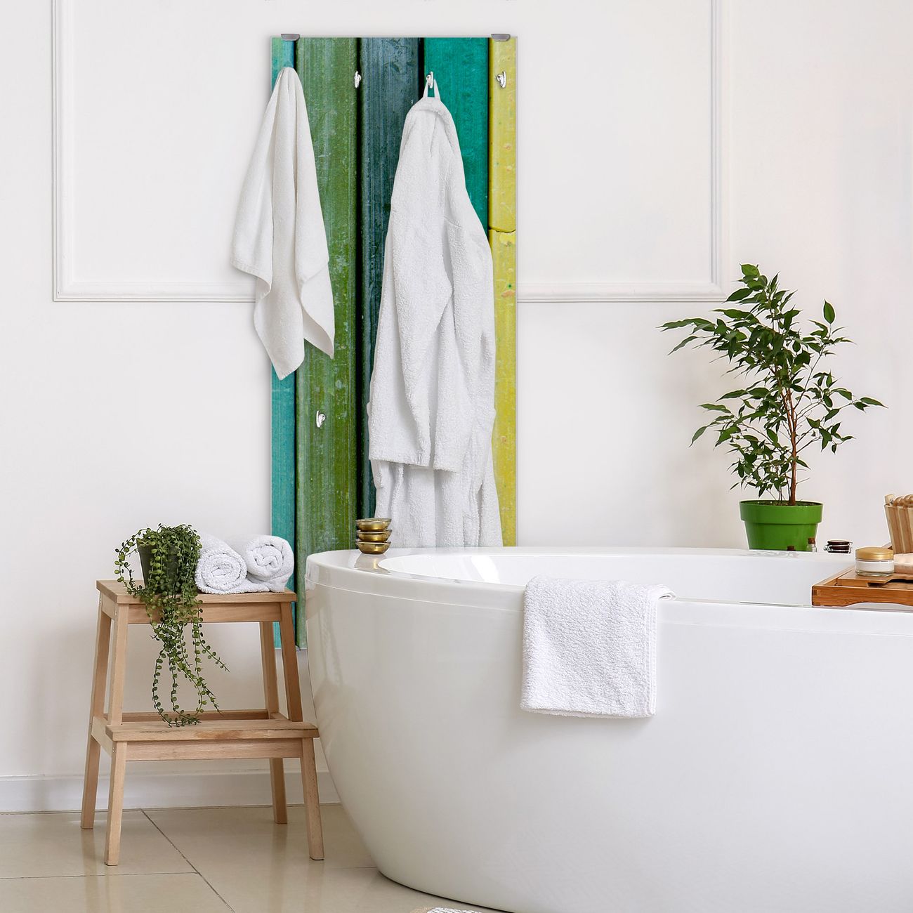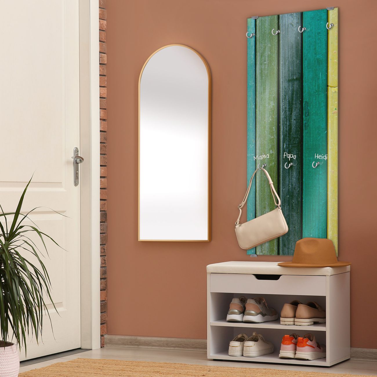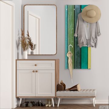 FUNKTION: Die banjado Wandgarderobe mit Motiv Regenbogenfarben ist Ihr täglicher Begleiter. Zuverlässig hängen hier Ihre Jacken und Mäntel griffbereit. Das Echtglas ist Ihr Paneel auch beschreibbar und wieder abwischbar. DESIGN: Sie erhalten eine Garderobenleiste aus elegantem Echtglas mit dem Farbbrillanten Motiv Regenbogenfarben hinterklebt. Das Design ist zeitlos klassisch, ohne dabei auf Funktionalität zu verzichten. Suchen Sie aus einer Vielzahl von Motiven das für Ihre Einrichtung Passende aus. DETAILS: Die Flurgarderobe besteht aus 4mm gehärtetem Sicherheitsglas. Sie ist 50cm breit, 125cm hoch und 6cm tief. Die Garderobenhaken zur Selbstmontage präsentieren sich in Edelstahl-Optik, ebenso die Abstandshalter für die Wandmontage. Ihre neue Garderobe ist sofort einsatzbereit. NUTZEN: Ihre neue Garderobe hält nicht nur zuverlässig Ihre Kleidung, sie ist auch optisch ein Blickfang. Durch das Glas können Sie an der Garderobe mit wasserlöslichen Kreidestiften oder Whiteboard-Markern auch Nachrichten hinterlassen. BANJADO: Wir sind ein kleines kreatives Team aus Sachsen und entwickeln Produkte die Design und Funktionalität verbinden sollen. Viel Freude mit Ihrer neuen Garderobe wünscht das banjado-Team!