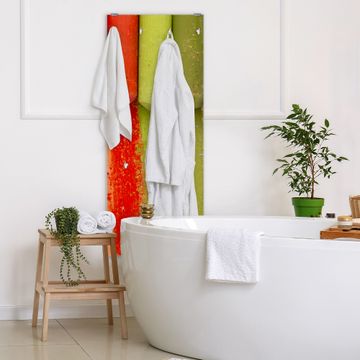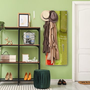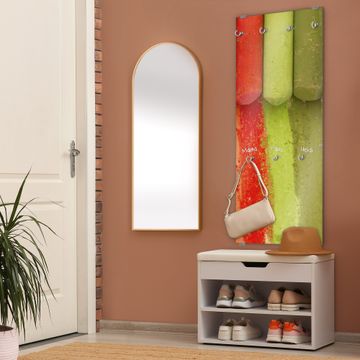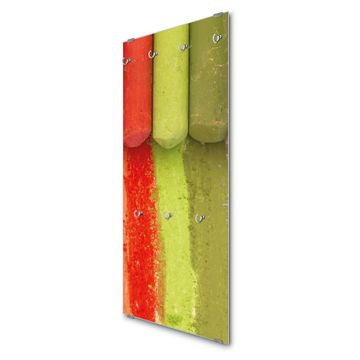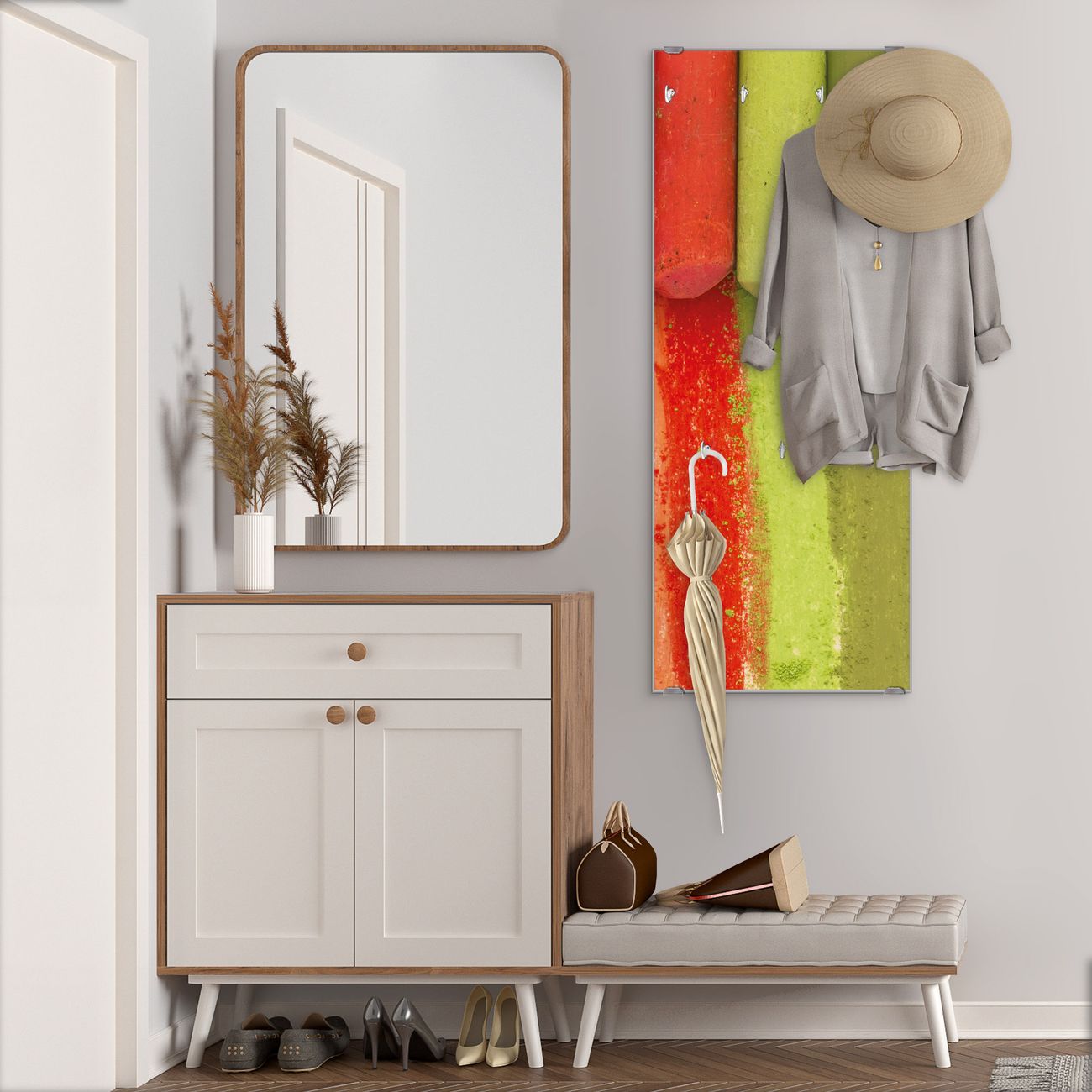 FUNKTION: Die banjado Wandgarderobe mit Motiv Regenbogenkreide ist Ihr täglicher Begleiter. Zuverlässig hängen hier Ihre Jacken und Mäntel griffbereit. Das Echtglas ist Ihr Paneel auch beschreibbar und wieder abwischbar. DESIGN: Sie erhalten eine Garderobenleiste aus elegantem Echtglas mit dem Farbbrillanten Motiv Regenbogenkreide hinterklebt. Das Design ist zeitlos klassisch, ohne dabei auf Funktionalität zu verzichten. Suchen Sie aus einer Vielzahl von Motiven das für Ihre Einrichtung Passende aus. DETAILS: Die Flurgarderobe besteht aus 4mm gehärtetem Sicherheitsglas. Sie ist 50cm breit, 125cm hoch und 6cm tief. Die Garderobenhaken zur Selbstmontage präsentieren sich in Edelstahl-Optik, ebenso die Abstandshalter für die Wandmontage. Ihre neue Garderobe ist sofort einsatzbereit. NUTZEN: Ihre neue Garderobe hält nicht nur zuverlässig Ihre Kleidung, sie ist auch optisch ein Blickfang. Durch das Glas können Sie an der Garderobe mit wasserlöslichen Kreidestiften oder Whiteboard-Markern auch Nachrichten hinterlassen. BANJADO: Wir sind ein kleines kreatives Team aus Sachsen und entwickeln Produkte die Design und Funktionalität verbinden sollen. Viel Freude mit Ihrer neuen Garderobe wünscht das banjado-Team!