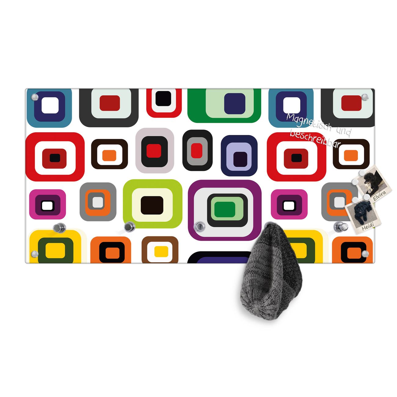 Bitte beachten Sie, dass an dieser Garderobe nur starke Neodym-Magnete halten! FUNKTION: Die banjado Wandgarderobe mit Motiv Retro 2 ist Ihr täglicher Begleiter. Zuverlässig hängen hier Ihre Jacken und Mäntel griffbereit. Gleichzeitig ist die Design Garderobe magnetisch, Sie können Notizen anheften und durch das Echtglas ist Ihr Paneel auch beschreibbar und wieder abwischbar. DESIGN: Sie erhalten eine Garderobenleiste aus elegantem Echtglas mit dem Farbbrillanten Motiv Retro 2 hinterklebt. Das Design ist zeitlos klassisch, ohne dabei auf Funktionalität zu verzichten. Suchen Sie aus einer Vielzahl von Motiven das für Ihre Einrichtung Passende aus. DETAILS: Die Flurgarderobe besteht aus 4mm gehärtetem Sicherheitsglas. Sie ist 80cm breit, 40cm hoch und 6cm tief. Die Garderobenhaken zur Selbstmontage präsentieren sich in Edelstahl-Optik, ebenso die Abstandshalter für die Wandmontage. Ihre neue Garderobe ist sofort einsatzbereit. NUTZEN: Ihre neue Garderobe hält nicht nur zuverlässig Ihre Kleidung, sie ist auch optisch ein Blickfang. Durch die magnetische Wirkung können Sie mit 4 beigefügten extrastarken Neodym-Magneten Notizen anheften und mit wasserlöslichen Kreidestiften oder Whiteboard-Markern auch Nachrichten hinterlassen. BANJADO: Wir sind ein kleines kreatives Team aus Sachsen und entwickeln Produkte die Design und Funktionalität verbinden sollen. Viel Freude mit Ihrer neuen Garderobe wünscht das banjado-Team!