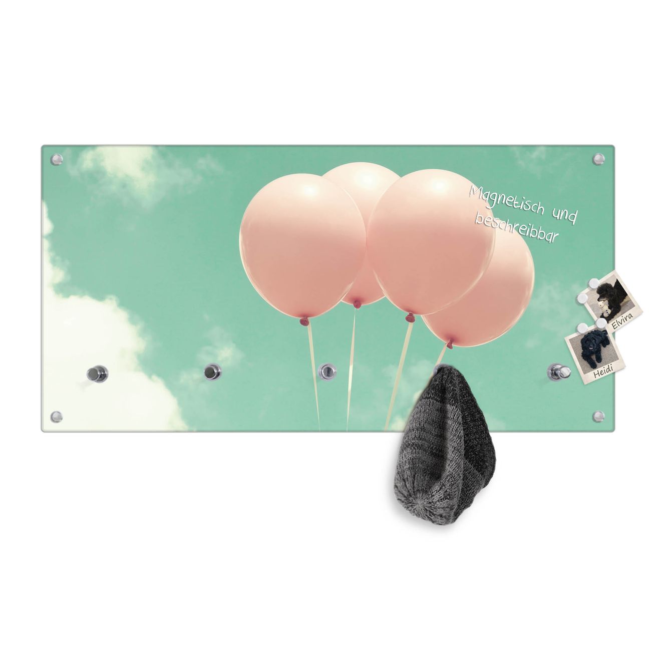 Bitte beachten Sie, dass an dieser Garderobe nur starke Neodym-Magnete halten! FUNKTION: Die banjado Wandgarderobe mit Motiv Rosa Ballons ist Ihr täglicher Begleiter. Zuverlässig hängen hier Ihre Jacken und Mäntel griffbereit. Gleichzeitig ist die Design Garderobe magnetisch, Sie können Notizen anheften und durch das Echtglas ist Ihr Paneel auch beschreibbar und wieder abwischbar. DESIGN: Sie erhalten eine Garderobenleiste aus elegantem Echtglas mit dem Farbbrillanten Motiv Rosa Ballons hinterklebt. Das Design ist zeitlos klassisch, ohne dabei auf Funktionalität zu verzichten. Suchen Sie aus einer Vielzahl von Motiven das für Ihre Einrichtung Passende aus. DETAILS: Die Flurgarderobe besteht aus 4mm gehärtetem Sicherheitsglas. Sie ist 80cm breit, 40cm hoch und 6cm tief. Die Garderobenhaken zur Selbstmontage präsentieren sich in Edelstahl-Optik, ebenso die Abstandshalter für die Wandmontage. Ihre neue Garderobe ist sofort einsatzbereit. NUTZEN: Ihre neue Garderobe hält nicht nur zuverlässig Ihre Kleidung, sie ist auch optisch ein Blickfang. Durch die magnetische Wirkung können Sie mit 4 beigefügten extrastarken Neodym-Magneten Notizen anheften und mit wasserlöslichen Kreidestiften oder Whiteboard-Markern auch Nachrichten hinterlassen. BANJADO: Wir sind ein kleines kreatives Team aus Sachsen und entwickeln Produkte die Design und Funktionalität verbinden sollen. Viel Freude mit Ihrer neuen Garderobe wünscht das banjado-Team!