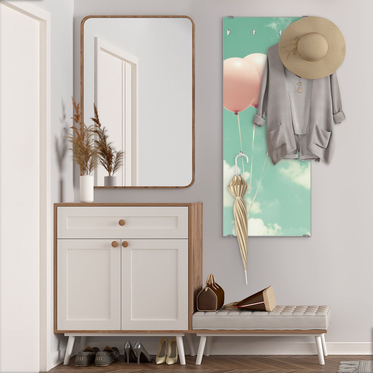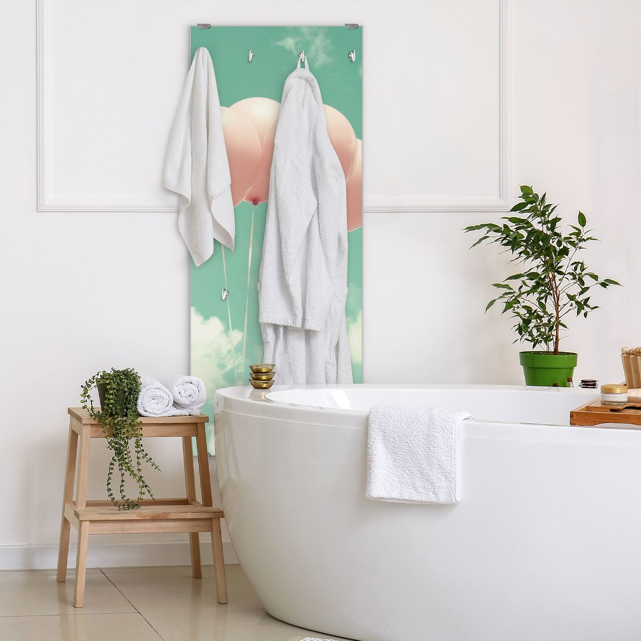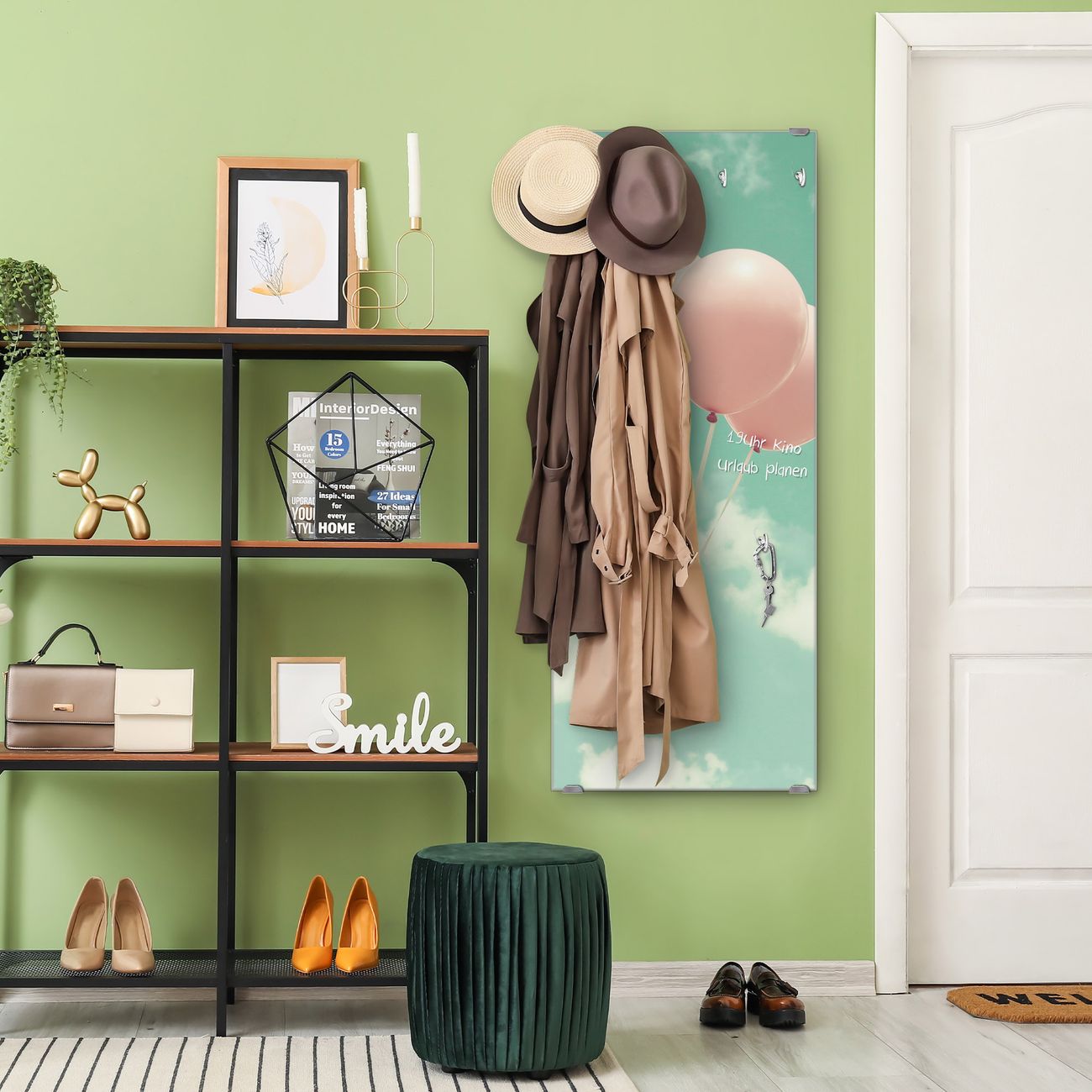 FUNKTION: Die banjado Wandgarderobe mit Motiv Rosa Ballons ist Ihr täglicher Begleiter. Zuverlässig hängen hier Ihre Jacken und Mäntel griffbereit. Das Echtglas ist Ihr Paneel auch beschreibbar und wieder abwischbar. DESIGN: Sie erhalten eine Garderobenleiste aus elegantem Echtglas mit dem Farbbrillanten Motiv Rosa Ballons hinterklebt. Das Design ist zeitlos klassisch, ohne dabei auf Funktionalität zu verzichten. Suchen Sie aus einer Vielzahl von Motiven das für Ihre Einrichtung Passende aus. DETAILS: Die Flurgarderobe besteht aus 4mm gehärtetem Sicherheitsglas. Sie ist 50cm breit, 125cm hoch und 6cm tief. Die Garderobenhaken zur Selbstmontage präsentieren sich in Edelstahl-Optik, ebenso die Abstandshalter für die Wandmontage. Ihre neue Garderobe ist sofort einsatzbereit. NUTZEN: Ihre neue Garderobe hält nicht nur zuverlässig Ihre Kleidung, sie ist auch optisch ein Blickfang. Durch das Glas können Sie an der Garderobe mit wasserlöslichen Kreidestiften oder Whiteboard-Markern auch Nachrichten hinterlassen. BANJADO: Wir sind ein kleines kreatives Team aus Sachsen und entwickeln Produkte die Design und Funktionalität verbinden sollen. Viel Freude mit Ihrer neuen Garderobe wünscht das banjado-Team!