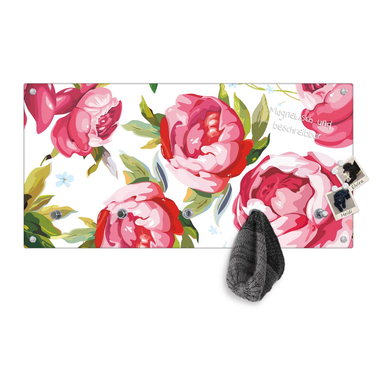 Bitte beachten Sie, dass an dieser Garderobe nur starke Neodym-Magnete halten! FUNKTION: Die banjado Wandgarderobe mit Motiv Rosen Rustikal ist Ihr täglicher Begleiter. Zuverlässig hängen hier Ihre Jacken und Mäntel griffbereit. Gleichzeitig ist die Design Garderobe magnetisch, Sie können Notizen anheften und durch das Echtglas ist Ihr Paneel auch beschreibbar und wieder abwischbar. DESIGN: Sie erhalten eine Garderobenleiste aus elegantem Echtglas mit dem Farbbrillanten Motiv Rosen Rustikal hinterklebt. Das Design ist zeitlos klassisch, ohne dabei auf Funktionalität zu verzichten. Suchen Sie aus einer Vielzahl von Motiven das für Ihre Einrichtung Passende aus. DETAILS: Die Flurgarderobe besteht aus 4mm gehärtetem Sicherheitsglas. Sie ist 80cm breit, 40cm hoch und 6cm tief. Die Garderobenhaken zur Selbstmontage präsentieren sich in Edelstahl-Optik, ebenso die Abstandshalter für die Wandmontage. Ihre neue Garderobe ist sofort einsatzbereit. NUTZEN: Ihre neue Garderobe hält nicht nur zuverlässig Ihre Kleidung, sie ist auch optisch ein Blickfang. Durch die magnetische Wirkung können Sie mit 4 beigefügten extrastarken Neodym-Magneten Notizen anheften und mit wasserlöslichen Kreidestiften oder Whiteboard-Markern auch Nachrichten hinterlassen. BANJADO: Wir sind ein kleines kreatives Team aus Sachsen und entwickeln Produkte die Design und Funktionalität verbinden sollen. Viel Freude mit Ihrer neuen Garderobe wünscht das banjado-Team!