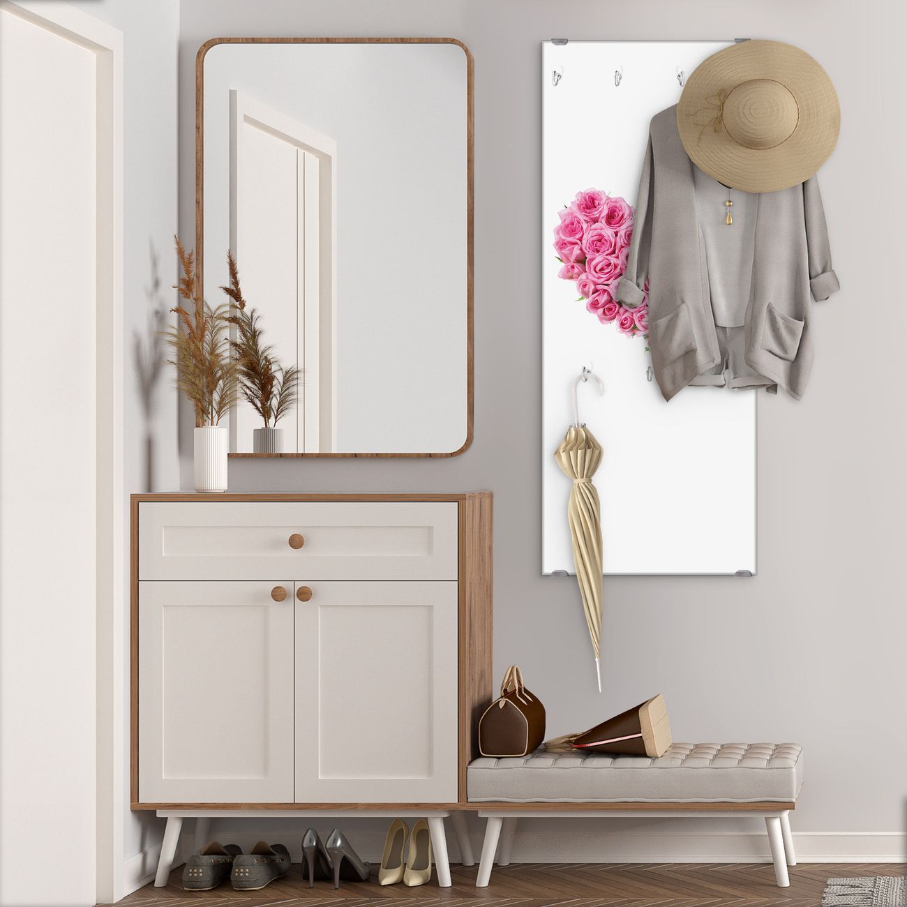 FUNKTION: Die banjado Wandgarderobe mit Motiv Rosenherz ist Ihr täglicher Begleiter. Zuverlässig hängen hier Ihre Jacken und Mäntel griffbereit. Das Echtglas ist Ihr Paneel auch beschreibbar und wieder abwischbar. DESIGN: Sie erhalten eine Garderobenleiste aus elegantem Echtglas mit dem Farbbrillanten Motiv Rosenherz hinterklebt. Das Design ist zeitlos klassisch, ohne dabei auf Funktionalität zu verzichten. Suchen Sie aus einer Vielzahl von Motiven das für Ihre Einrichtung Passende aus. DETAILS: Die Flurgarderobe besteht aus 4mm gehärtetem Sicherheitsglas. Sie ist 50cm breit, 125cm hoch und 6cm tief. Die Garderobenhaken zur Selbstmontage präsentieren sich in Edelstahl-Optik, ebenso die Abstandshalter für die Wandmontage. Ihre neue Garderobe ist sofort einsatzbereit. NUTZEN: Ihre neue Garderobe hält nicht nur zuverlässig Ihre Kleidung, sie ist auch optisch ein Blickfang. Durch das Glas können Sie an der Garderobe mit wasserlöslichen Kreidestiften oder Whiteboard-Markern auch Nachrichten hinterlassen. BANJADO: Wir sind ein kleines kreatives Team aus Sachsen und entwickeln Produkte die Design und Funktionalität verbinden sollen. Viel Freude mit Ihrer neuen Garderobe wünscht das banjado-Team!