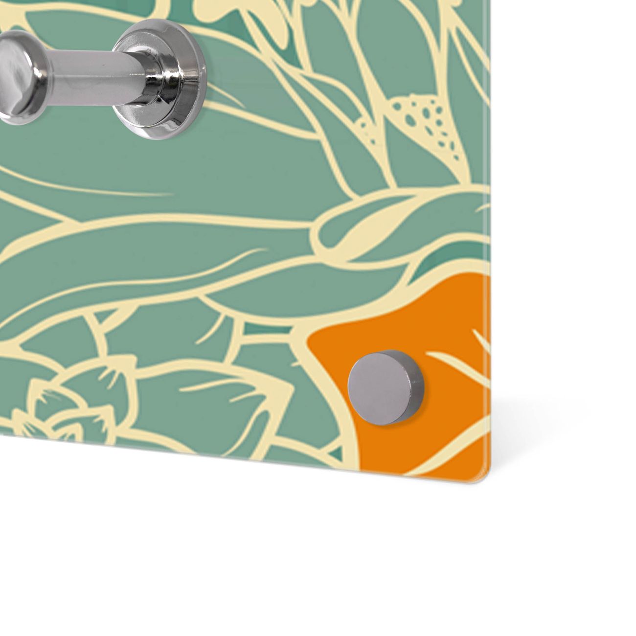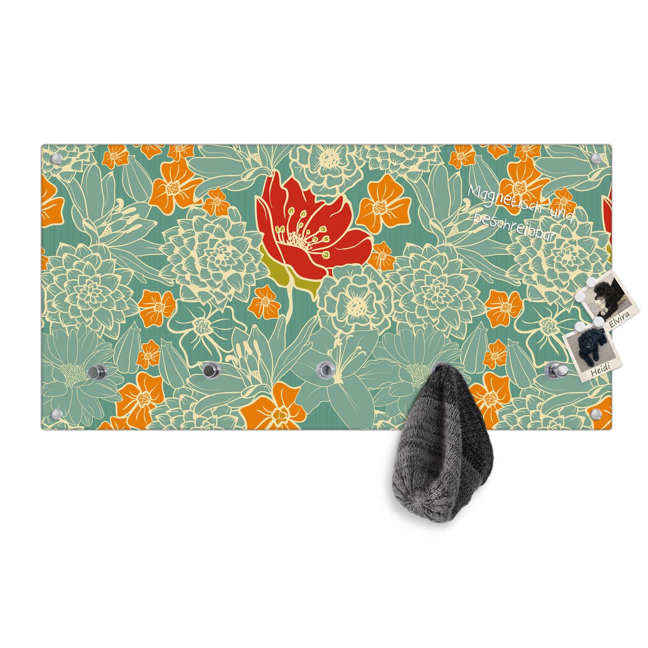 Bitte beachten Sie, dass an dieser Garderobe nur starke Neodym-Magnete halten! FUNKTION: Die banjado Wandgarderobe mit Motiv Rote Blumen ist Ihr täglicher Begleiter. Zuverlässig hängen hier Ihre Jacken und Mäntel griffbereit. Gleichzeitig ist die Design Garderobe magnetisch, Sie können Notizen anheften und durch das Echtglas ist Ihr Paneel auch beschreibbar und wieder abwischbar. DESIGN: Sie erhalten eine Garderobenleiste aus elegantem Echtglas mit dem Farbbrillanten Motiv Rote Blumen hinterklebt. Das Design ist zeitlos klassisch, ohne dabei auf Funktionalität zu verzichten. Suchen Sie aus einer Vielzahl von Motiven das für Ihre Einrichtung Passende aus. DETAILS: Die Flurgarderobe besteht aus 4mm gehärtetem Sicherheitsglas. Sie ist 80cm breit, 40cm hoch und 6cm tief. Die Garderobenhaken zur Selbstmontage präsentieren sich in Edelstahl-Optik, ebenso die Abstandshalter für die Wandmontage. Ihre neue Garderobe ist sofort einsatzbereit. NUTZEN: Ihre neue Garderobe hält nicht nur zuverlässig Ihre Kleidung, sie ist auch optisch ein Blickfang. Durch die magnetische Wirkung können Sie mit 4 beigefügten extrastarken Neodym-Magneten Notizen anheften und mit wasserlöslichen Kreidestiften oder Whiteboard-Markern auch Nachrichten hinterlassen. BANJADO: Wir sind ein kleines kreatives Team aus Sachsen und entwickeln Produkte die Design und Funktionalität verbinden sollen. Viel Freude mit Ihrer neuen Garderobe wünscht das banjado-Team!