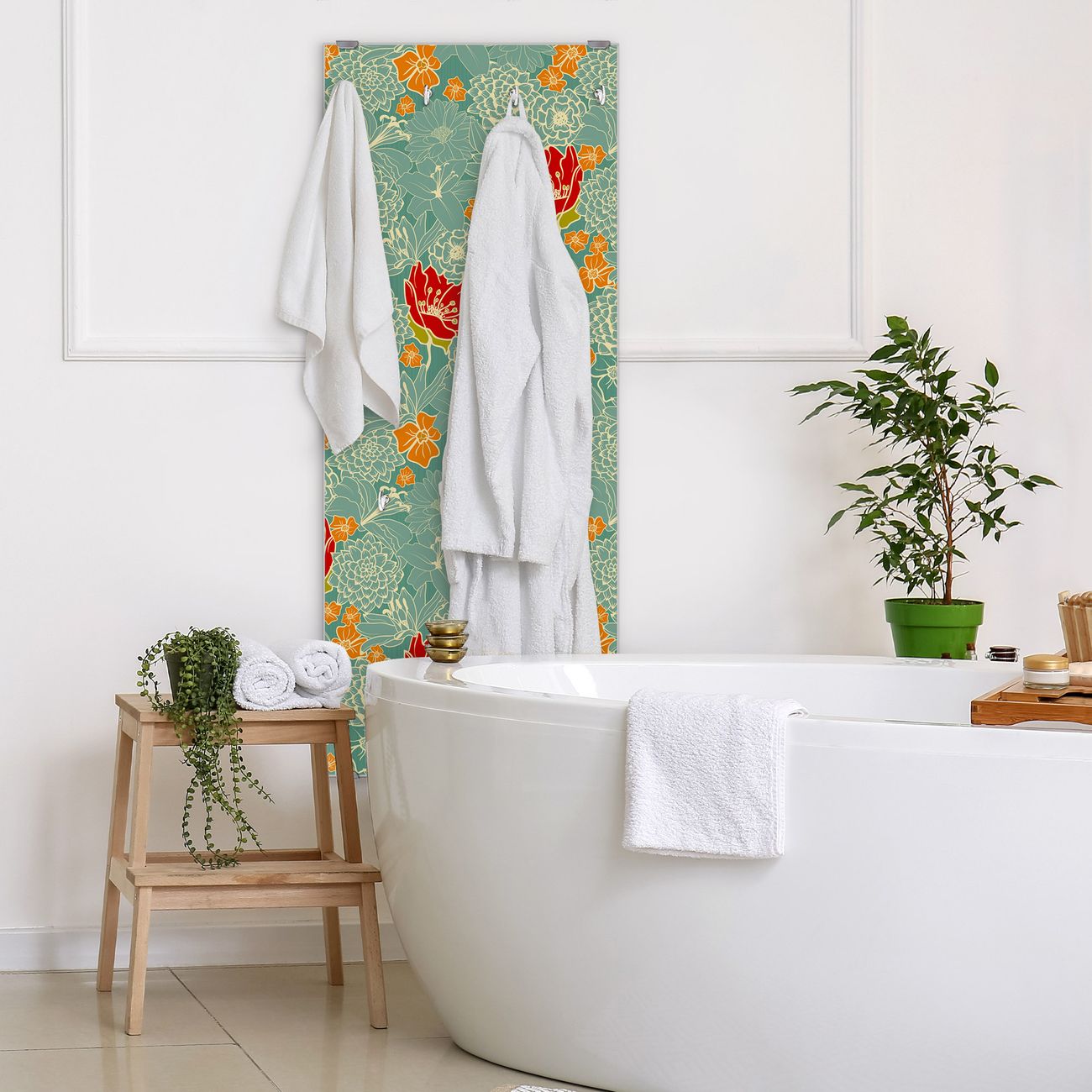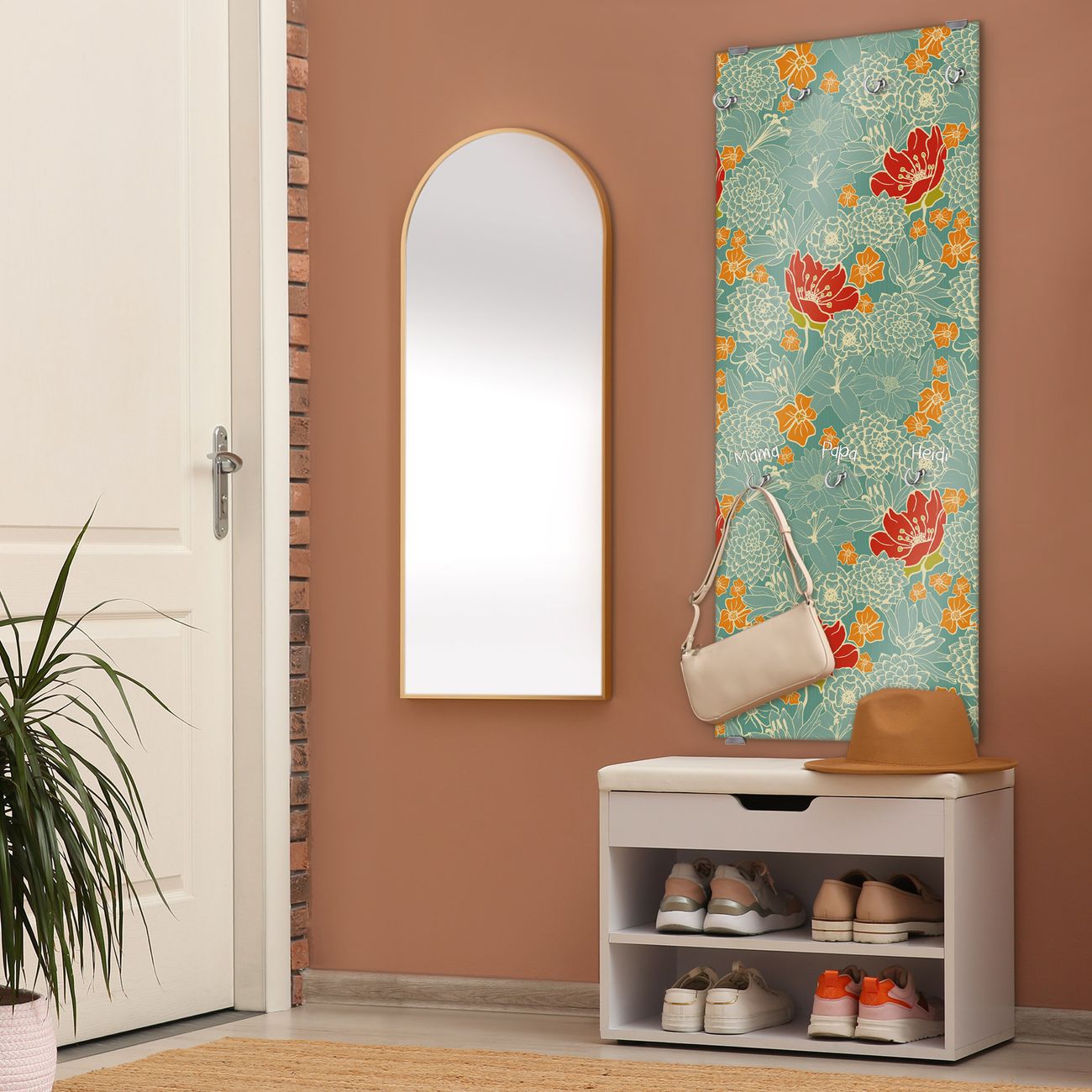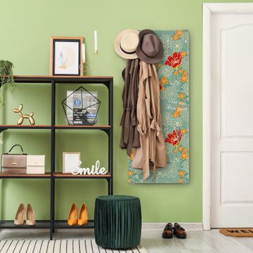 FUNKTION: Die banjado Wandgarderobe mit Motiv Rote Blumen ist Ihr täglicher Begleiter. Zuverlässig hängen hier Ihre Jacken und Mäntel griffbereit. Das Echtglas ist Ihr Paneel auch beschreibbar und wieder abwischbar. DESIGN: Sie erhalten eine Garderobenleiste aus elegantem Echtglas mit dem Farbbrillanten Motiv Rote Blumen hinterklebt. Das Design ist zeitlos klassisch, ohne dabei auf Funktionalität zu verzichten. Suchen Sie aus einer Vielzahl von Motiven das für Ihre Einrichtung Passende aus. DETAILS: Die Flurgarderobe besteht aus 4mm gehärtetem Sicherheitsglas. Sie ist 50cm breit, 125cm hoch und 6cm tief. Die Garderobenhaken zur Selbstmontage präsentieren sich in Edelstahl-Optik, ebenso die Abstandshalter für die Wandmontage. Ihre neue Garderobe ist sofort einsatzbereit. NUTZEN: Ihre neue Garderobe hält nicht nur zuverlässig Ihre Kleidung, sie ist auch optisch ein Blickfang. Durch das Glas können Sie an der Garderobe mit wasserlöslichen Kreidestiften oder Whiteboard-Markern auch Nachrichten hinterlassen. BANJADO: Wir sind ein kleines kreatives Team aus Sachsen und entwickeln Produkte die Design und Funktionalität verbinden sollen. Viel Freude mit Ihrer neuen Garderobe wünscht das banjado-Team!