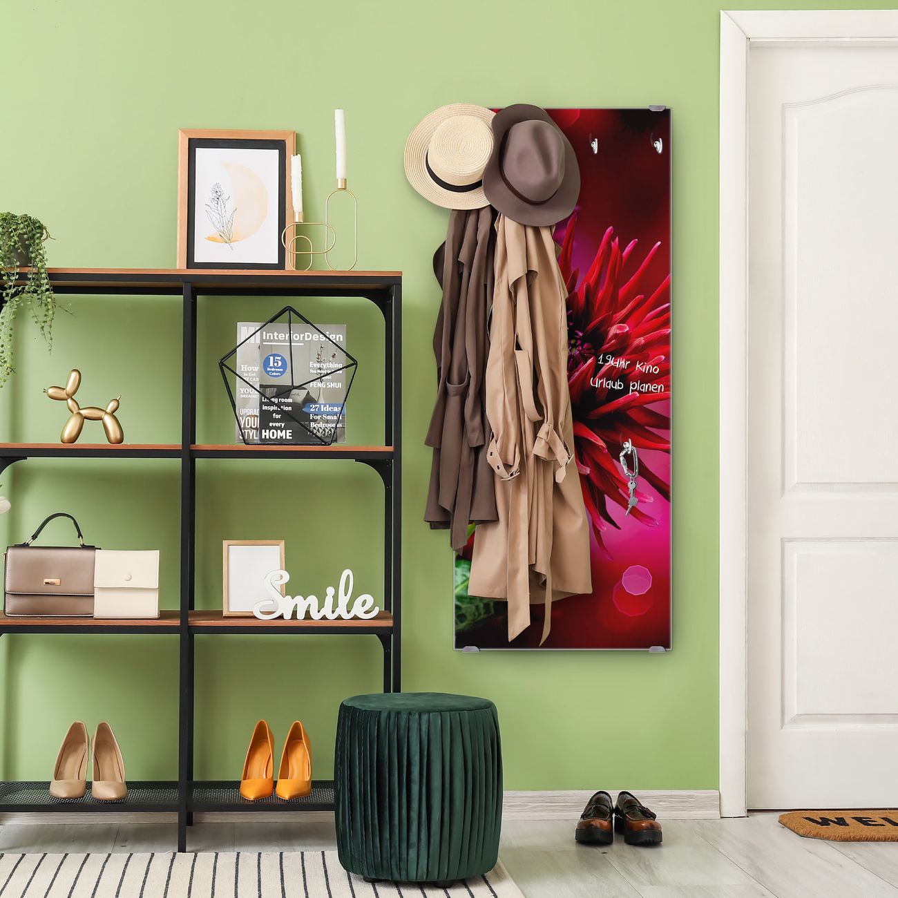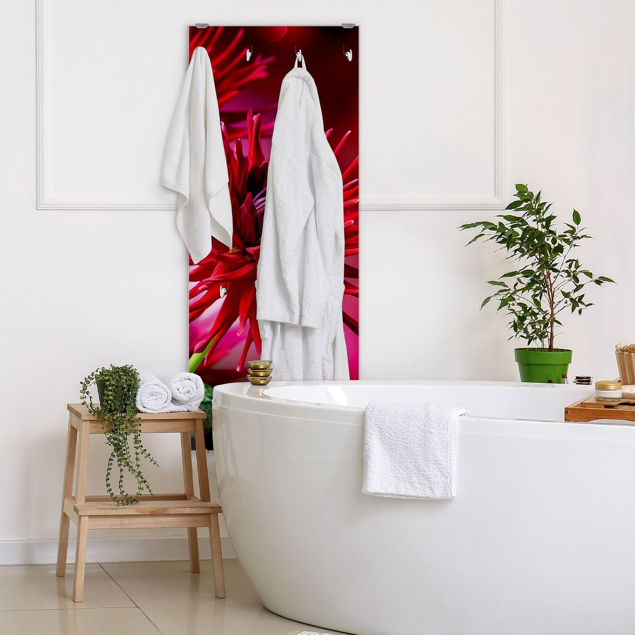 FUNKTION: Die banjado Wandgarderobe mit Motiv Rote Dahlien ist Ihr täglicher Begleiter. Zuverlässig hängen hier Ihre Jacken und Mäntel griffbereit. Das Echtglas ist Ihr Paneel auch beschreibbar und wieder abwischbar. DESIGN: Sie erhalten eine Garderobenleiste aus elegantem Echtglas mit dem Farbbrillanten Motiv Rote Dahlien hinterklebt. Das Design ist zeitlos klassisch, ohne dabei auf Funktionalität zu verzichten. Suchen Sie aus einer Vielzahl von Motiven das für Ihre Einrichtung Passende aus. DETAILS: Die Flurgarderobe besteht aus 4mm gehärtetem Sicherheitsglas. Sie ist 50cm breit, 125cm hoch und 6cm tief. Die Garderobenhaken zur Selbstmontage präsentieren sich in Edelstahl-Optik, ebenso die Abstandshalter für die Wandmontage. Ihre neue Garderobe ist sofort einsatzbereit. NUTZEN: Ihre neue Garderobe hält nicht nur zuverlässig Ihre Kleidung, sie ist auch optisch ein Blickfang. Durch das Glas können Sie an der Garderobe mit wasserlöslichen Kreidestiften oder Whiteboard-Markern auch Nachrichten hinterlassen. BANJADO: Wir sind ein kleines kreatives Team aus Sachsen und entwickeln Produkte die Design und Funktionalität verbinden sollen. Viel Freude mit Ihrer neuen Garderobe wünscht das banjado-Team!