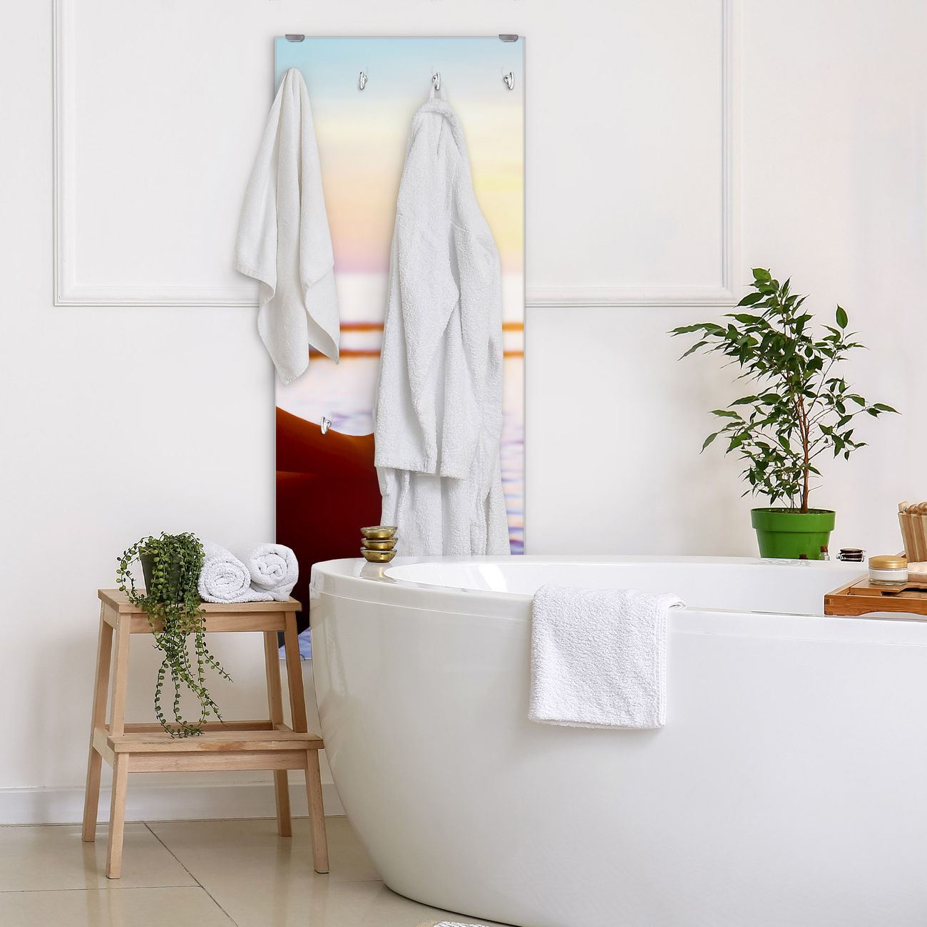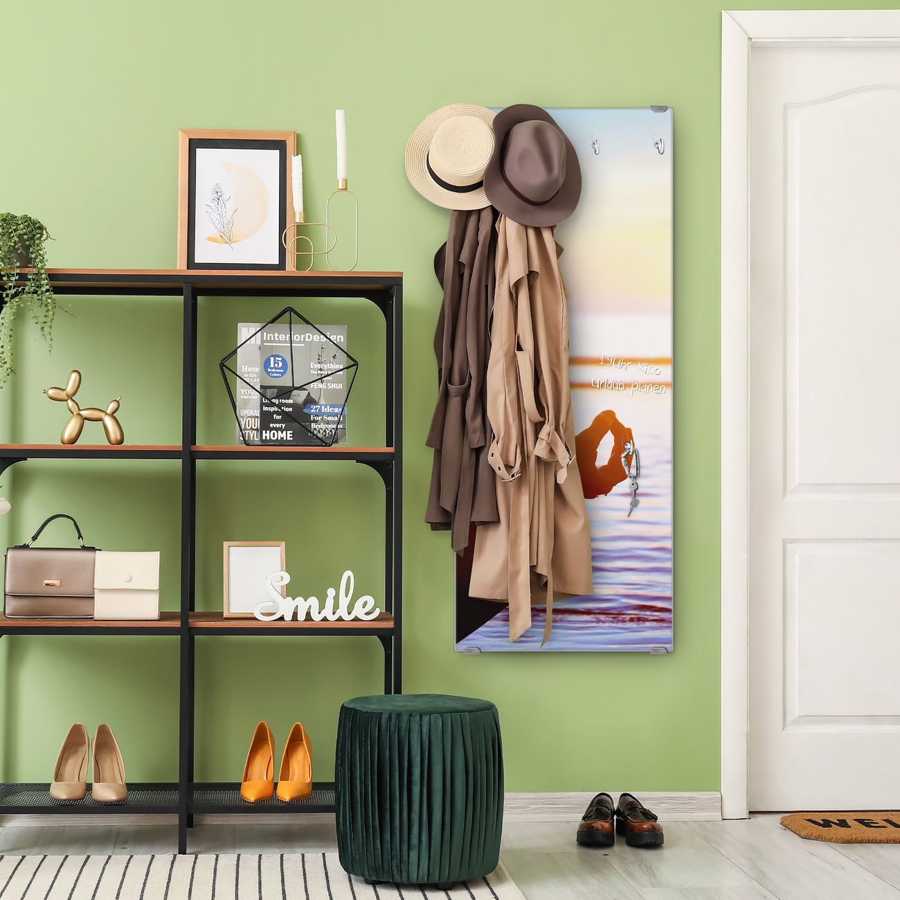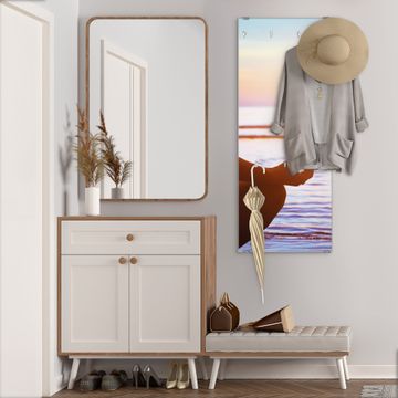 FUNKTION: Die banjado Wandgarderobe mit Motiv Ruhe ist Ihr täglicher Begleiter. Zuverlässig hängen hier Ihre Jacken und Mäntel griffbereit. Das Echtglas ist Ihr Paneel auch beschreibbar und wieder abwischbar. DESIGN: Sie erhalten eine Garderobenleiste aus elegantem Echtglas mit dem Farbbrillanten Motiv Ruhe hinterklebt. Das Design ist zeitlos klassisch, ohne dabei auf Funktionalität zu verzichten. Suchen Sie aus einer Vielzahl von Motiven das für Ihre Einrichtung Passende aus. DETAILS: Die Flurgarderobe besteht aus 4mm gehärtetem Sicherheitsglas. Sie ist 50cm breit, 125cm hoch und 6cm tief. Die Garderobenhaken zur Selbstmontage präsentieren sich in Edelstahl-Optik, ebenso die Abstandshalter für die Wandmontage. Ihre neue Garderobe ist sofort einsatzbereit. NUTZEN: Ihre neue Garderobe hält nicht nur zuverlässig Ihre Kleidung, sie ist auch optisch ein Blickfang. Durch das Glas können Sie an der Garderobe mit wasserlöslichen Kreidestiften oder Whiteboard-Markern auch Nachrichten hinterlassen. BANJADO: Wir sind ein kleines kreatives Team aus Sachsen und entwickeln Produkte die Design und Funktionalität verbinden sollen. Viel Freude mit Ihrer neuen Garderobe wünscht das banjado-Team!