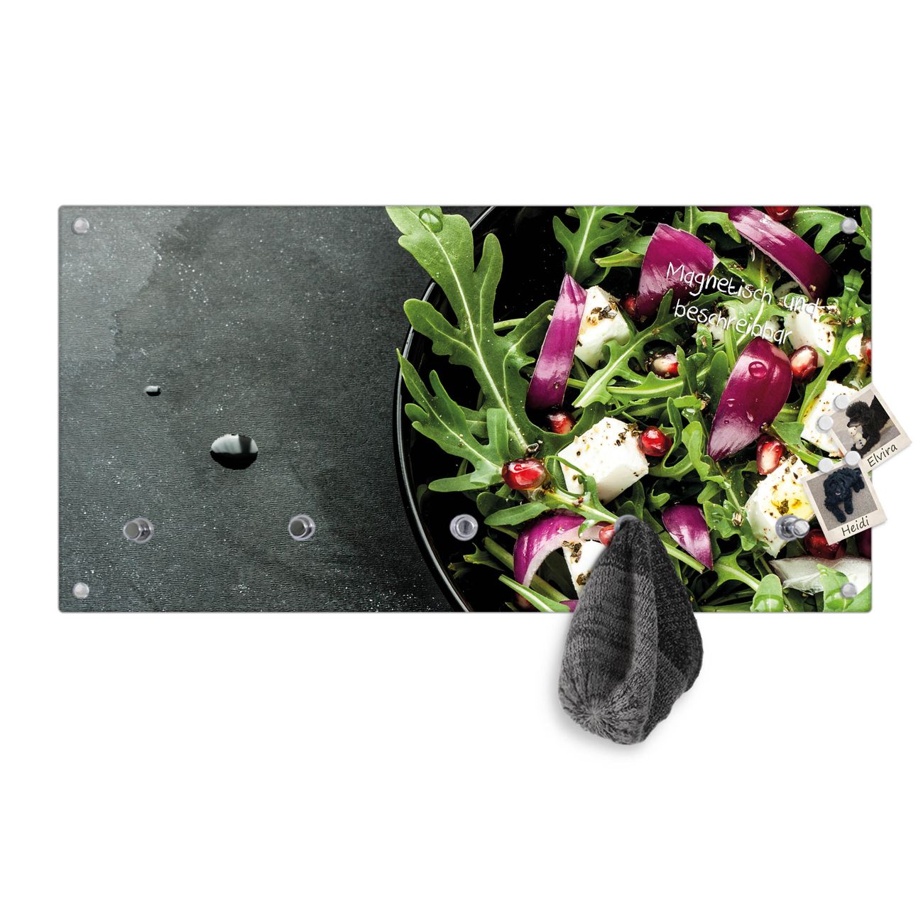 Bitte beachten Sie, dass an dieser Garderobe nur starke Neodym-Magnete halten! FUNKTION: Die banjado Wandgarderobe mit Motiv Salat ist Ihr täglicher Begleiter. Zuverlässig hängen hier Ihre Jacken und Mäntel griffbereit. Gleichzeitig ist die Design Garderobe magnetisch, Sie können Notizen anheften und durch das Echtglas ist Ihr Paneel auch beschreibbar und wieder abwischbar. DESIGN: Sie erhalten eine Garderobenleiste aus elegantem Echtglas mit dem Farbbrillanten Motiv Salat hinterklebt. Das Design ist zeitlos klassisch, ohne dabei auf Funktionalität zu verzichten. Suchen Sie aus einer Vielzahl von Motiven das für Ihre Einrichtung Passende aus. DETAILS: Die Flurgarderobe besteht aus 4mm gehärtetem Sicherheitsglas. Sie ist 80cm breit, 40cm hoch und 6cm tief. Die Garderobenhaken zur Selbstmontage präsentieren sich in Edelstahl-Optik, ebenso die Abstandshalter für die Wandmontage. Ihre neue Garderobe ist sofort einsatzbereit. NUTZEN: Ihre neue Garderobe hält nicht nur zuverlässig Ihre Kleidung, sie ist auch optisch ein Blickfang. Durch die magnetische Wirkung können Sie mit 4 beigefügten extrastarken Neodym-Magneten Notizen anheften und mit wasserlöslichen Kreidestiften oder Whiteboard-Markern auch Nachrichten hinterlassen. BANJADO: Wir sind ein kleines kreatives Team aus Sachsen und entwickeln Produkte die Design und Funktionalität verbinden sollen. Viel Freude mit Ihrer neuen Garderobe wünscht das banjado-Team!