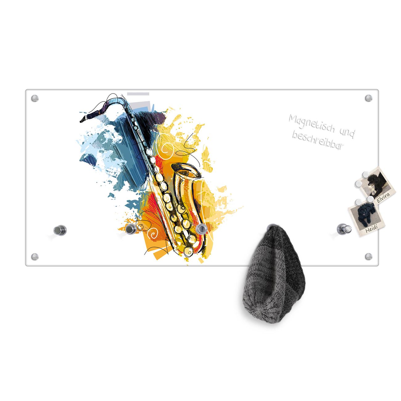Bitte beachten Sie, dass an dieser Garderobe nur starke Neodym-Magnete halten! FUNKTION: Die banjado Wandgarderobe mit Motiv Saxophon ist Ihr täglicher Begleiter. Zuverlässig hängen hier Ihre Jacken und Mäntel griffbereit. Gleichzeitig ist die Design Garderobe magnetisch, Sie können Notizen anheften und durch das Echtglas ist Ihr Paneel auch beschreibbar und wieder abwischbar. DESIGN: Sie erhalten eine Garderobenleiste aus elegantem Echtglas mit dem Farbbrillanten Motiv Saxophon hinterklebt. Das Design ist zeitlos klassisch, ohne dabei auf Funktionalität zu verzichten. Suchen Sie aus einer Vielzahl von Motiven das für Ihre Einrichtung Passende aus. DETAILS: Die Flurgarderobe besteht aus 4mm gehärtetem Sicherheitsglas. Sie ist 80cm breit, 40cm hoch und 6cm tief. Die Garderobenhaken zur Selbstmontage präsentieren sich in Edelstahl-Optik, ebenso die Abstandshalter für die Wandmontage. Ihre neue Garderobe ist sofort einsatzbereit. NUTZEN: Ihre neue Garderobe hält nicht nur zuverlässig Ihre Kleidung, sie ist auch optisch ein Blickfang. Durch die magnetische Wirkung können Sie mit 4 beigefügten extrastarken Neodym-Magneten Notizen anheften und mit wasserlöslichen Kreidestiften oder Whiteboard-Markern auch Nachrichten hinterlassen. BANJADO: Wir sind ein kleines kreatives Team aus Sachsen und entwickeln Produkte die Design und Funktionalität verbinden sollen. Viel Freude mit Ihrer neuen Garderobe wünscht das banjado-Team!