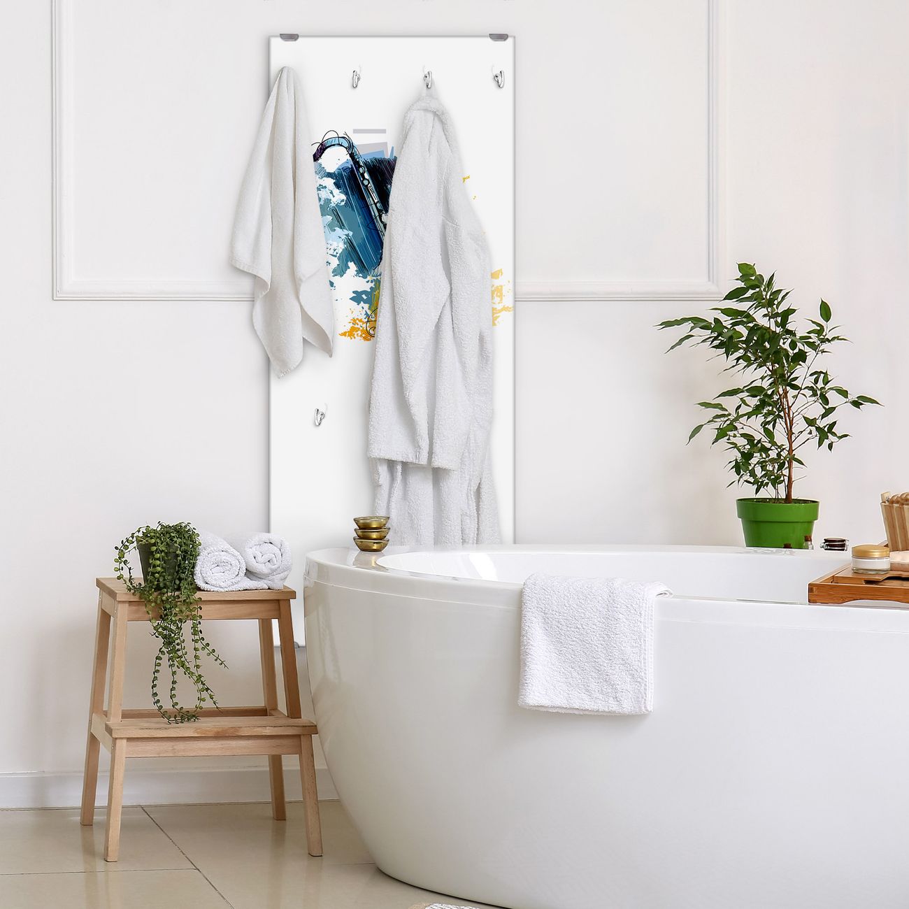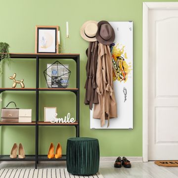 FUNKTION: Die banjado Wandgarderobe mit Motiv Saxophon ist Ihr täglicher Begleiter. Zuverlässig hängen hier Ihre Jacken und Mäntel griffbereit. Das Echtglas ist Ihr Paneel auch beschreibbar und wieder abwischbar. DESIGN: Sie erhalten eine Garderobenleiste aus elegantem Echtglas mit dem Farbbrillanten Motiv Saxophon hinterklebt. Das Design ist zeitlos klassisch, ohne dabei auf Funktionalität zu verzichten. Suchen Sie aus einer Vielzahl von Motiven das für Ihre Einrichtung Passende aus. DETAILS: Die Flurgarderobe besteht aus 4mm gehärtetem Sicherheitsglas. Sie ist 50cm breit, 125cm hoch und 6cm tief. Die Garderobenhaken zur Selbstmontage präsentieren sich in Edelstahl-Optik, ebenso die Abstandshalter für die Wandmontage. Ihre neue Garderobe ist sofort einsatzbereit. NUTZEN: Ihre neue Garderobe hält nicht nur zuverlässig Ihre Kleidung, sie ist auch optisch ein Blickfang. Durch das Glas können Sie an der Garderobe mit wasserlöslichen Kreidestiften oder Whiteboard-Markern auch Nachrichten hinterlassen. BANJADO: Wir sind ein kleines kreatives Team aus Sachsen und entwickeln Produkte die Design und Funktionalität verbinden sollen. Viel Freude mit Ihrer neuen Garderobe wünscht das banjado-Team!