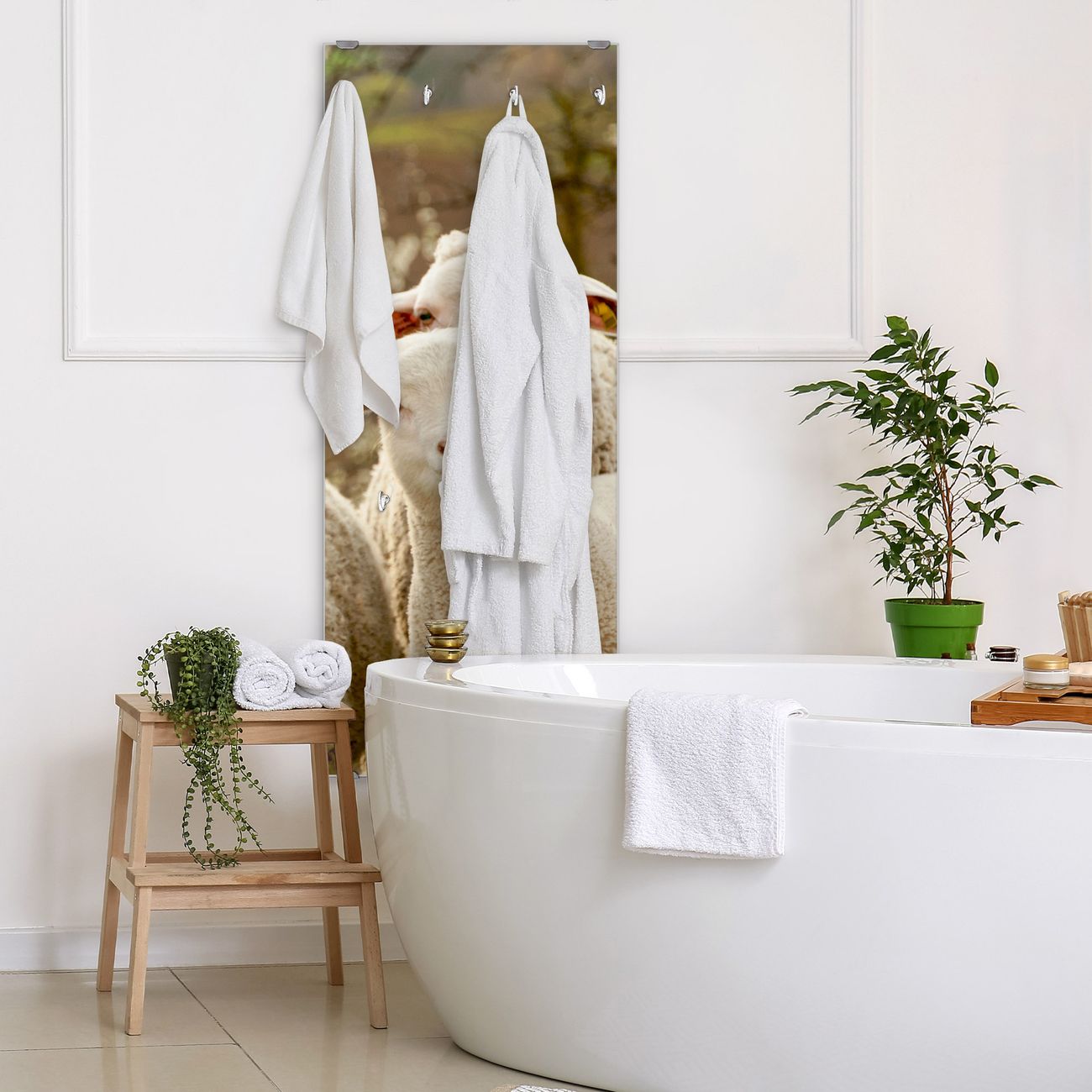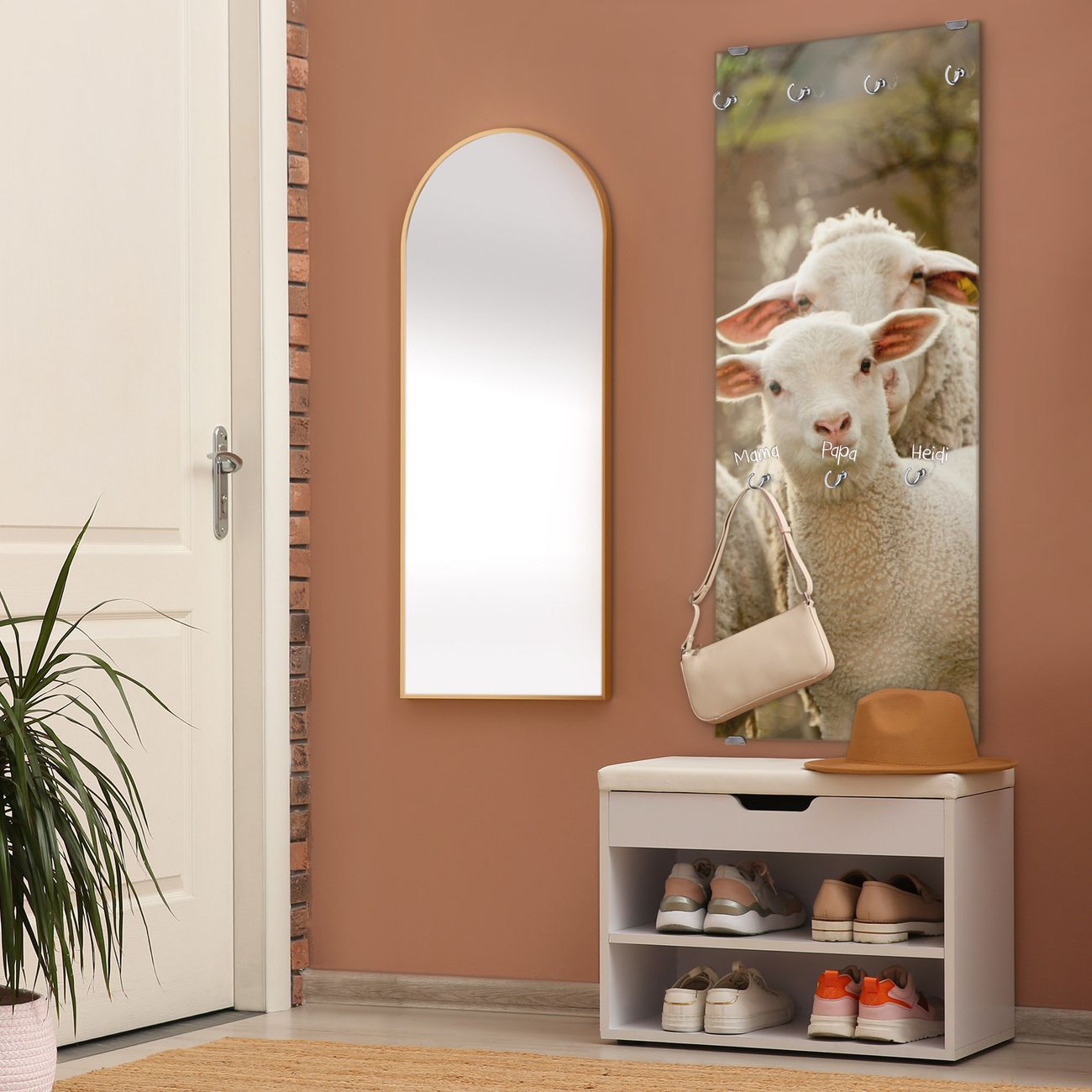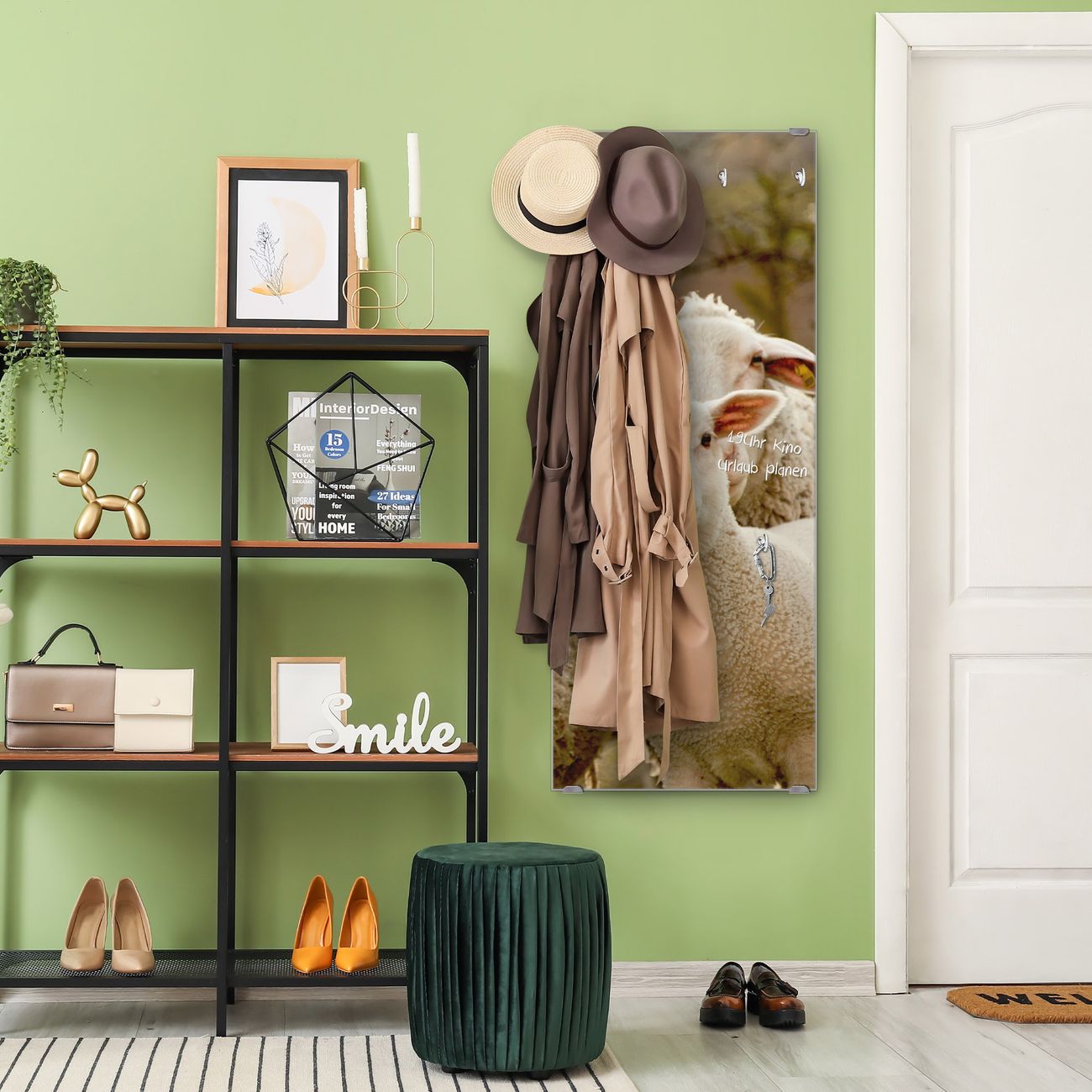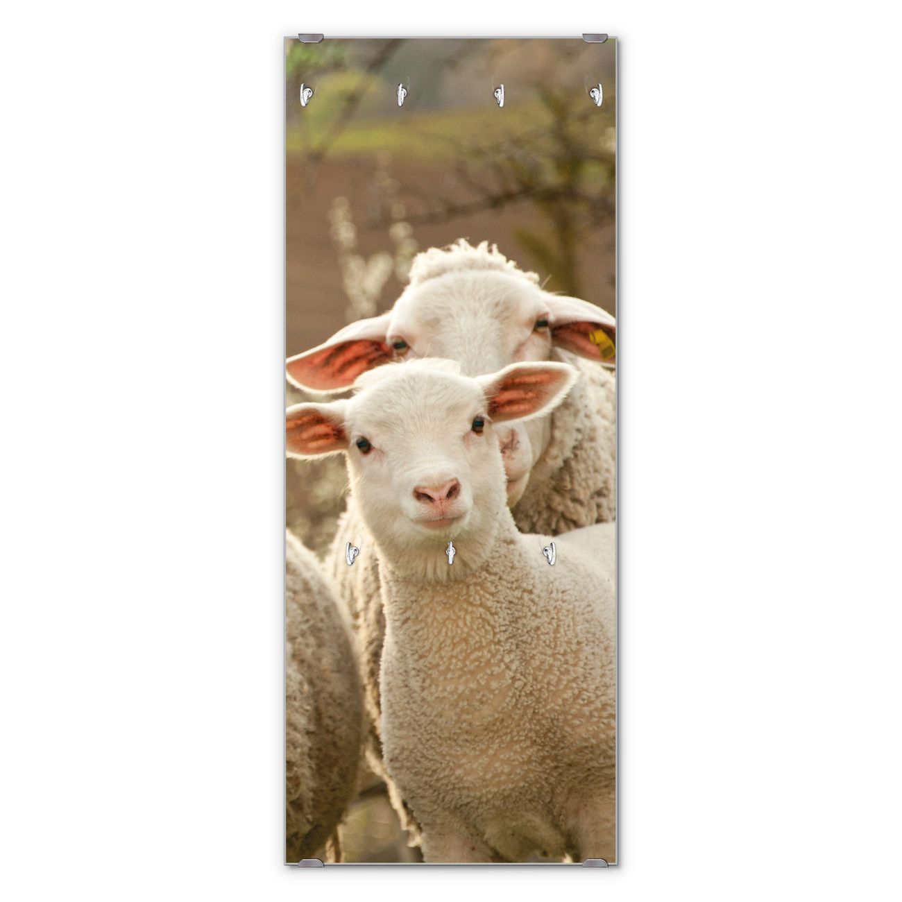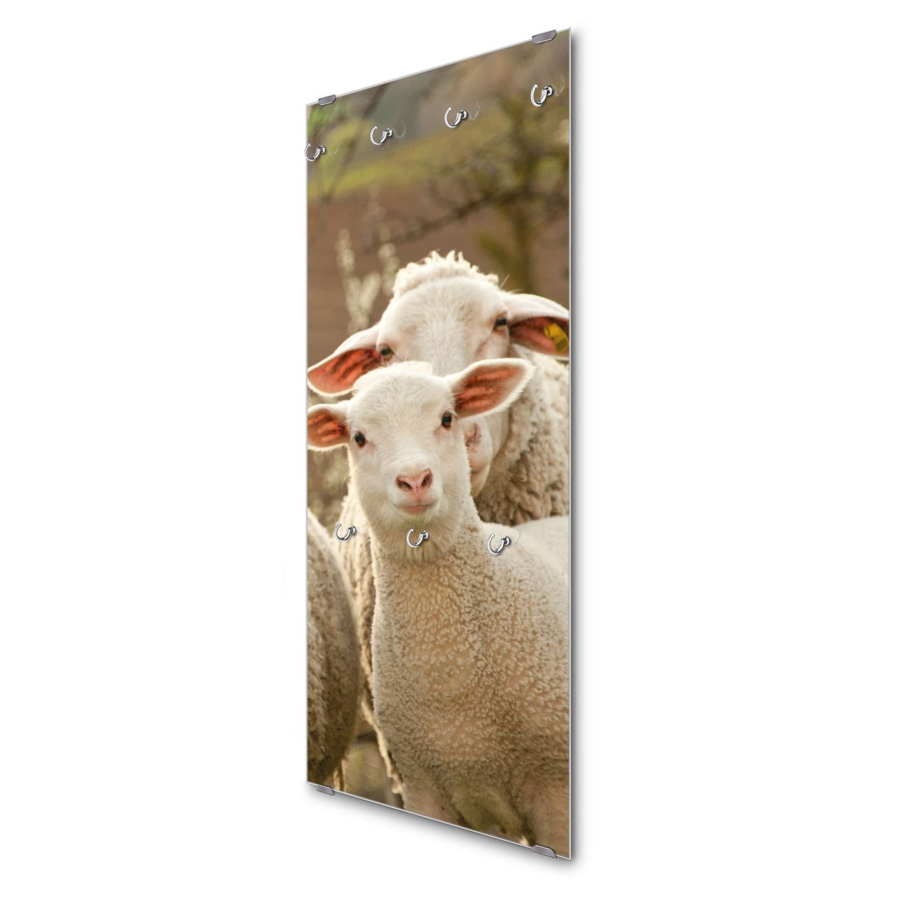 FUNKTION: Die banjado Wandgarderobe mit Motiv Schaffamilie ist Ihr täglicher Begleiter. Zuverlässig hängen hier Ihre Jacken und Mäntel griffbereit. Das Echtglas ist Ihr Paneel auch beschreibbar und wieder abwischbar. DESIGN: Sie erhalten eine Garderobenleiste aus elegantem Echtglas mit dem Farbbrillanten Motiv Schaffamilie hinterklebt. Das Design ist zeitlos klassisch, ohne dabei auf Funktionalität zu verzichten. Suchen Sie aus einer Vielzahl von Motiven das für Ihre Einrichtung Passende aus. DETAILS: Die Flurgarderobe besteht aus 4mm gehärtetem Sicherheitsglas. Sie ist 50cm breit, 125cm hoch und 6cm tief. Die Garderobenhaken zur Selbstmontage präsentieren sich in Edelstahl-Optik, ebenso die Abstandshalter für die Wandmontage. Ihre neue Garderobe ist sofort einsatzbereit. NUTZEN: Ihre neue Garderobe hält nicht nur zuverlässig Ihre Kleidung, sie ist auch optisch ein Blickfang. Durch das Glas können Sie an der Garderobe mit wasserlöslichen Kreidestiften oder Whiteboard-Markern auch Nachrichten hinterlassen. BANJADO: Wir sind ein kleines kreatives Team aus Sachsen und entwickeln Produkte die Design und Funktionalität verbinden sollen. Viel Freude mit Ihrer neuen Garderobe wünscht das banjado-Team!