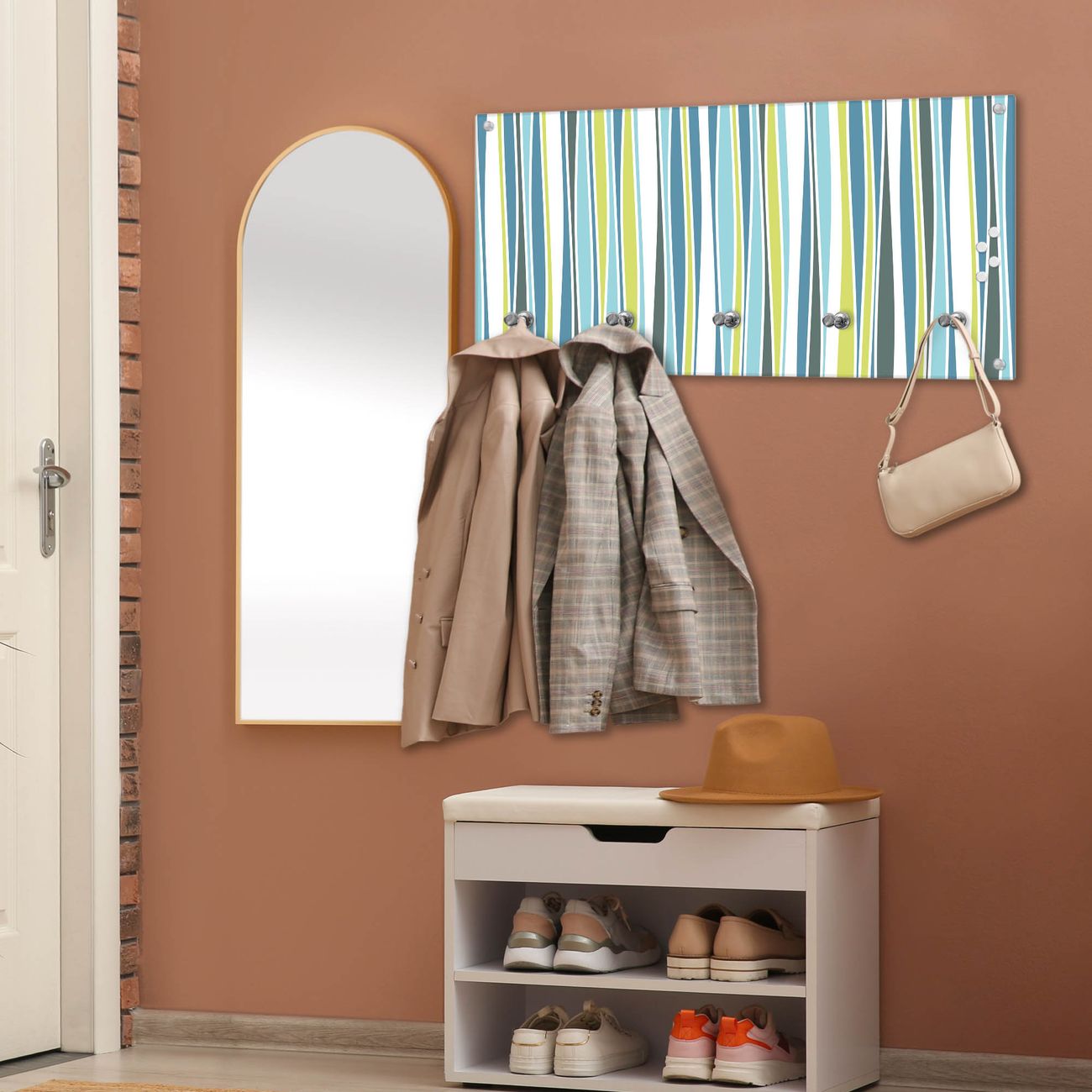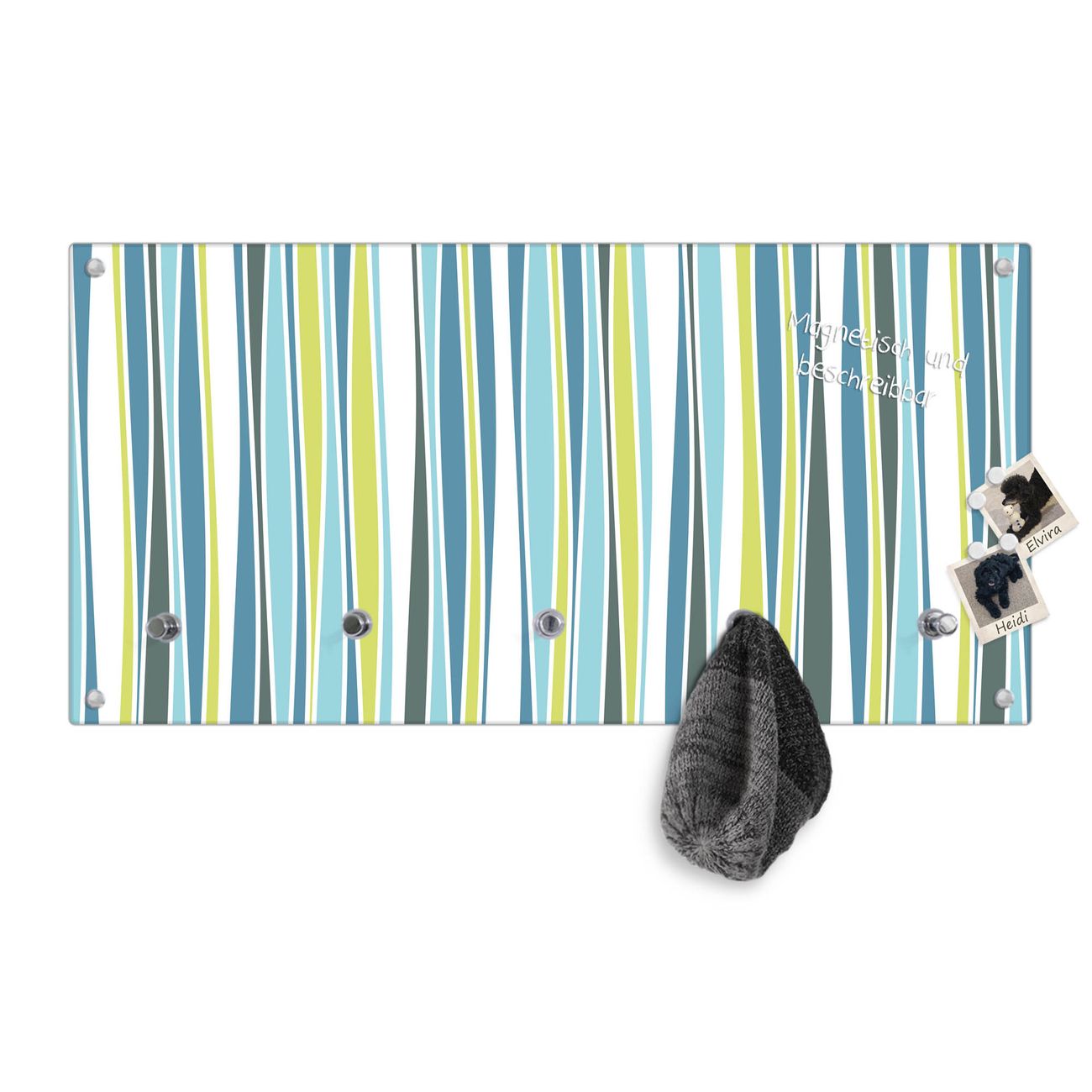 Bitte beachten Sie, dass an dieser Garderobe nur starke Neodym-Magnete halten! FUNKTION: Die banjado Wandgarderobe mit Motiv Schilf Abstrakt ist Ihr täglicher Begleiter. Zuverlässig hängen hier Ihre Jacken und Mäntel griffbereit. Gleichzeitig ist die Design Garderobe magnetisch, Sie können Notizen anheften und durch das Echtglas ist Ihr Paneel auch beschreibbar und wieder abwischbar. DESIGN: Sie erhalten eine Garderobenleiste aus elegantem Echtglas mit dem Farbbrillanten Motiv Schilf Abstrakt hinterklebt. Das Design ist zeitlos klassisch, ohne dabei auf Funktionalität zu verzichten. Suchen Sie aus einer Vielzahl von Motiven das für Ihre Einrichtung Passende aus. DETAILS: Die Flurgarderobe besteht aus 4mm gehärtetem Sicherheitsglas. Sie ist 80cm breit, 40cm hoch und 6cm tief. Die Garderobenhaken zur Selbstmontage präsentieren sich in Edelstahl-Optik, ebenso die Abstandshalter für die Wandmontage. Ihre neue Garderobe ist sofort einsatzbereit. NUTZEN: Ihre neue Garderobe hält nicht nur zuverlässig Ihre Kleidung, sie ist auch optisch ein Blickfang. Durch die magnetische Wirkung können Sie mit 4 beigefügten extrastarken Neodym-Magneten Notizen anheften und mit wasserlöslichen Kreidestiften oder Whiteboard-Markern auch Nachrichten hinterlassen. BANJADO: Wir sind ein kleines kreatives Team aus Sachsen und entwickeln Produkte die Design und Funktionalität verbinden sollen. Viel Freude mit Ihrer neuen Garderobe wünscht das banjado-Team!