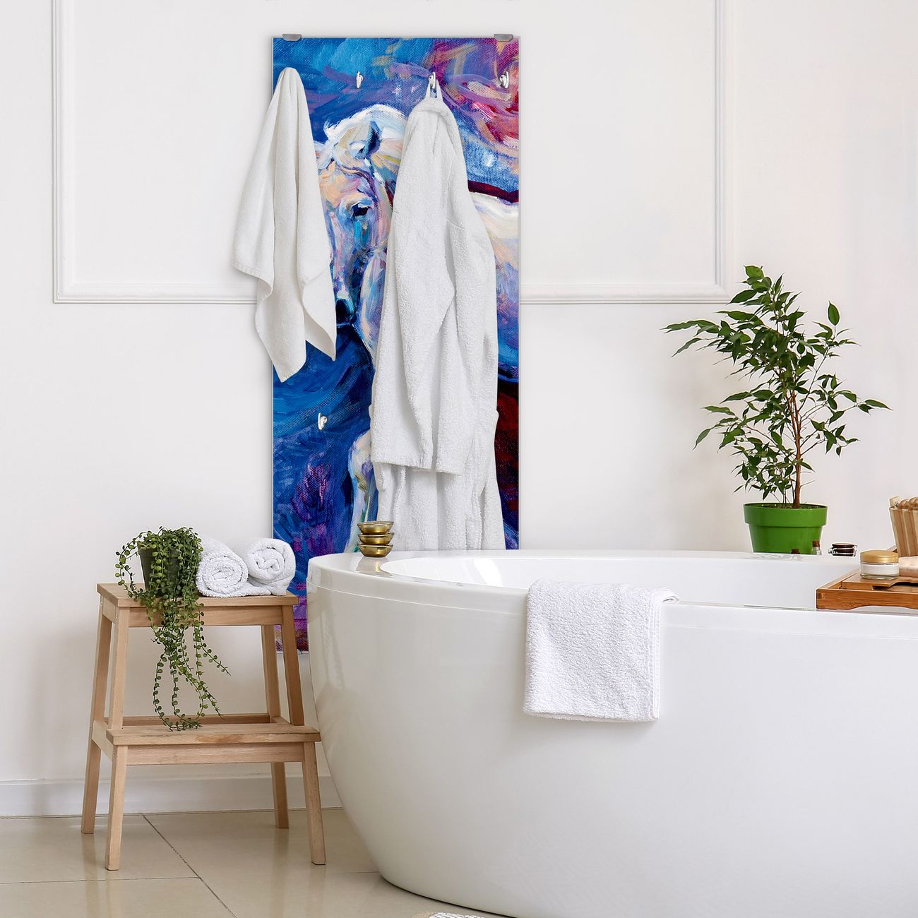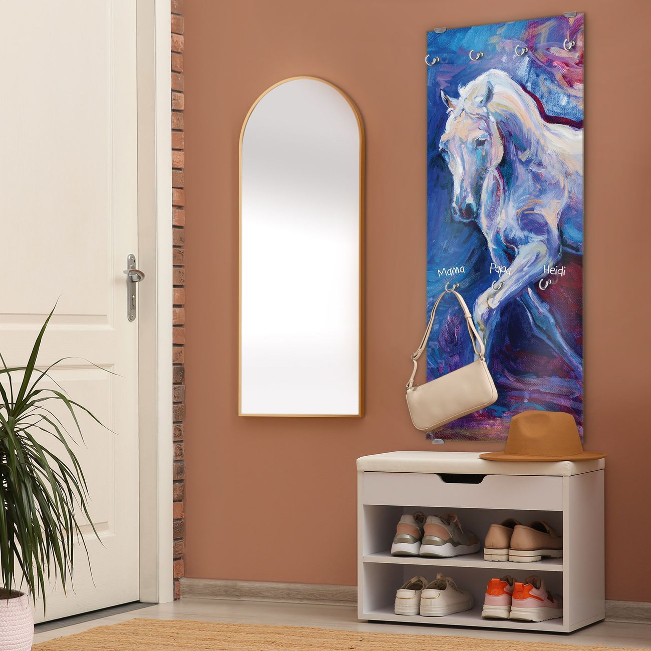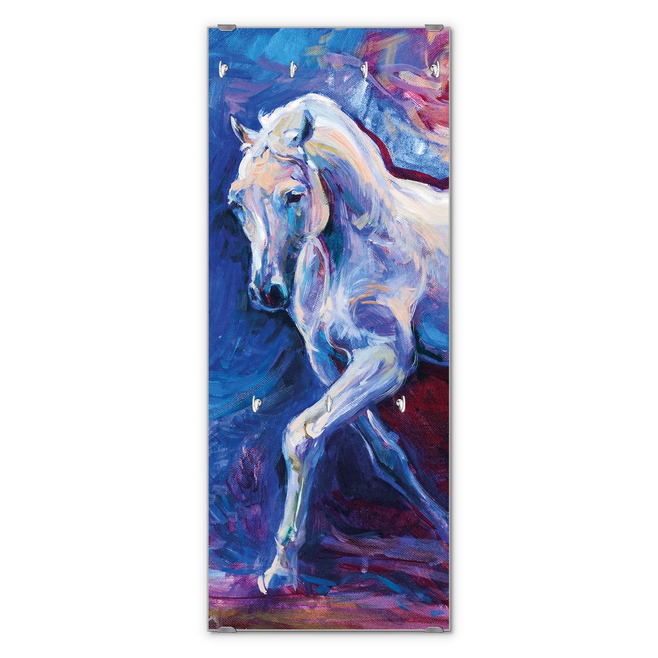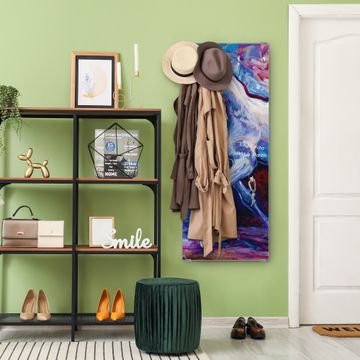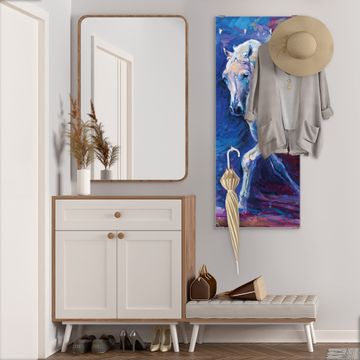 FUNKTION: Die banjado Wandgarderobe mit Motiv Schimmel ist Ihr täglicher Begleiter. Zuverlässig hängen hier Ihre Jacken und Mäntel griffbereit. Das Echtglas ist Ihr Paneel auch beschreibbar und wieder abwischbar. DESIGN: Sie erhalten eine Garderobenleiste aus elegantem Echtglas mit dem Farbbrillanten Motiv Schimmel hinterklebt. Das Design ist zeitlos klassisch, ohne dabei auf Funktionalität zu verzichten. Suchen Sie aus einer Vielzahl von Motiven das für Ihre Einrichtung Passende aus. DETAILS: Die Flurgarderobe besteht aus 4mm gehärtetem Sicherheitsglas. Sie ist 50cm breit, 125cm hoch und 6cm tief. Die Garderobenhaken zur Selbstmontage präsentieren sich in Edelstahl-Optik, ebenso die Abstandshalter für die Wandmontage. Ihre neue Garderobe ist sofort einsatzbereit. NUTZEN: Ihre neue Garderobe hält nicht nur zuverlässig Ihre Kleidung, sie ist auch optisch ein Blickfang. Durch das Glas können Sie an der Garderobe mit wasserlöslichen Kreidestiften oder Whiteboard-Markern auch Nachrichten hinterlassen. BANJADO: Wir sind ein kleines kreatives Team aus Sachsen und entwickeln Produkte die Design und Funktionalität verbinden sollen. Viel Freude mit Ihrer neuen Garderobe wünscht das banjado-Team!