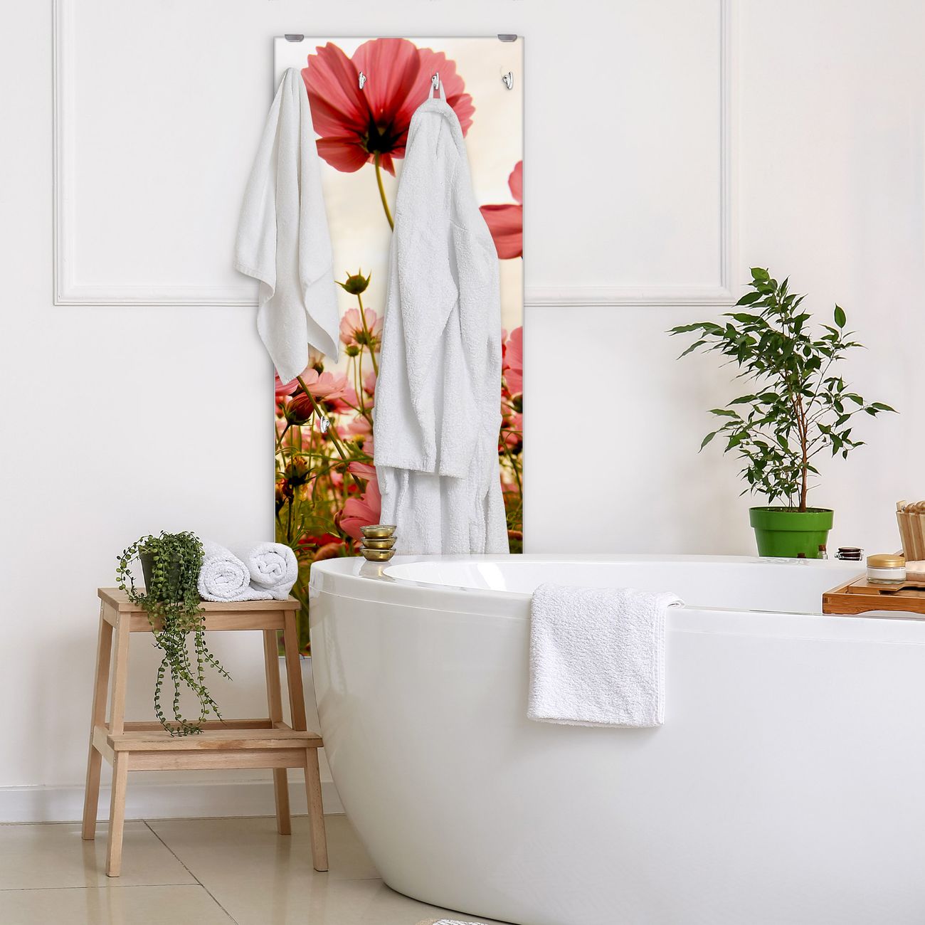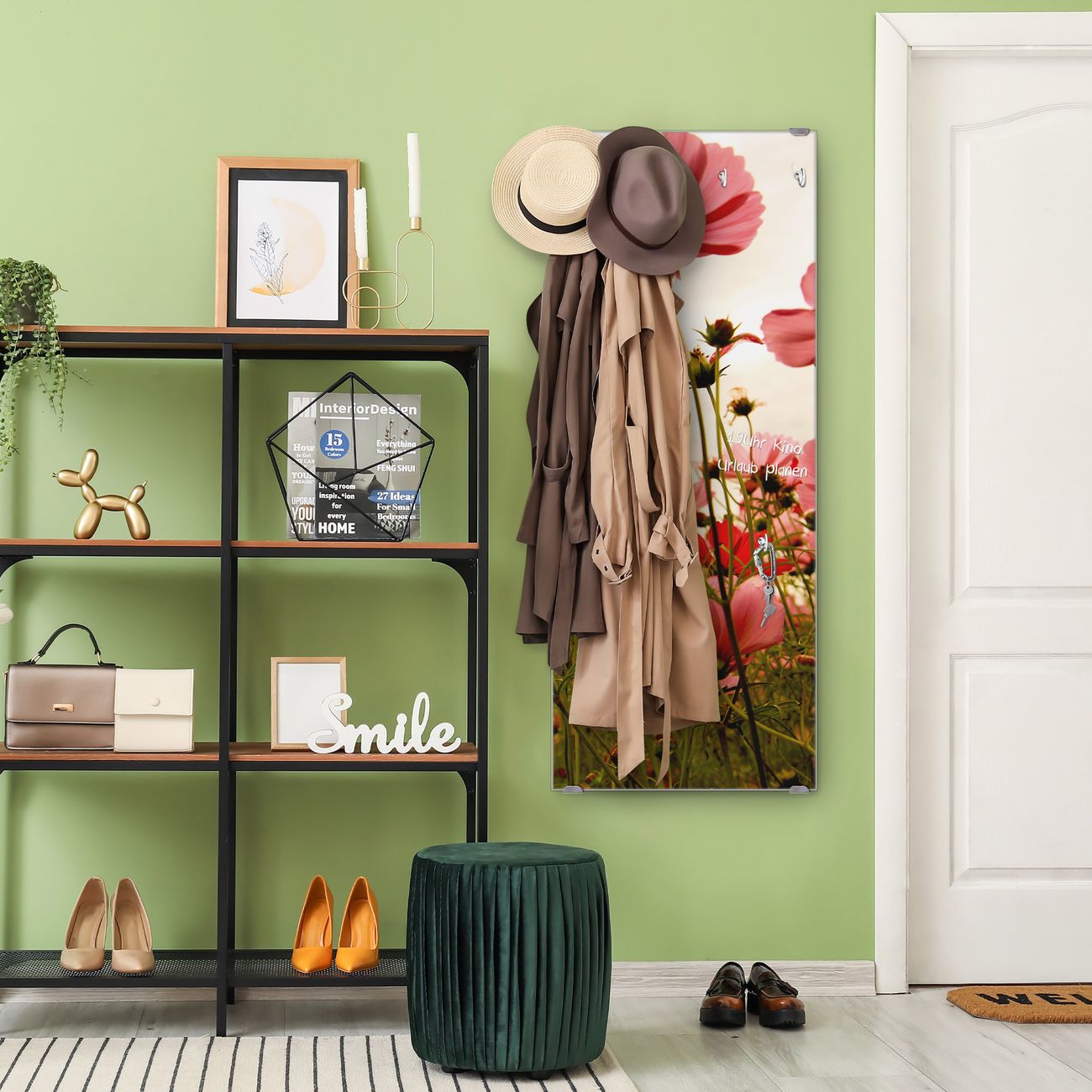 FUNKTION: Die banjado Wandgarderobe mit Motiv Schmuckkörbchen ist Ihr täglicher Begleiter. Zuverlässig hängen hier Ihre Jacken und Mäntel griffbereit. Das Echtglas ist Ihr Paneel auch beschreibbar und wieder abwischbar. DESIGN: Sie erhalten eine Garderobenleiste aus elegantem Echtglas mit dem Farbbrillanten Motiv Schmuckkörbchen hinterklebt. Das Design ist zeitlos klassisch, ohne dabei auf Funktionalität zu verzichten. Suchen Sie aus einer Vielzahl von Motiven das für Ihre Einrichtung Passende aus. DETAILS: Die Flurgarderobe besteht aus 4mm gehärtetem Sicherheitsglas. Sie ist 50cm breit, 125cm hoch und 6cm tief. Die Garderobenhaken zur Selbstmontage präsentieren sich in Edelstahl-Optik, ebenso die Abstandshalter für die Wandmontage. Ihre neue Garderobe ist sofort einsatzbereit. NUTZEN: Ihre neue Garderobe hält nicht nur zuverlässig Ihre Kleidung, sie ist auch optisch ein Blickfang. Durch das Glas können Sie an der Garderobe mit wasserlöslichen Kreidestiften oder Whiteboard-Markern auch Nachrichten hinterlassen. BANJADO: Wir sind ein kleines kreatives Team aus Sachsen und entwickeln Produkte die Design und Funktionalität verbinden sollen. Viel Freude mit Ihrer neuen Garderobe wünscht das banjado-Team!