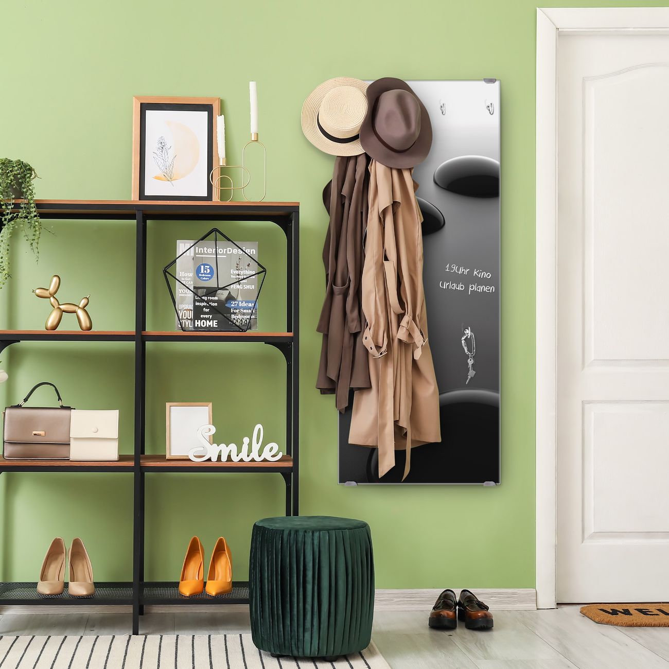 FUNKTION: Die banjado Wandgarderobe mit Motiv Schwarze Steine ist Ihr täglicher Begleiter. Zuverlässig hängen hier Ihre Jacken und Mäntel griffbereit. Das Echtglas ist Ihr Paneel auch beschreibbar und wieder abwischbar. DESIGN: Sie erhalten eine Garderobenleiste aus elegantem Echtglas mit dem Farbbrillanten Motiv Schwarze Steine hinterklebt. Das Design ist zeitlos klassisch, ohne dabei auf Funktionalität zu verzichten. Suchen Sie aus einer Vielzahl von Motiven das für Ihre Einrichtung Passende aus. DETAILS: Die Flurgarderobe besteht aus 4mm gehärtetem Sicherheitsglas. Sie ist 50cm breit, 125cm hoch und 6cm tief. Die Garderobenhaken zur Selbstmontage präsentieren sich in Edelstahl-Optik, ebenso die Abstandshalter für die Wandmontage. Ihre neue Garderobe ist sofort einsatzbereit. NUTZEN: Ihre neue Garderobe hält nicht nur zuverlässig Ihre Kleidung, sie ist auch optisch ein Blickfang. Durch das Glas können Sie an der Garderobe mit wasserlöslichen Kreidestiften oder Whiteboard-Markern auch Nachrichten hinterlassen. BANJADO: Wir sind ein kleines kreatives Team aus Sachsen und entwickeln Produkte die Design und Funktionalität verbinden sollen. Viel Freude mit Ihrer neuen Garderobe wünscht das banjado-Team!