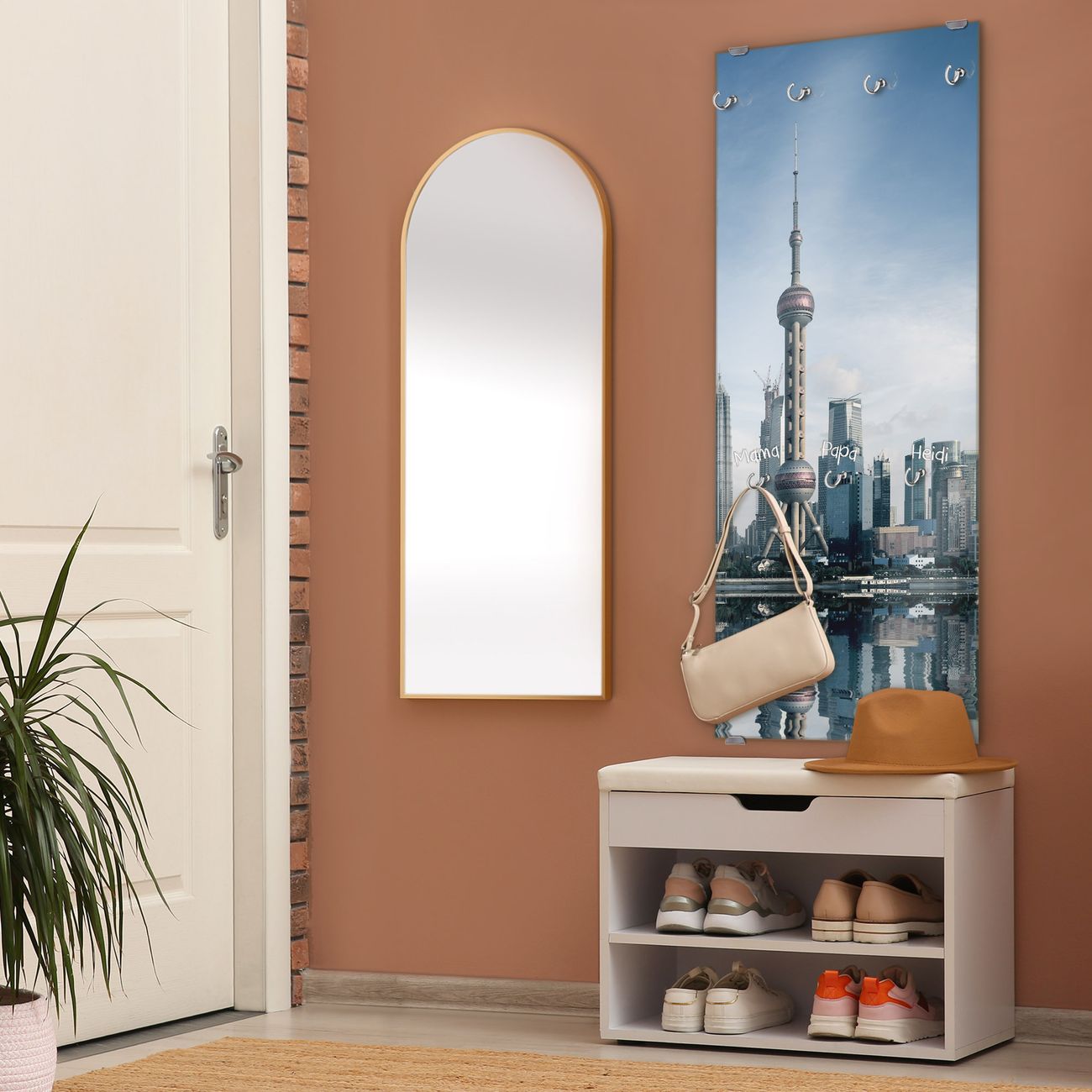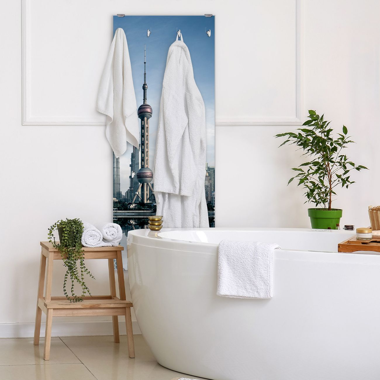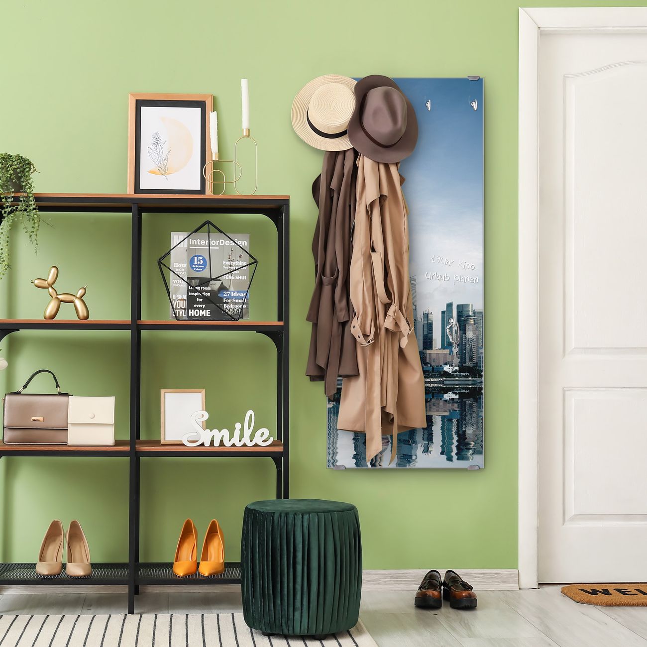 FUNKTION: Die banjado Wandgarderobe mit Motiv Shanghai ist Ihr täglicher Begleiter. Zuverlässig hängen hier Ihre Jacken und Mäntel griffbereit. Das Echtglas ist Ihr Paneel auch beschreibbar und wieder abwischbar. DESIGN: Sie erhalten eine Garderobenleiste aus elegantem Echtglas mit dem Farbbrillanten Motiv Shanghai hinterklebt. Das Design ist zeitlos klassisch, ohne dabei auf Funktionalität zu verzichten. Suchen Sie aus einer Vielzahl von Motiven das für Ihre Einrichtung Passende aus. DETAILS: Die Flurgarderobe besteht aus 4mm gehärtetem Sicherheitsglas. Sie ist 50cm breit, 125cm hoch und 6cm tief. Die Garderobenhaken zur Selbstmontage präsentieren sich in Edelstahl-Optik, ebenso die Abstandshalter für die Wandmontage. Ihre neue Garderobe ist sofort einsatzbereit. NUTZEN: Ihre neue Garderobe hält nicht nur zuverlässig Ihre Kleidung, sie ist auch optisch ein Blickfang. Durch das Glas können Sie an der Garderobe mit wasserlöslichen Kreidestiften oder Whiteboard-Markern auch Nachrichten hinterlassen. BANJADO: Wir sind ein kleines kreatives Team aus Sachsen und entwickeln Produkte die Design und Funktionalität verbinden sollen. Viel Freude mit Ihrer neuen Garderobe wünscht das banjado-Team!
