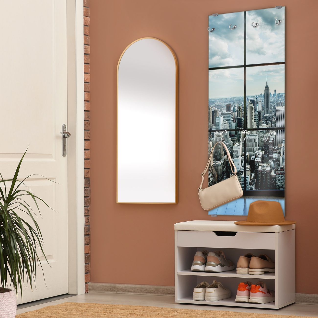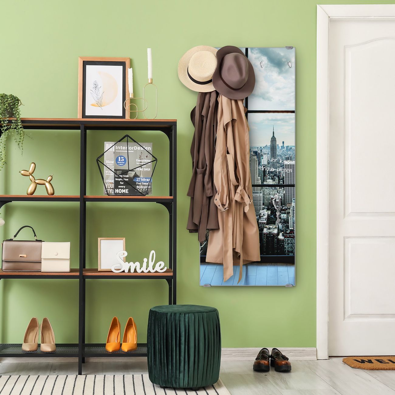 FUNKTION: Die banjado Wandgarderobe mit Motiv Skyline Manhattan ist Ihr täglicher Begleiter. Zuverlässig hängen hier Ihre Jacken und Mäntel griffbereit. Das Echtglas ist Ihr Paneel auch beschreibbar und wieder abwischbar. DESIGN: Sie erhalten eine Garderobenleiste aus elegantem Echtglas mit dem Farbbrillanten Motiv Skyline Manhattan hinterklebt. Das Design ist zeitlos klassisch, ohne dabei auf Funktionalität zu verzichten. Suchen Sie aus einer Vielzahl von Motiven das für Ihre Einrichtung Passende aus. DETAILS: Die Flurgarderobe besteht aus 4mm gehärtetem Sicherheitsglas. Sie ist 50cm breit, 125cm hoch und 6cm tief. Die Garderobenhaken zur Selbstmontage präsentieren sich in Edelstahl-Optik, ebenso die Abstandshalter für die Wandmontage. Ihre neue Garderobe ist sofort einsatzbereit. NUTZEN: Ihre neue Garderobe hält nicht nur zuverlässig Ihre Kleidung, sie ist auch optisch ein Blickfang. Durch das Glas können Sie an der Garderobe mit wasserlöslichen Kreidestiften oder Whiteboard-Markern auch Nachrichten hinterlassen. BANJADO: Wir sind ein kleines kreatives Team aus Sachsen und entwickeln Produkte die Design und Funktionalität verbinden sollen. Viel Freude mit Ihrer neuen Garderobe wünscht das banjado-Team!