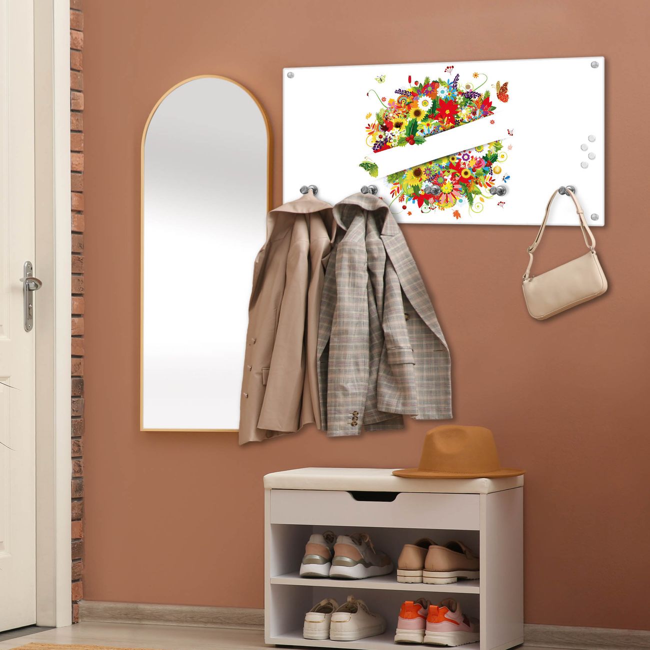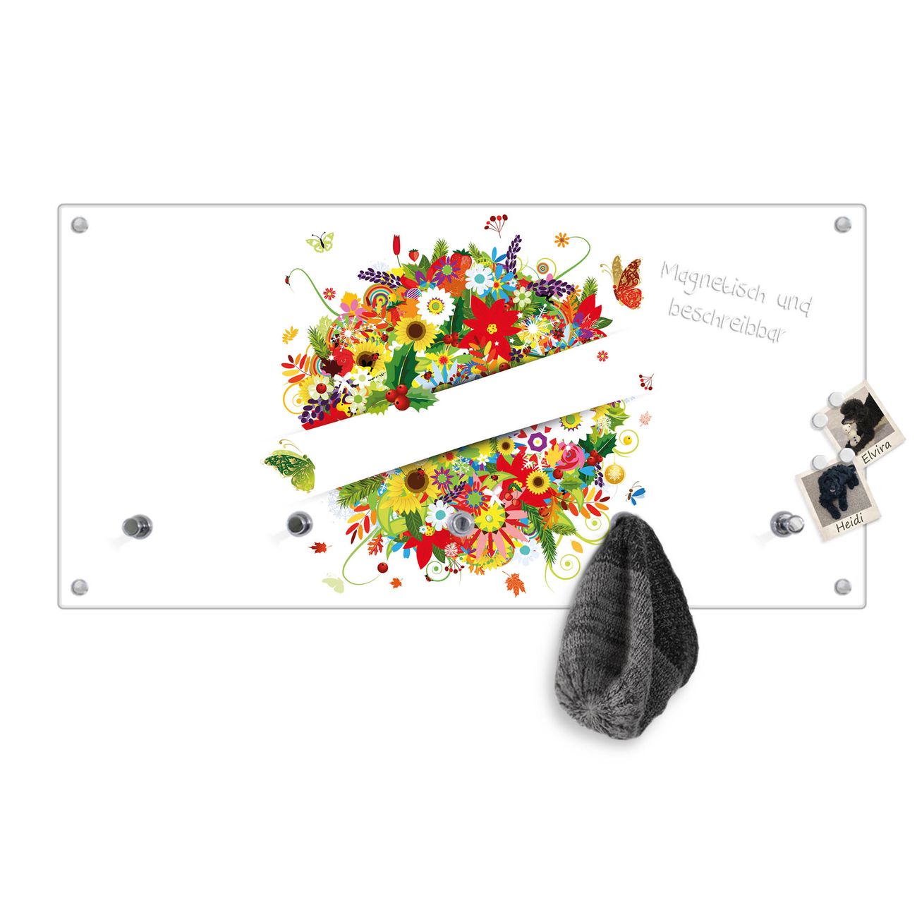 Bitte beachten Sie, dass an dieser Garderobe nur starke Neodym-Magnete halten! FUNKTION: Die banjado Wandgarderobe mit Motiv Sommer ist Ihr täglicher Begleiter. Zuverlässig hängen hier Ihre Jacken und Mäntel griffbereit. Gleichzeitig ist die Design Garderobe magnetisch, Sie können Notizen anheften und durch das Echtglas ist Ihr Paneel auch beschreibbar und wieder abwischbar. DESIGN: Sie erhalten eine Garderobenleiste aus elegantem Echtglas mit dem Farbbrillanten Motiv Sommer hinterklebt. Das Design ist zeitlos klassisch, ohne dabei auf Funktionalität zu verzichten. Suchen Sie aus einer Vielzahl von Motiven das für Ihre Einrichtung Passende aus. DETAILS: Die Flurgarderobe besteht aus 4mm gehärtetem Sicherheitsglas. Sie ist 80cm breit, 40cm hoch und 6cm tief. Die Garderobenhaken zur Selbstmontage präsentieren sich in Edelstahl-Optik, ebenso die Abstandshalter für die Wandmontage. Ihre neue Garderobe ist sofort einsatzbereit. NUTZEN: Ihre neue Garderobe hält nicht nur zuverlässig Ihre Kleidung, sie ist auch optisch ein Blickfang. Durch die magnetische Wirkung können Sie mit 4 beigefügten extrastarken Neodym-Magneten Notizen anheften und mit wasserlöslichen Kreidestiften oder Whiteboard-Markern auch Nachrichten hinterlassen. BANJADO: Wir sind ein kleines kreatives Team aus Sachsen und entwickeln Produkte die Design und Funktionalität verbinden sollen. Viel Freude mit Ihrer neuen Garderobe wünscht das banjado-Team!