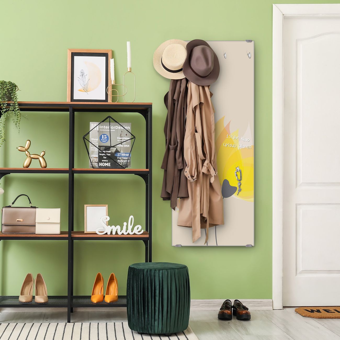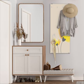 FUNKTION: Die banjado Wandgarderobe mit Motiv Sommerblüten ist Ihr täglicher Begleiter. Zuverlässig hängen hier Ihre Jacken und Mäntel griffbereit. Das Echtglas ist Ihr Paneel auch beschreibbar und wieder abwischbar. DESIGN: Sie erhalten eine Garderobenleiste aus elegantem Echtglas mit dem Farbbrillanten Motiv Sommerblüten hinterklebt. Das Design ist zeitlos klassisch, ohne dabei auf Funktionalität zu verzichten. Suchen Sie aus einer Vielzahl von Motiven das für Ihre Einrichtung Passende aus. DETAILS: Die Flurgarderobe besteht aus 4mm gehärtetem Sicherheitsglas. Sie ist 50cm breit, 125cm hoch und 6cm tief. Die Garderobenhaken zur Selbstmontage präsentieren sich in Edelstahl-Optik, ebenso die Abstandshalter für die Wandmontage. Ihre neue Garderobe ist sofort einsatzbereit. NUTZEN: Ihre neue Garderobe hält nicht nur zuverlässig Ihre Kleidung, sie ist auch optisch ein Blickfang. Durch das Glas können Sie an der Garderobe mit wasserlöslichen Kreidestiften oder Whiteboard-Markern auch Nachrichten hinterlassen. BANJADO: Wir sind ein kleines kreatives Team aus Sachsen und entwickeln Produkte die Design und Funktionalität verbinden sollen. Viel Freude mit Ihrer neuen Garderobe wünscht das banjado-Team!