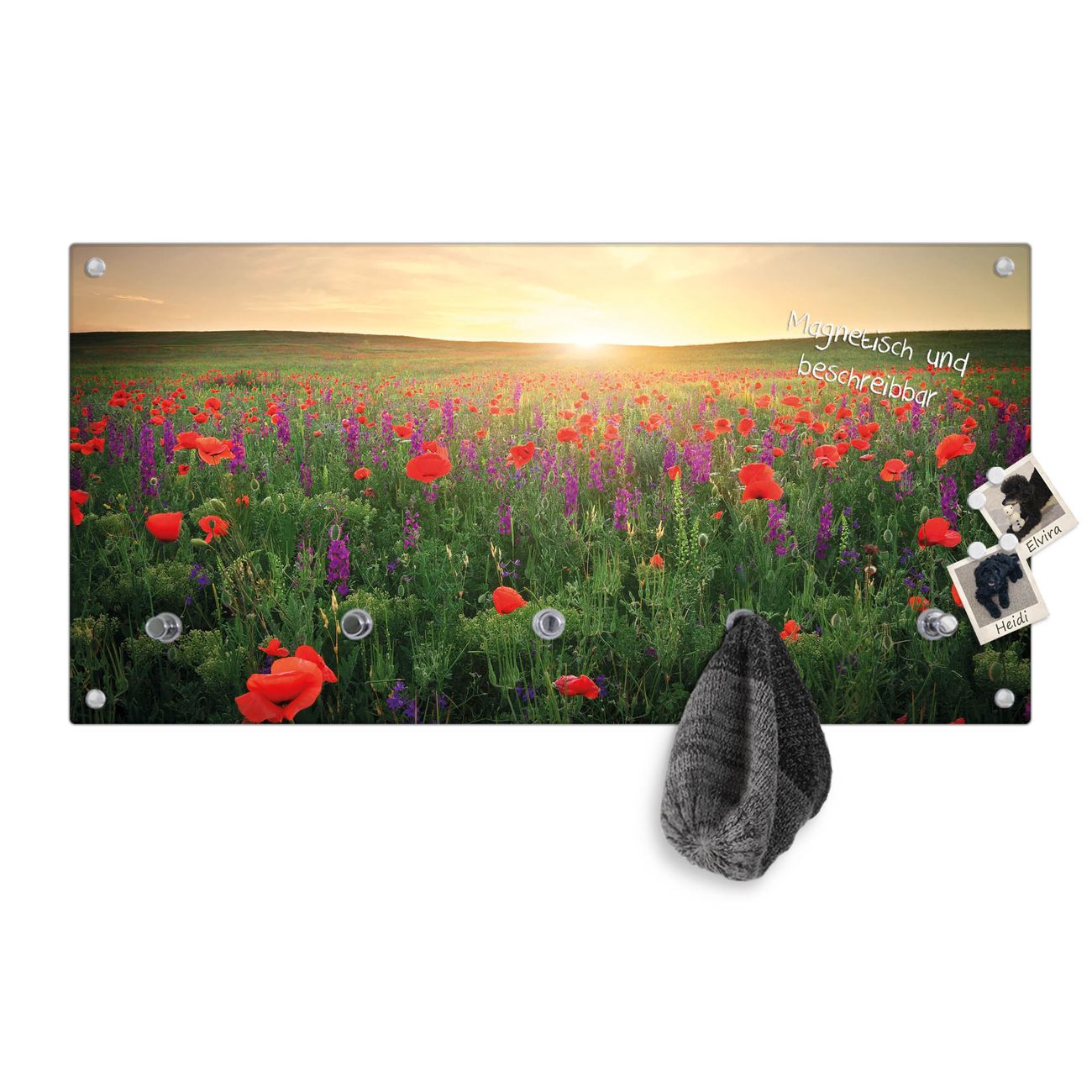 Bitte beachten Sie, dass an dieser Garderobe nur starke Neodym-Magnete halten! FUNKTION: Die banjado Wandgarderobe mit Motiv Sommerfeld ist Ihr täglicher Begleiter. Zuverlässig hängen hier Ihre Jacken und Mäntel griffbereit. Gleichzeitig ist die Design Garderobe magnetisch, Sie können Notizen anheften und durch das Echtglas ist Ihr Paneel auch beschreibbar und wieder abwischbar. DESIGN: Sie erhalten eine Garderobenleiste aus elegantem Echtglas mit dem Farbbrillanten Motiv Sommerfeld hinterklebt. Das Design ist zeitlos klassisch, ohne dabei auf Funktionalität zu verzichten. Suchen Sie aus einer Vielzahl von Motiven das für Ihre Einrichtung Passende aus. DETAILS: Die Flurgarderobe besteht aus 4mm gehärtetem Sicherheitsglas. Sie ist 80cm breit, 40cm hoch und 6cm tief. Die Garderobenhaken zur Selbstmontage präsentieren sich in Edelstahl-Optik, ebenso die Abstandshalter für die Wandmontage. Ihre neue Garderobe ist sofort einsatzbereit. NUTZEN: Ihre neue Garderobe hält nicht nur zuverlässig Ihre Kleidung, sie ist auch optisch ein Blickfang. Durch die magnetische Wirkung können Sie mit 4 beigefügten extrastarken Neodym-Magneten Notizen anheften und mit wasserlöslichen Kreidestiften oder Whiteboard-Markern auch Nachrichten hinterlassen. BANJADO: Wir sind ein kleines kreatives Team aus Sachsen und entwickeln Produkte die Design und Funktionalität verbinden sollen. Viel Freude mit Ihrer neuen Garderobe wünscht das banjado-Team!