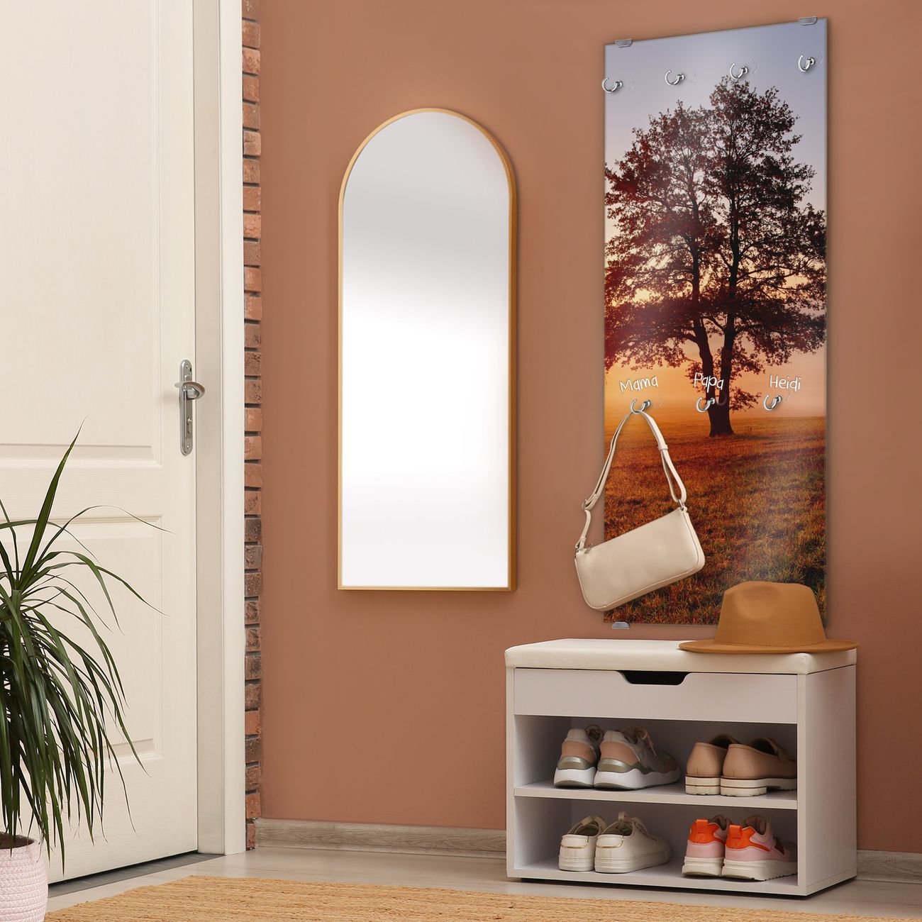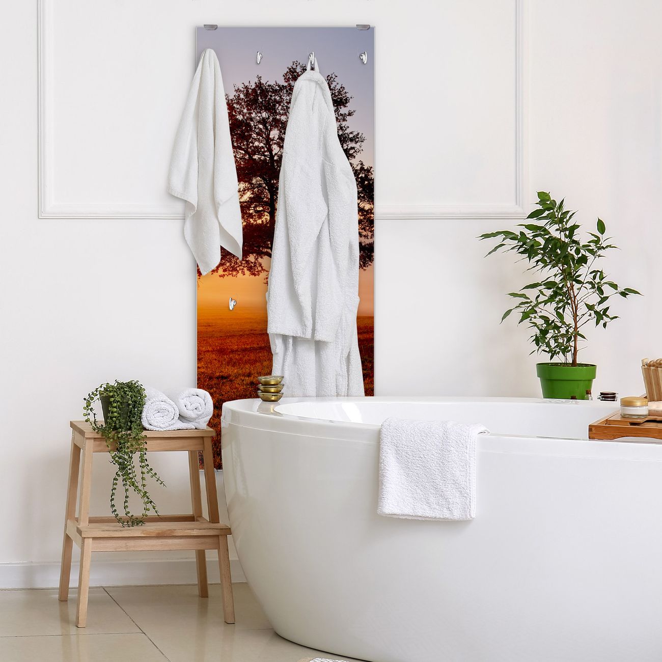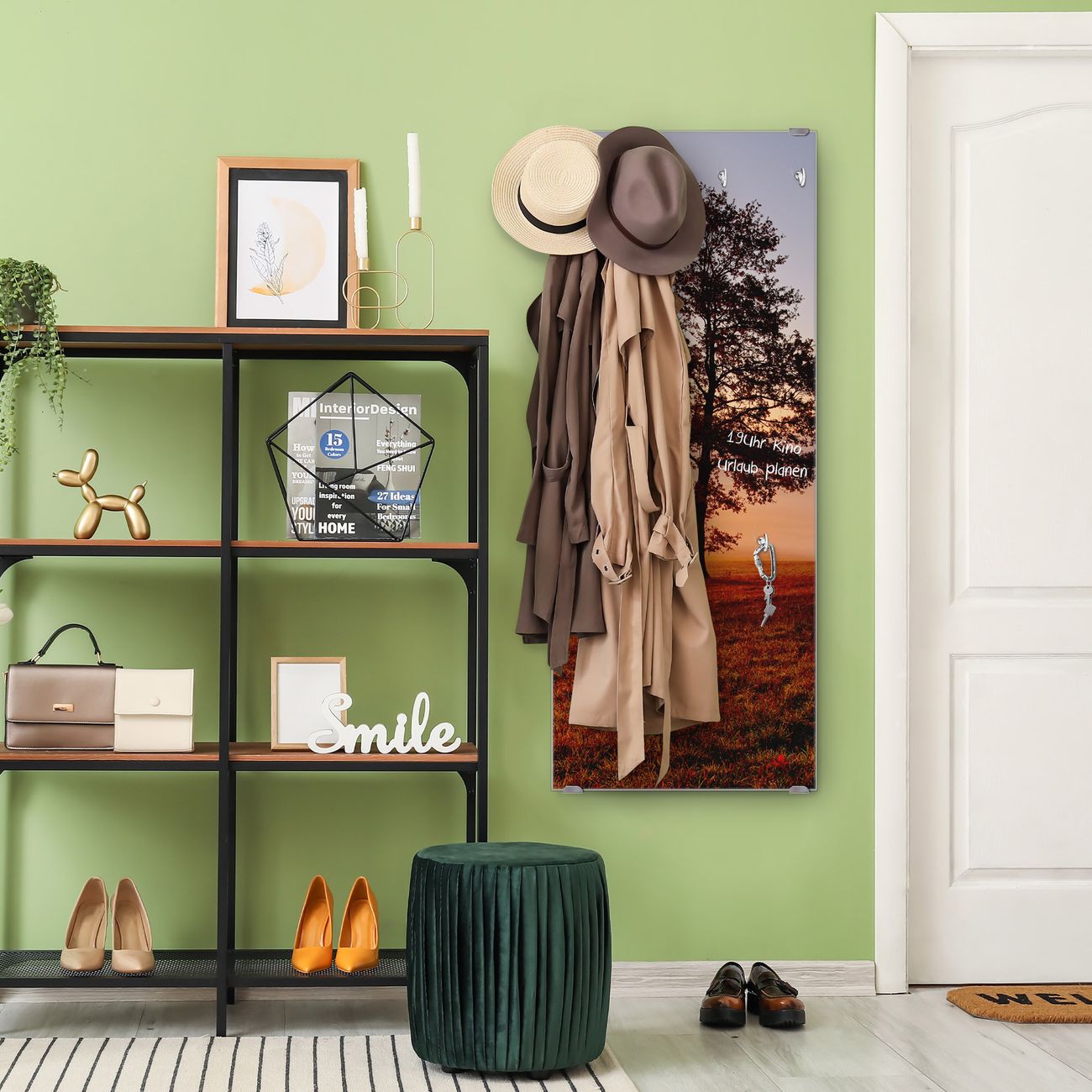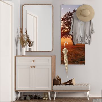 FUNKTION: Die banjado Wandgarderobe mit Motiv Sonnenaufgang ist Ihr täglicher Begleiter. Zuverlässig hängen hier Ihre Jacken und Mäntel griffbereit. Das Echtglas ist Ihr Paneel auch beschreibbar und wieder abwischbar. DESIGN: Sie erhalten eine Garderobenleiste aus elegantem Echtglas mit dem Farbbrillanten Motiv Sonnenaufgang hinterklebt. Das Design ist zeitlos klassisch, ohne dabei auf Funktionalität zu verzichten. Suchen Sie aus einer Vielzahl von Motiven das für Ihre Einrichtung Passende aus. DETAILS: Die Flurgarderobe besteht aus 4mm gehärtetem Sicherheitsglas. Sie ist 50cm breit, 125cm hoch und 6cm tief. Die Garderobenhaken zur Selbstmontage präsentieren sich in Edelstahl-Optik, ebenso die Abstandshalter für die Wandmontage. Ihre neue Garderobe ist sofort einsatzbereit. NUTZEN: Ihre neue Garderobe hält nicht nur zuverlässig Ihre Kleidung, sie ist auch optisch ein Blickfang. Durch das Glas können Sie an der Garderobe mit wasserlöslichen Kreidestiften oder Whiteboard-Markern auch Nachrichten hinterlassen. BANJADO: Wir sind ein kleines kreatives Team aus Sachsen und entwickeln Produkte die Design und Funktionalität verbinden sollen. Viel Freude mit Ihrer neuen Garderobe wünscht das banjado-Team!
