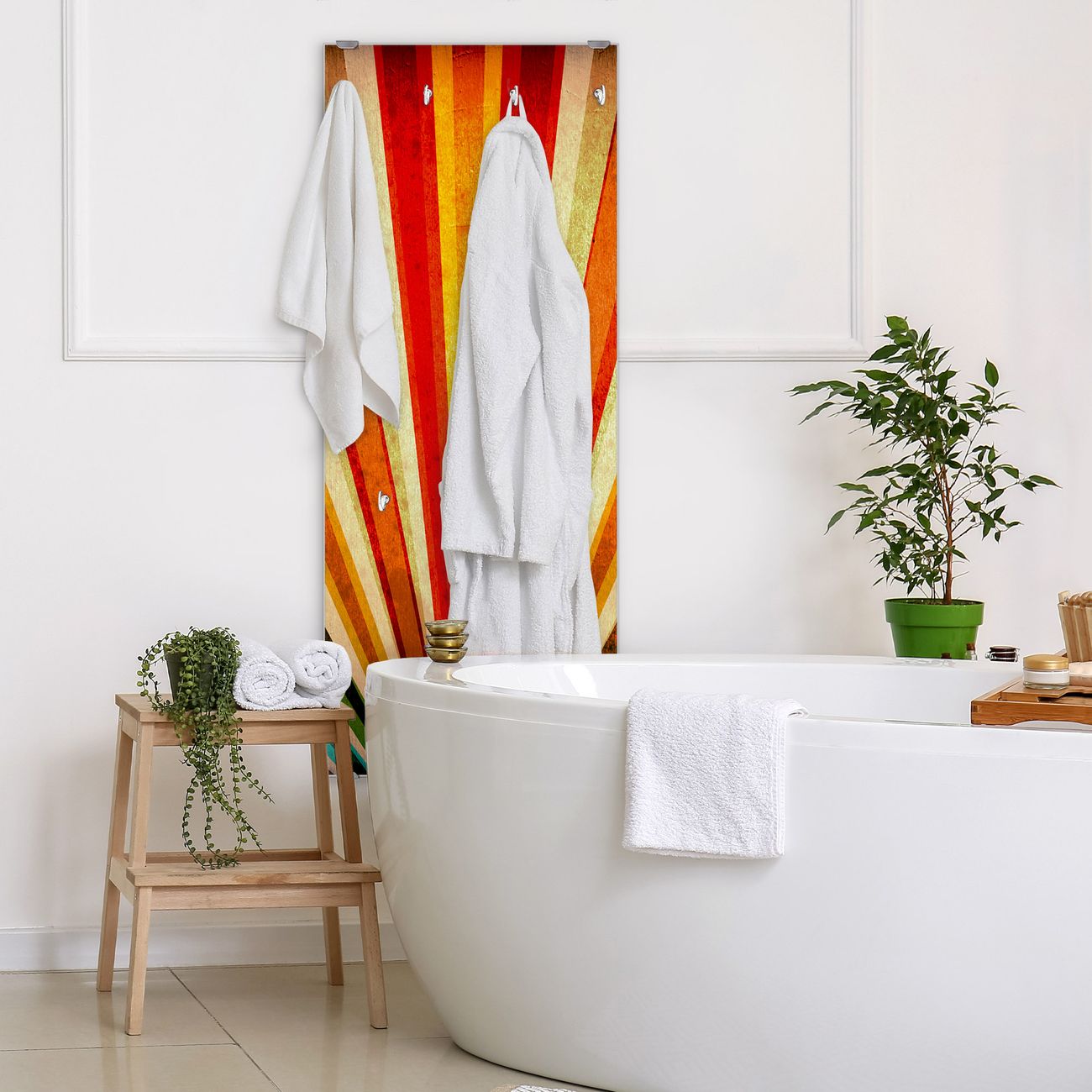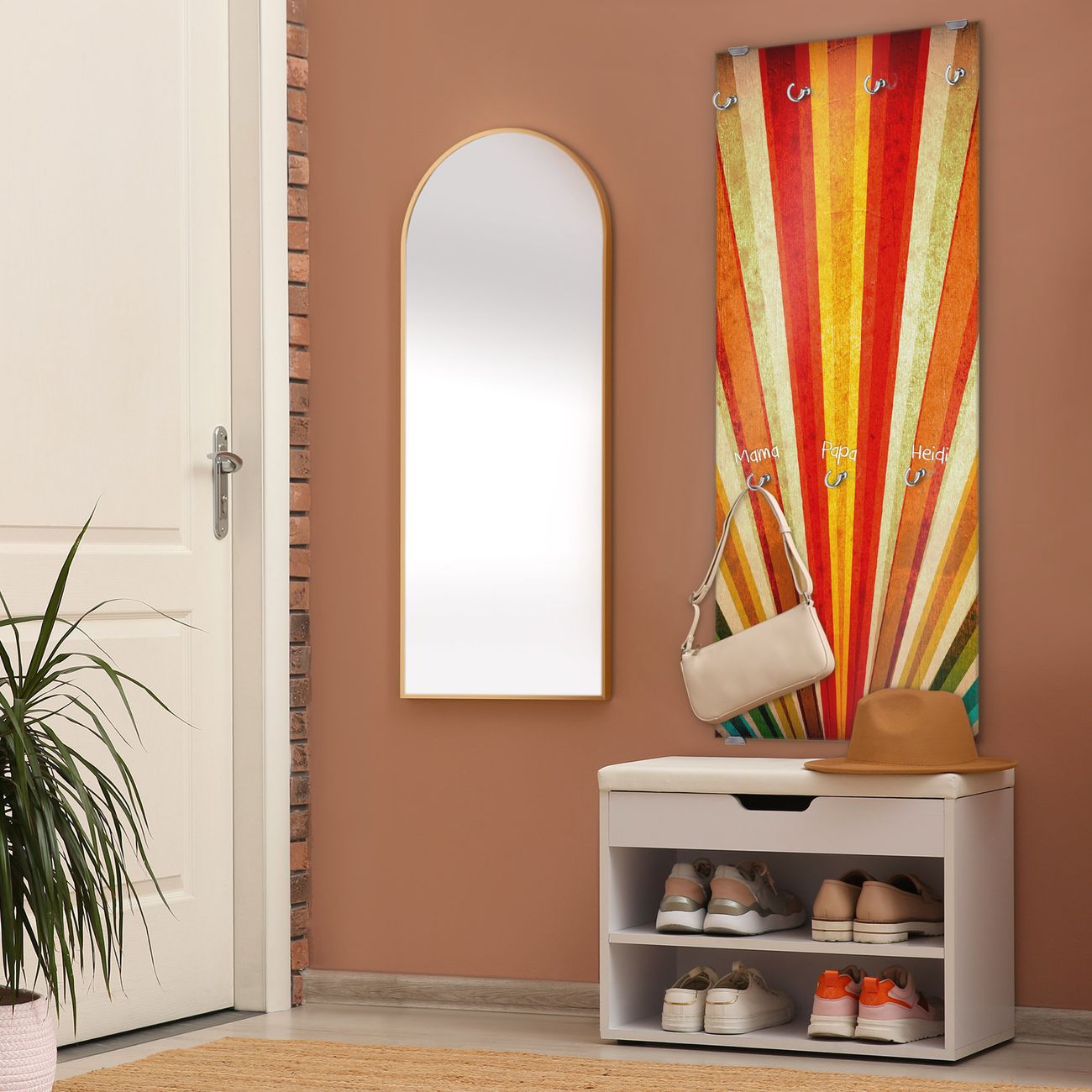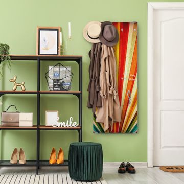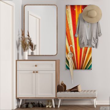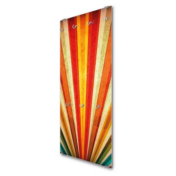 FUNKTION: Die banjado Wandgarderobe mit Motiv Sonnenuntergang Abstrakt ist Ihr täglicher Begleiter. Zuverlässig hängen hier Ihre Jacken und Mäntel griffbereit. Das Echtglas ist Ihr Paneel auch beschreibbar und wieder abwischbar. DESIGN: Sie erhalten eine Garderobenleiste aus elegantem Echtglas mit dem Farbbrillanten Motiv Sonnenuntergang Abstrakt hinterklebt. Das Design ist zeitlos klassisch, ohne dabei auf Funktionalität zu verzichten. Suchen Sie aus einer Vielzahl von Motiven das für Ihre Einrichtung Passende aus. DETAILS: Die Flurgarderobe besteht aus 4mm gehärtetem Sicherheitsglas. Sie ist 50cm breit, 125cm hoch und 6cm tief. Die Garderobenhaken zur Selbstmontage präsentieren sich in Edelstahl-Optik, ebenso die Abstandshalter für die Wandmontage. Ihre neue Garderobe ist sofort einsatzbereit. NUTZEN: Ihre neue Garderobe hält nicht nur zuverlässig Ihre Kleidung, sie ist auch optisch ein Blickfang. Durch das Glas können Sie an der Garderobe mit wasserlöslichen Kreidestiften oder Whiteboard-Markern auch Nachrichten hinterlassen. BANJADO: Wir sind ein kleines kreatives Team aus Sachsen und entwickeln Produkte die Design und Funktionalität verbinden sollen. Viel Freude mit Ihrer neuen Garderobe wünscht das banjado-Team!