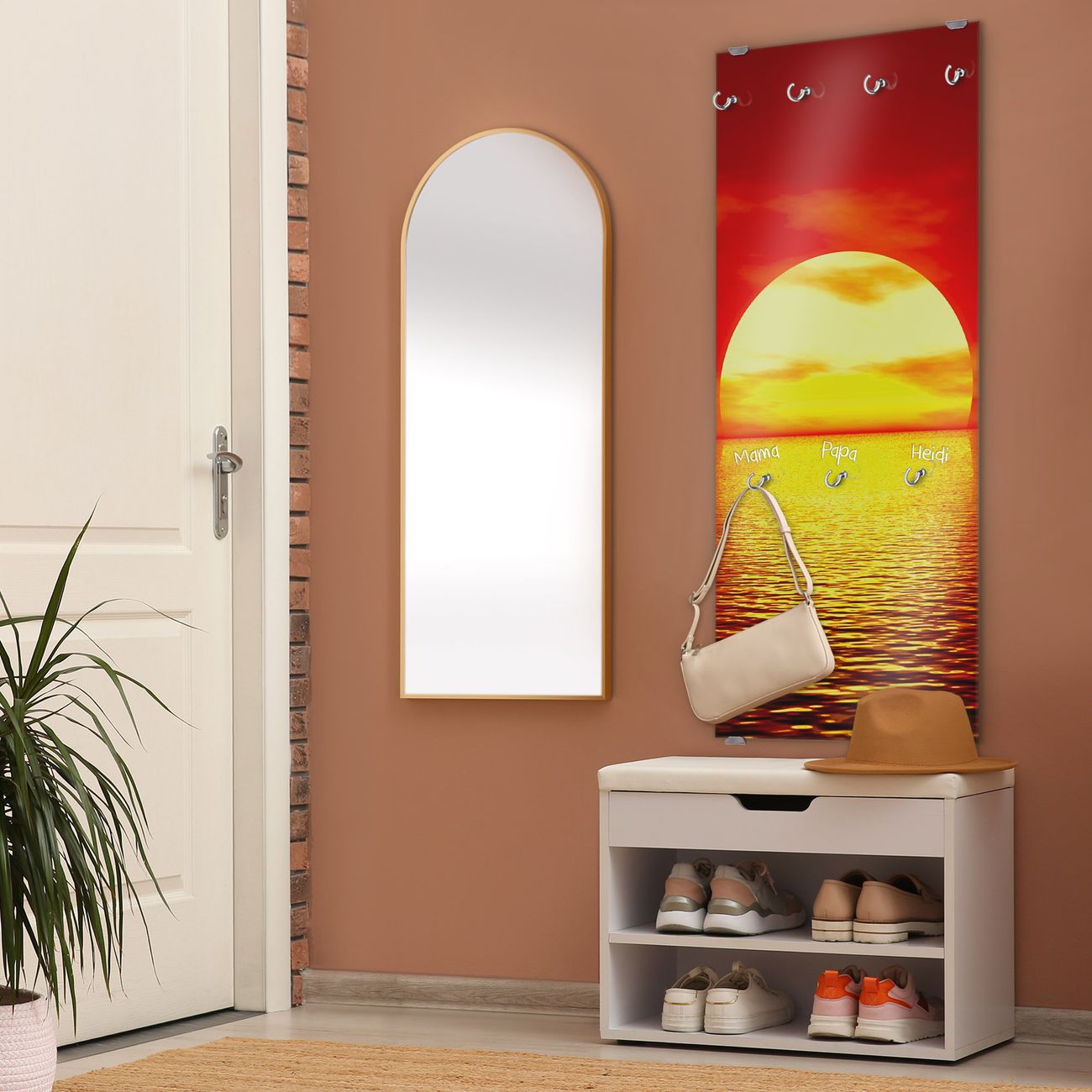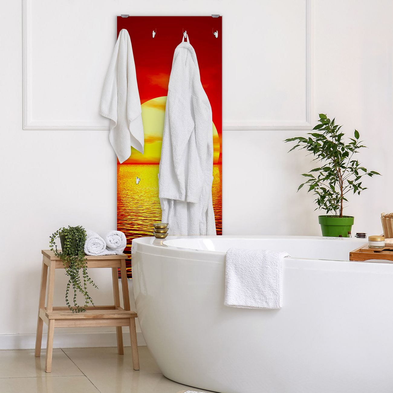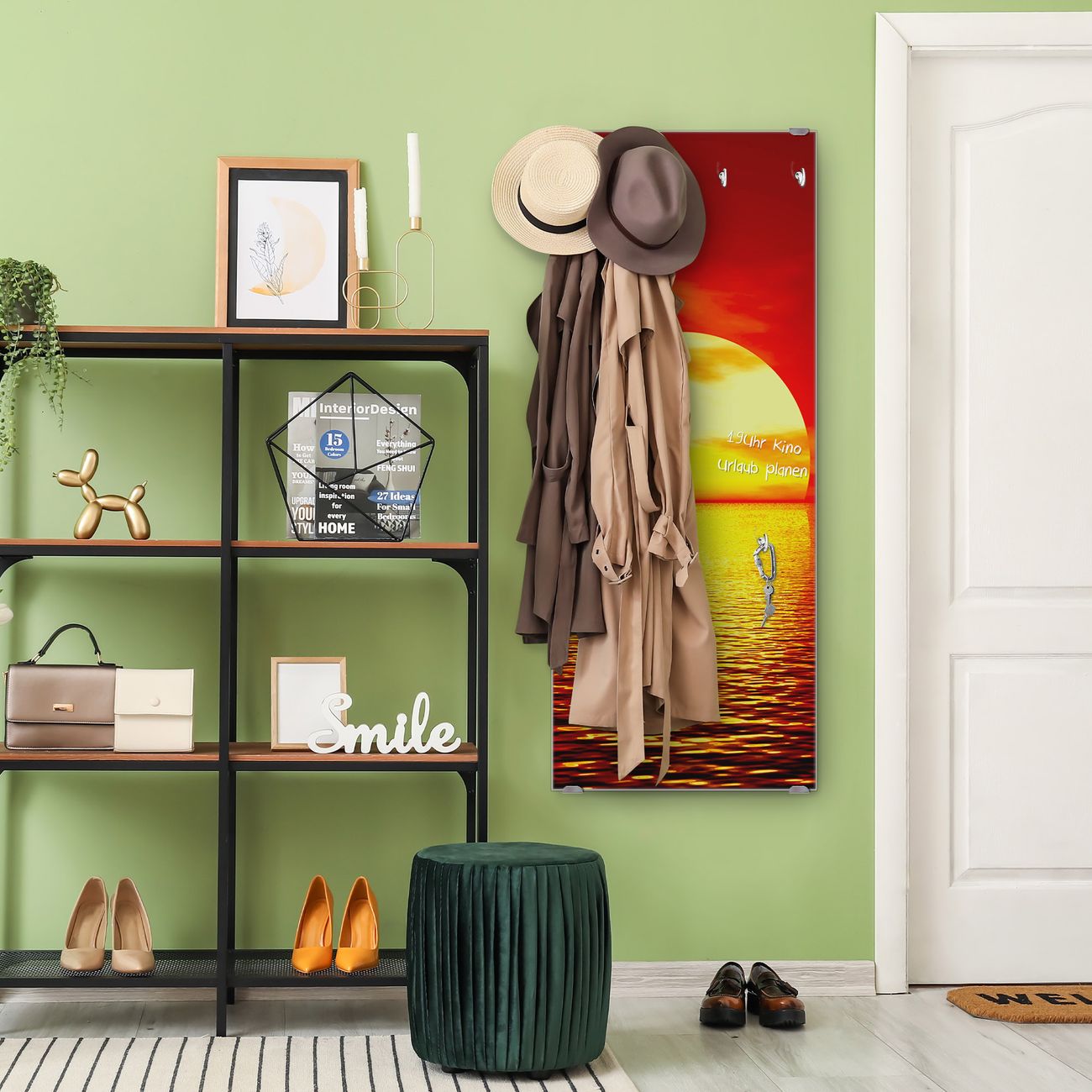 FUNKTION: Die banjado Wandgarderobe mit Motiv Sonnenuntergang ist Ihr täglicher Begleiter. Zuverlässig hängen hier Ihre Jacken und Mäntel griffbereit. Das Echtglas ist Ihr Paneel auch beschreibbar und wieder abwischbar. DESIGN: Sie erhalten eine Garderobenleiste aus elegantem Echtglas mit dem Farbbrillanten Motiv Sonnenuntergang hinterklebt. Das Design ist zeitlos klassisch, ohne dabei auf Funktionalität zu verzichten. Suchen Sie aus einer Vielzahl von Motiven das für Ihre Einrichtung Passende aus. DETAILS: Die Flurgarderobe besteht aus 4mm gehärtetem Sicherheitsglas. Sie ist 50cm breit, 125cm hoch und 6cm tief. Die Garderobenhaken zur Selbstmontage präsentieren sich in Edelstahl-Optik, ebenso die Abstandshalter für die Wandmontage. Ihre neue Garderobe ist sofort einsatzbereit. NUTZEN: Ihre neue Garderobe hält nicht nur zuverlässig Ihre Kleidung, sie ist auch optisch ein Blickfang. Durch das Glas können Sie an der Garderobe mit wasserlöslichen Kreidestiften oder Whiteboard-Markern auch Nachrichten hinterlassen. BANJADO: Wir sind ein kleines kreatives Team aus Sachsen und entwickeln Produkte die Design und Funktionalität verbinden sollen. Viel Freude mit Ihrer neuen Garderobe wünscht das banjado-Team!