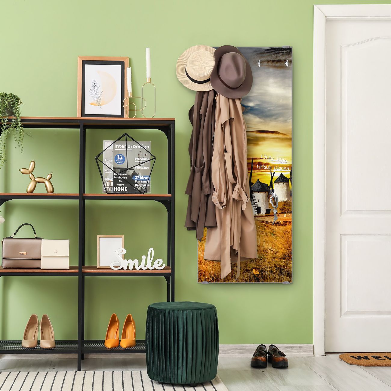FUNKTION: Die banjado Wandgarderobe mit Motiv Spanische Windmühlen ist Ihr täglicher Begleiter. Zuverlässig hängen hier Ihre Jacken und Mäntel griffbereit. Das Echtglas ist Ihr Paneel auch beschreibbar und wieder abwischbar. DESIGN: Sie erhalten eine Garderobenleiste aus elegantem Echtglas mit dem Farbbrillanten Motiv Spanische Windmühlen hinterklebt. Das Design ist zeitlos klassisch, ohne dabei auf Funktionalität zu verzichten. Suchen Sie aus einer Vielzahl von Motiven das für Ihre Einrichtung Passende aus. DETAILS: Die Flurgarderobe besteht aus 4mm gehärtetem Sicherheitsglas. Sie ist 50cm breit, 125cm hoch und 6cm tief. Die Garderobenhaken zur Selbstmontage präsentieren sich in Edelstahl-Optik, ebenso die Abstandshalter für die Wandmontage. Ihre neue Garderobe ist sofort einsatzbereit. NUTZEN: Ihre neue Garderobe hält nicht nur zuverlässig Ihre Kleidung, sie ist auch optisch ein Blickfang. Durch das Glas können Sie an der Garderobe mit wasserlöslichen Kreidestiften oder Whiteboard-Markern auch Nachrichten hinterlassen. BANJADO: Wir sind ein kleines kreatives Team aus Sachsen und entwickeln Produkte die Design und Funktionalität verbinden sollen. Viel Freude mit Ihrer neuen Garderobe wünscht das banjado-Team!