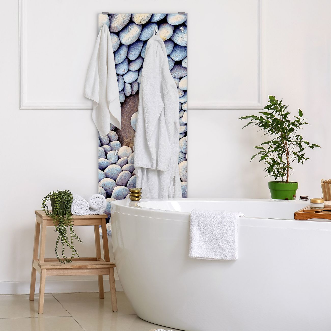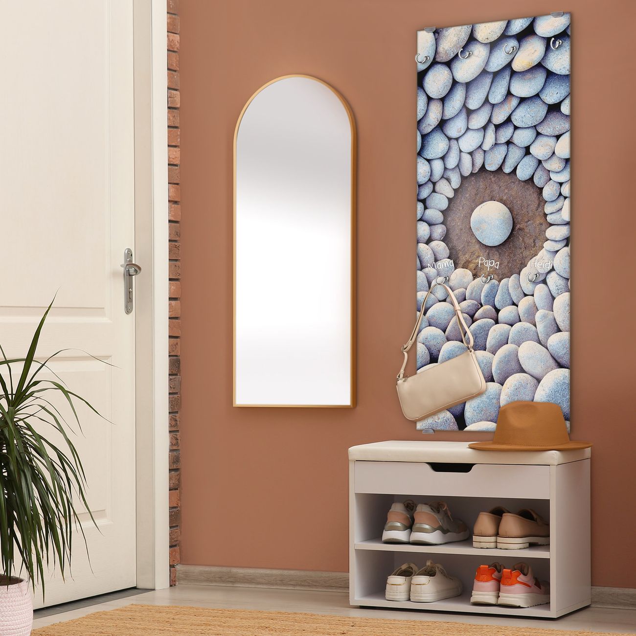 FUNKTION: Die banjado Wandgarderobe mit Motiv Steinkreis ist Ihr täglicher Begleiter. Zuverlässig hängen hier Ihre Jacken und Mäntel griffbereit. Das Echtglas ist Ihr Paneel auch beschreibbar und wieder abwischbar. DESIGN: Sie erhalten eine Garderobenleiste aus elegantem Echtglas mit dem Farbbrillanten Motiv Steinkreis hinterklebt. Das Design ist zeitlos klassisch, ohne dabei auf Funktionalität zu verzichten. Suchen Sie aus einer Vielzahl von Motiven das für Ihre Einrichtung Passende aus. DETAILS: Die Flurgarderobe besteht aus 4mm gehärtetem Sicherheitsglas. Sie ist 50cm breit, 125cm hoch und 6cm tief. Die Garderobenhaken zur Selbstmontage präsentieren sich in Edelstahl-Optik, ebenso die Abstandshalter für die Wandmontage. Ihre neue Garderobe ist sofort einsatzbereit. NUTZEN: Ihre neue Garderobe hält nicht nur zuverlässig Ihre Kleidung, sie ist auch optisch ein Blickfang. Durch das Glas können Sie an der Garderobe mit wasserlöslichen Kreidestiften oder Whiteboard-Markern auch Nachrichten hinterlassen. BANJADO: Wir sind ein kleines kreatives Team aus Sachsen und entwickeln Produkte die Design und Funktionalität verbinden sollen. Viel Freude mit Ihrer neuen Garderobe wünscht das banjado-Team!