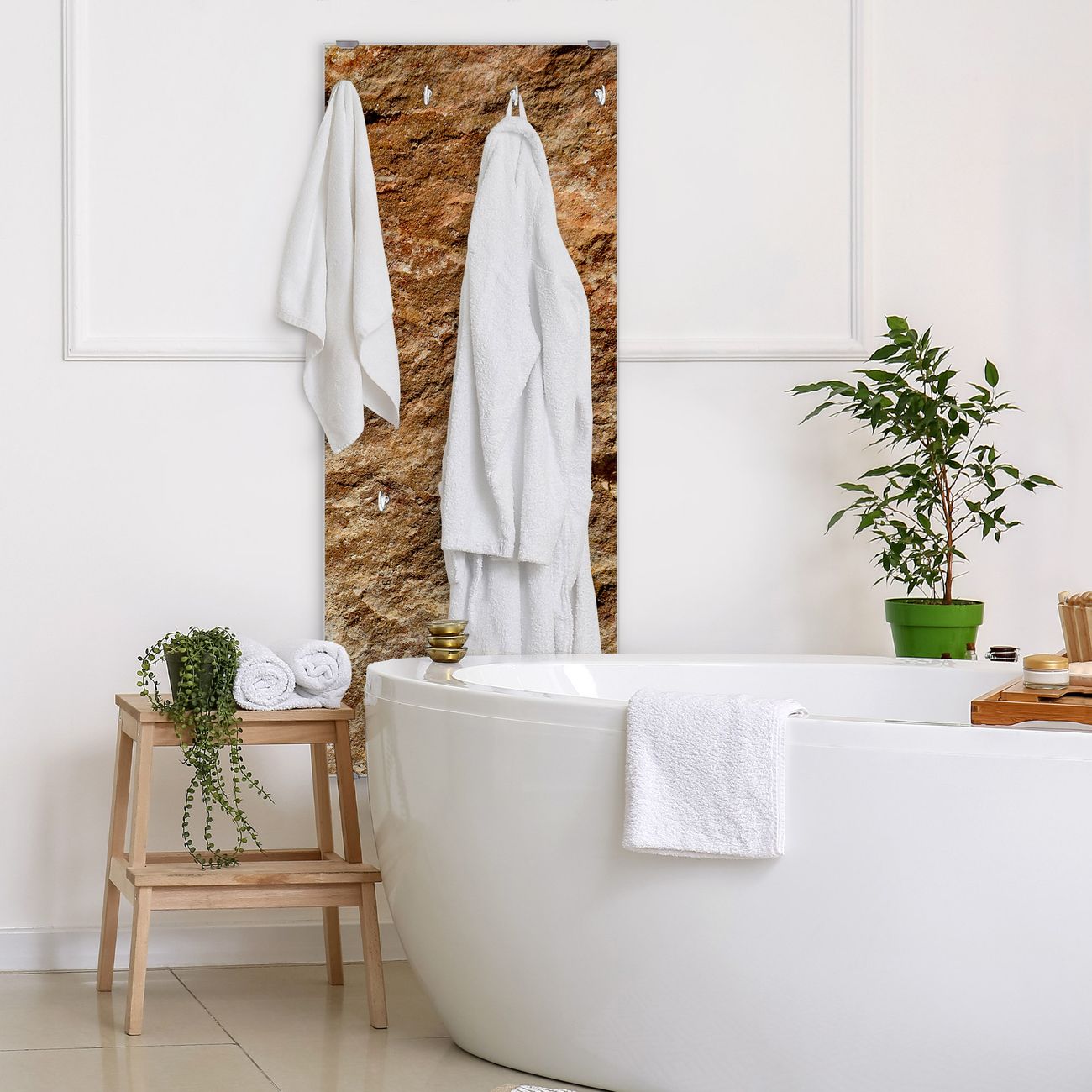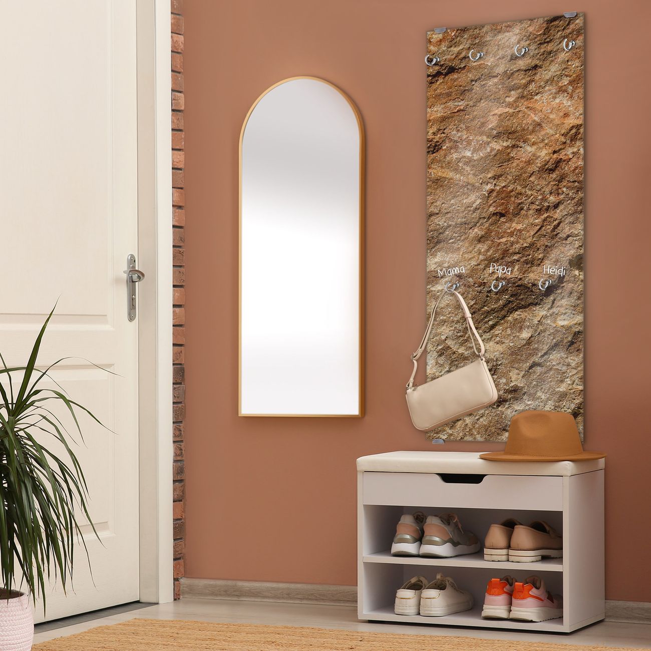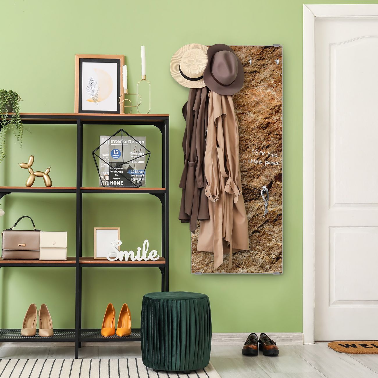 FUNKTION: Die banjado Wandgarderobe mit Motiv Steinstruktur ist Ihr täglicher Begleiter. Zuverlässig hängen hier Ihre Jacken und Mäntel griffbereit. Das Echtglas ist Ihr Paneel auch beschreibbar und wieder abwischbar. DESIGN: Sie erhalten eine Garderobenleiste aus elegantem Echtglas mit dem Farbbrillanten Motiv Steinstruktur hinterklebt. Das Design ist zeitlos klassisch, ohne dabei auf Funktionalität zu verzichten. Suchen Sie aus einer Vielzahl von Motiven das für Ihre Einrichtung Passende aus. DETAILS: Die Flurgarderobe besteht aus 4mm gehärtetem Sicherheitsglas. Sie ist 50cm breit, 125cm hoch und 6cm tief. Die Garderobenhaken zur Selbstmontage präsentieren sich in Edelstahl-Optik, ebenso die Abstandshalter für die Wandmontage. Ihre neue Garderobe ist sofort einsatzbereit. NUTZEN: Ihre neue Garderobe hält nicht nur zuverlässig Ihre Kleidung, sie ist auch optisch ein Blickfang. Durch das Glas können Sie an der Garderobe mit wasserlöslichen Kreidestiften oder Whiteboard-Markern auch Nachrichten hinterlassen. BANJADO: Wir sind ein kleines kreatives Team aus Sachsen und entwickeln Produkte die Design und Funktionalität verbinden sollen. Viel Freude mit Ihrer neuen Garderobe wünscht das banjado-Team!
