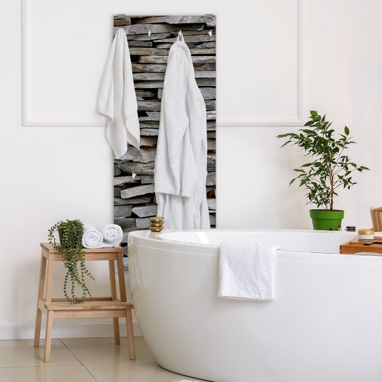 FUNKTION: Die banjado Wandgarderobe mit Motiv Steinwand ist Ihr täglicher Begleiter. Zuverlässig hängen hier Ihre Jacken und Mäntel griffbereit. Das Echtglas ist Ihr Paneel auch beschreibbar und wieder abwischbar. DESIGN: Sie erhalten eine Garderobenleiste aus elegantem Echtglas mit dem Farbbrillanten Motiv Steinwand hinterklebt. Das Design ist zeitlos klassisch, ohne dabei auf Funktionalität zu verzichten. Suchen Sie aus einer Vielzahl von Motiven das für Ihre Einrichtung Passende aus. DETAILS: Die Flurgarderobe besteht aus 4mm gehärtetem Sicherheitsglas. Sie ist 50cm breit, 125cm hoch und 6cm tief. Die Garderobenhaken zur Selbstmontage präsentieren sich in Edelstahl-Optik, ebenso die Abstandshalter für die Wandmontage. Ihre neue Garderobe ist sofort einsatzbereit. NUTZEN: Ihre neue Garderobe hält nicht nur zuverlässig Ihre Kleidung, sie ist auch optisch ein Blickfang. Durch das Glas können Sie an der Garderobe mit wasserlöslichen Kreidestiften oder Whiteboard-Markern auch Nachrichten hinterlassen. BANJADO: Wir sind ein kleines kreatives Team aus Sachsen und entwickeln Produkte die Design und Funktionalität verbinden sollen. Viel Freude mit Ihrer neuen Garderobe wünscht das banjado-Team!