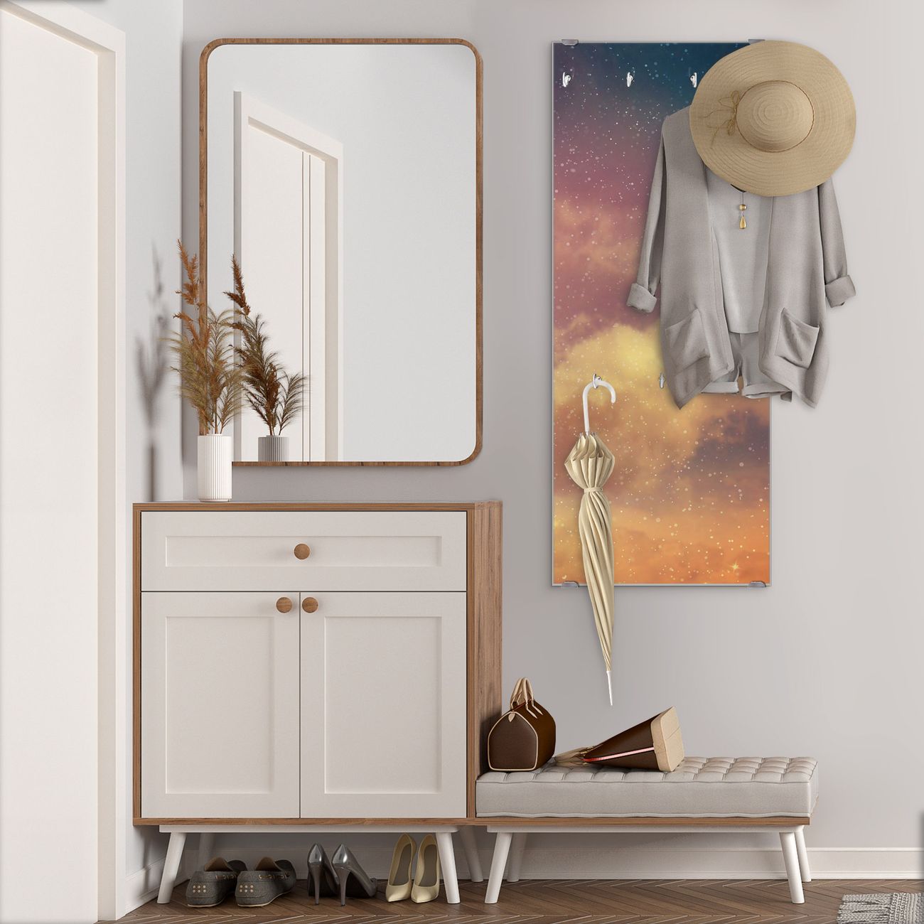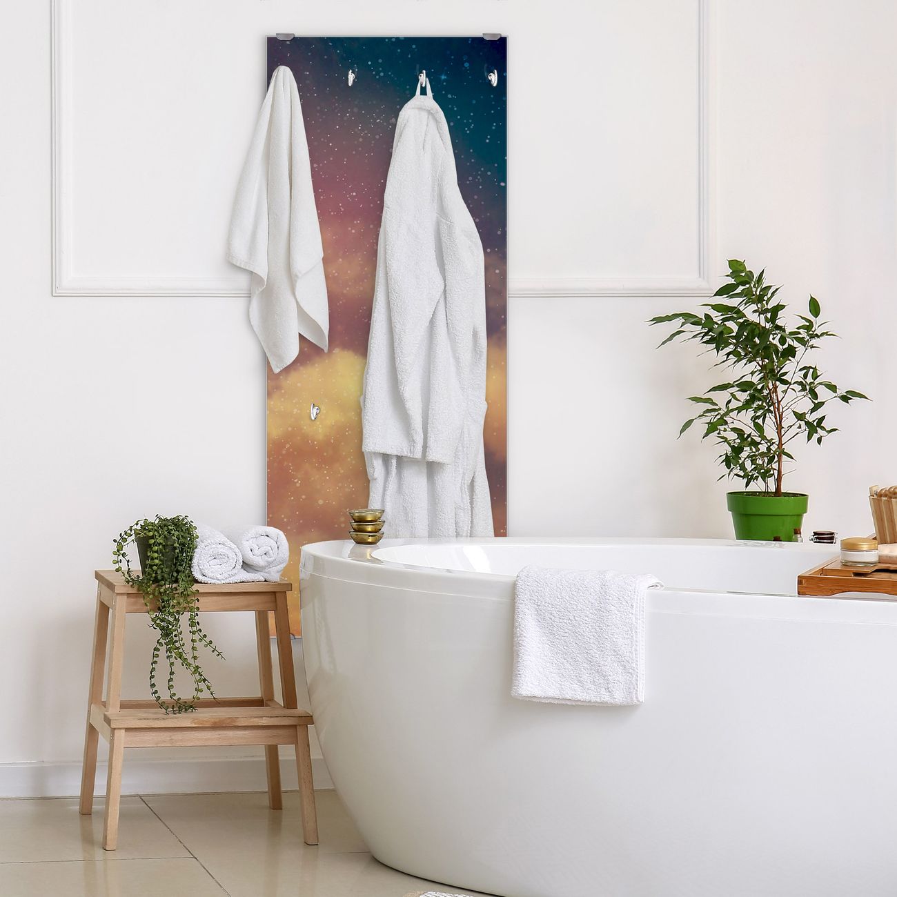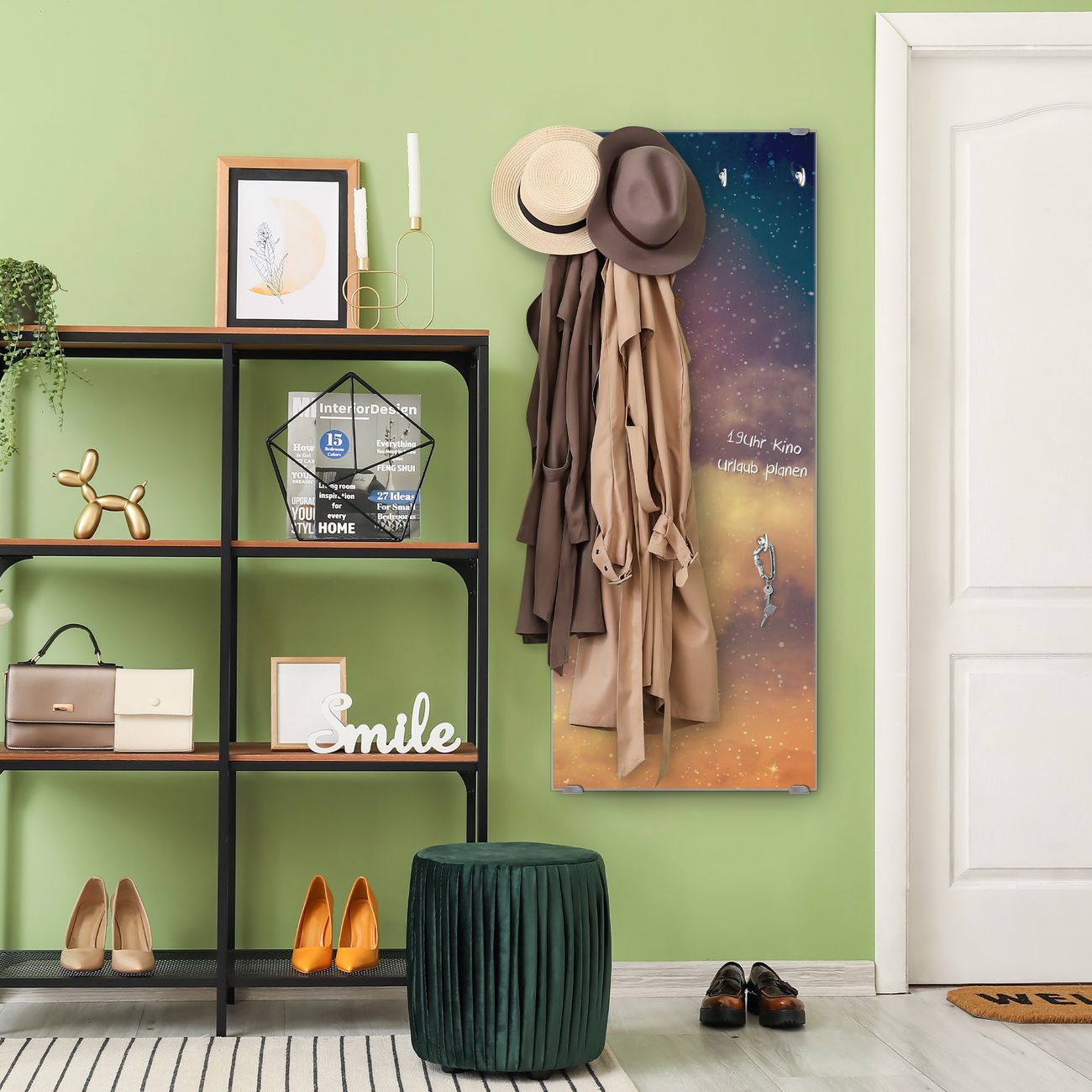 FUNKTION: Die banjado Wandgarderobe mit Motiv Sternenhimmel ist Ihr täglicher Begleiter. Zuverlässig hängen hier Ihre Jacken und Mäntel griffbereit. Das Echtglas ist Ihr Paneel auch beschreibbar und wieder abwischbar. DESIGN: Sie erhalten eine Garderobenleiste aus elegantem Echtglas mit dem Farbbrillanten Motiv Sternenhimmel hinterklebt. Das Design ist zeitlos klassisch, ohne dabei auf Funktionalität zu verzichten. Suchen Sie aus einer Vielzahl von Motiven das für Ihre Einrichtung Passende aus. DETAILS: Die Flurgarderobe besteht aus 4mm gehärtetem Sicherheitsglas. Sie ist 50cm breit, 125cm hoch und 6cm tief. Die Garderobenhaken zur Selbstmontage präsentieren sich in Edelstahl-Optik, ebenso die Abstandshalter für die Wandmontage. Ihre neue Garderobe ist sofort einsatzbereit. NUTZEN: Ihre neue Garderobe hält nicht nur zuverlässig Ihre Kleidung, sie ist auch optisch ein Blickfang. Durch das Glas können Sie an der Garderobe mit wasserlöslichen Kreidestiften oder Whiteboard-Markern auch Nachrichten hinterlassen. BANJADO: Wir sind ein kleines kreatives Team aus Sachsen und entwickeln Produkte die Design und Funktionalität verbinden sollen. Viel Freude mit Ihrer neuen Garderobe wünscht das banjado-Team!